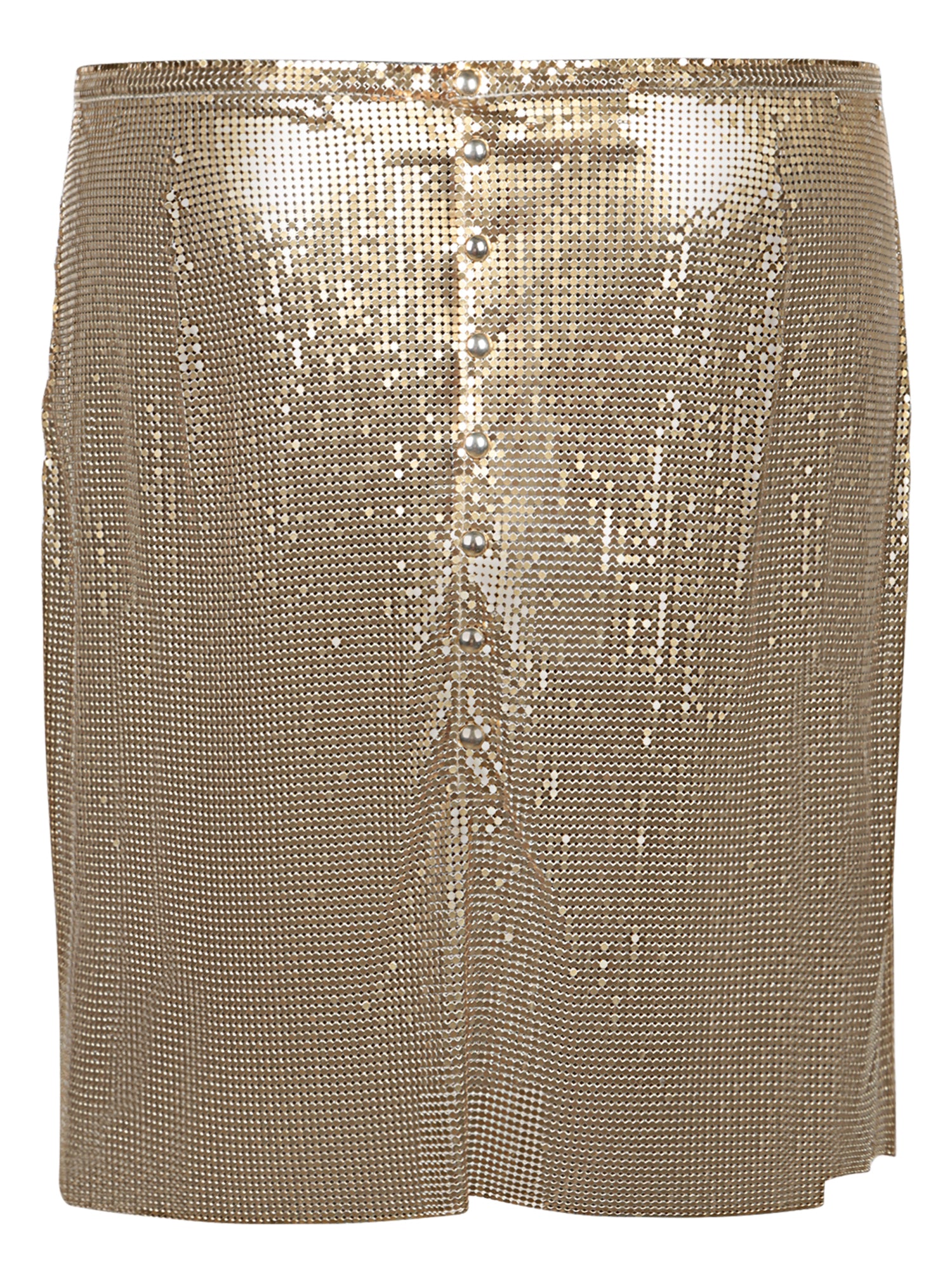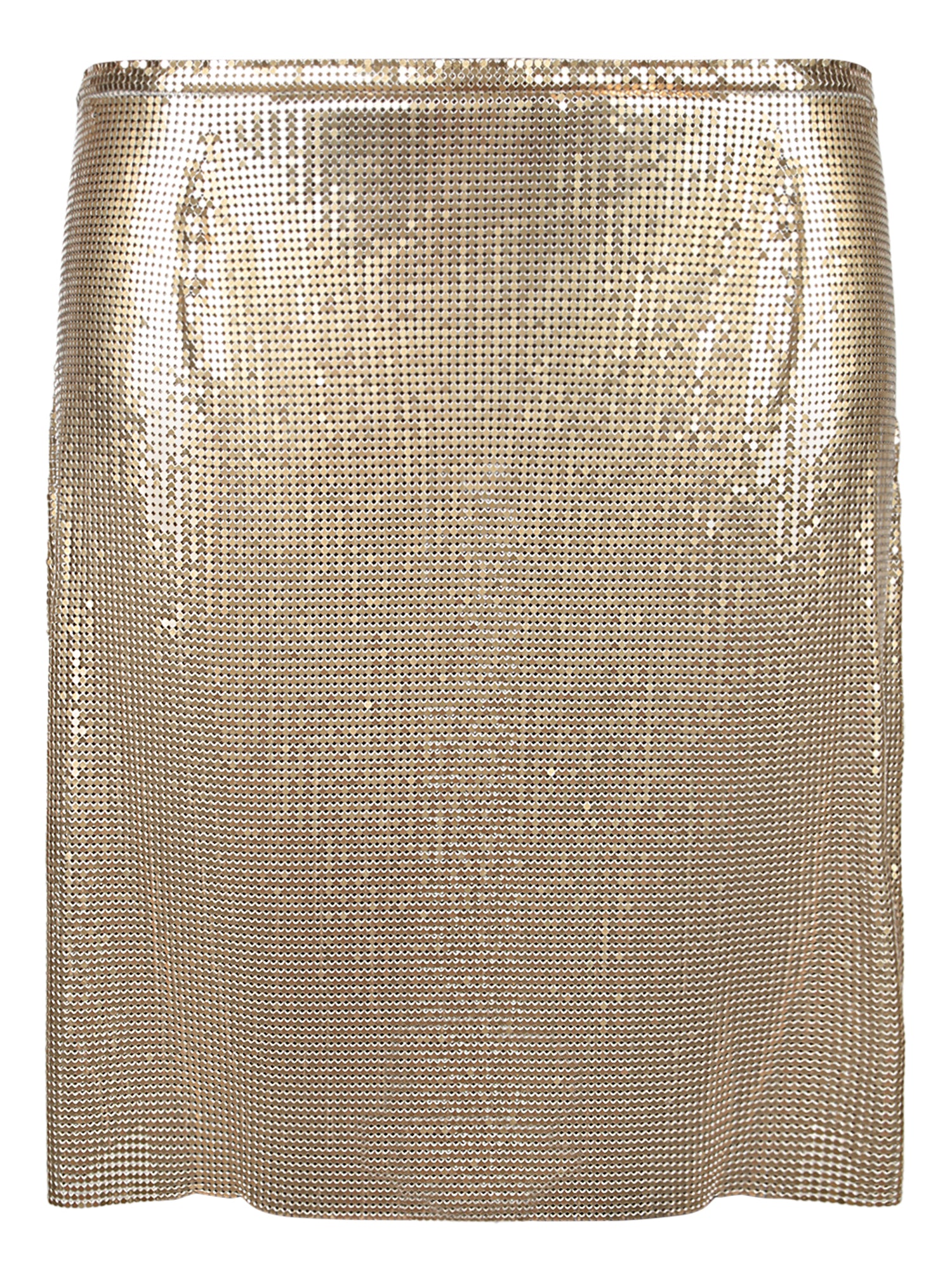 This PACO RABANNE mini mesh skirt epitomizes modern opulence with its shimmering gold texture that catches the light with every move. Its clean and simple silhouette makes it a versatile piece for evening ensembles.