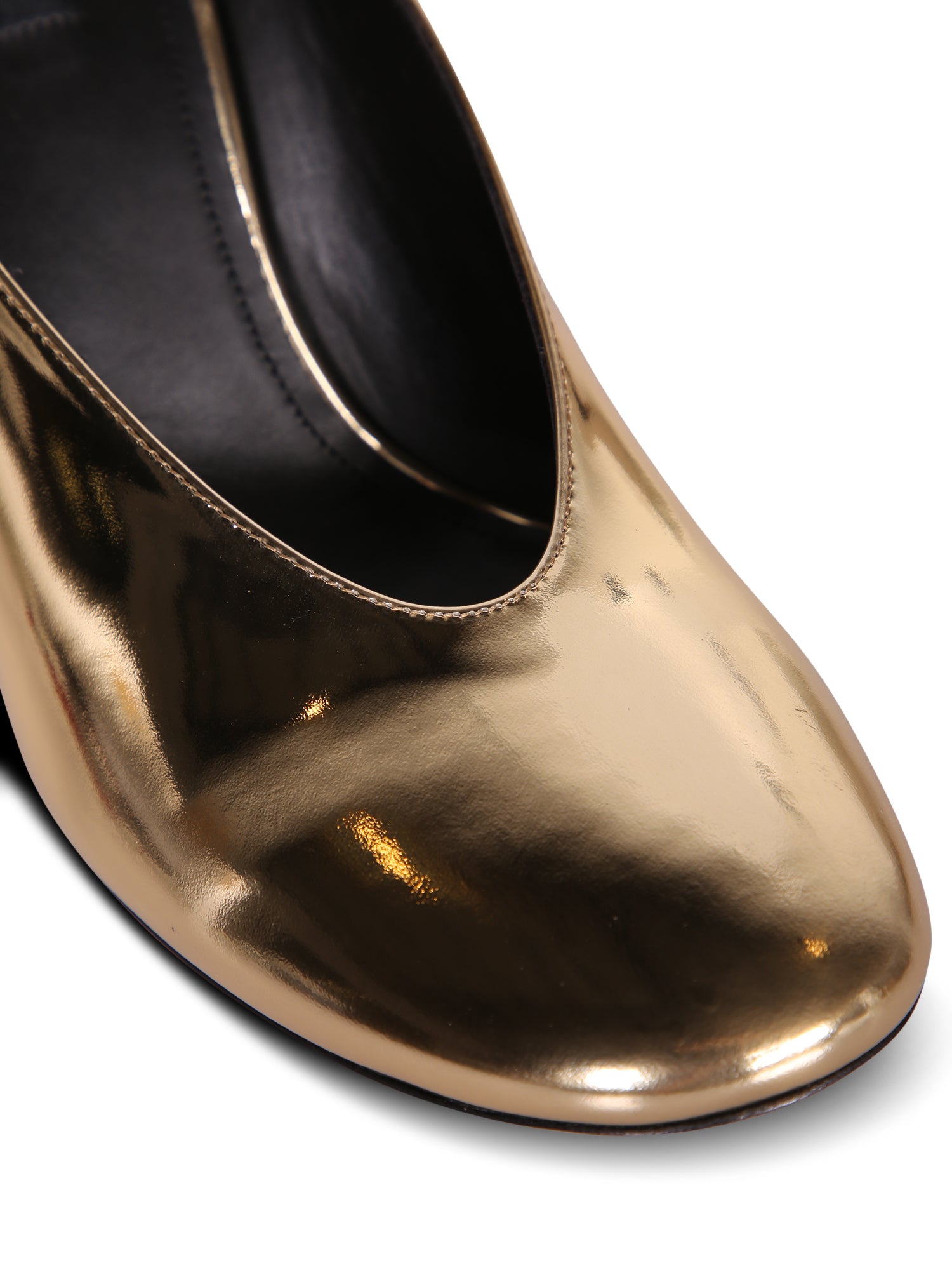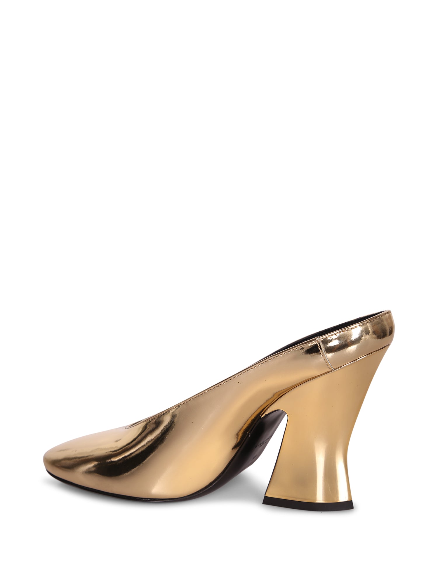 Mule with contrasting sculptural heel, closed toe, metallic finish.