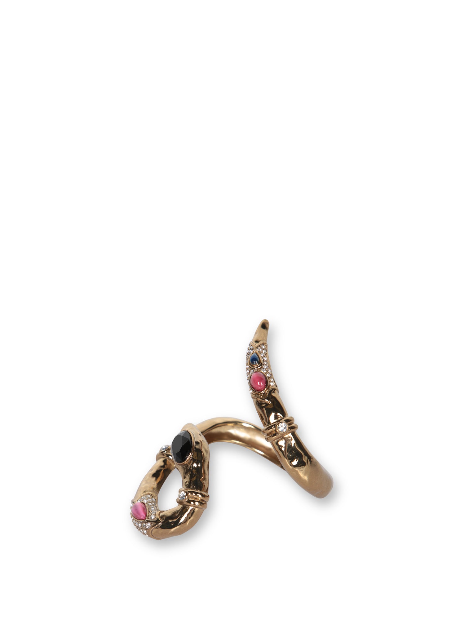 Gold-tone metal bracelet featuring a snake design. Embedded with crystals and colored gems.