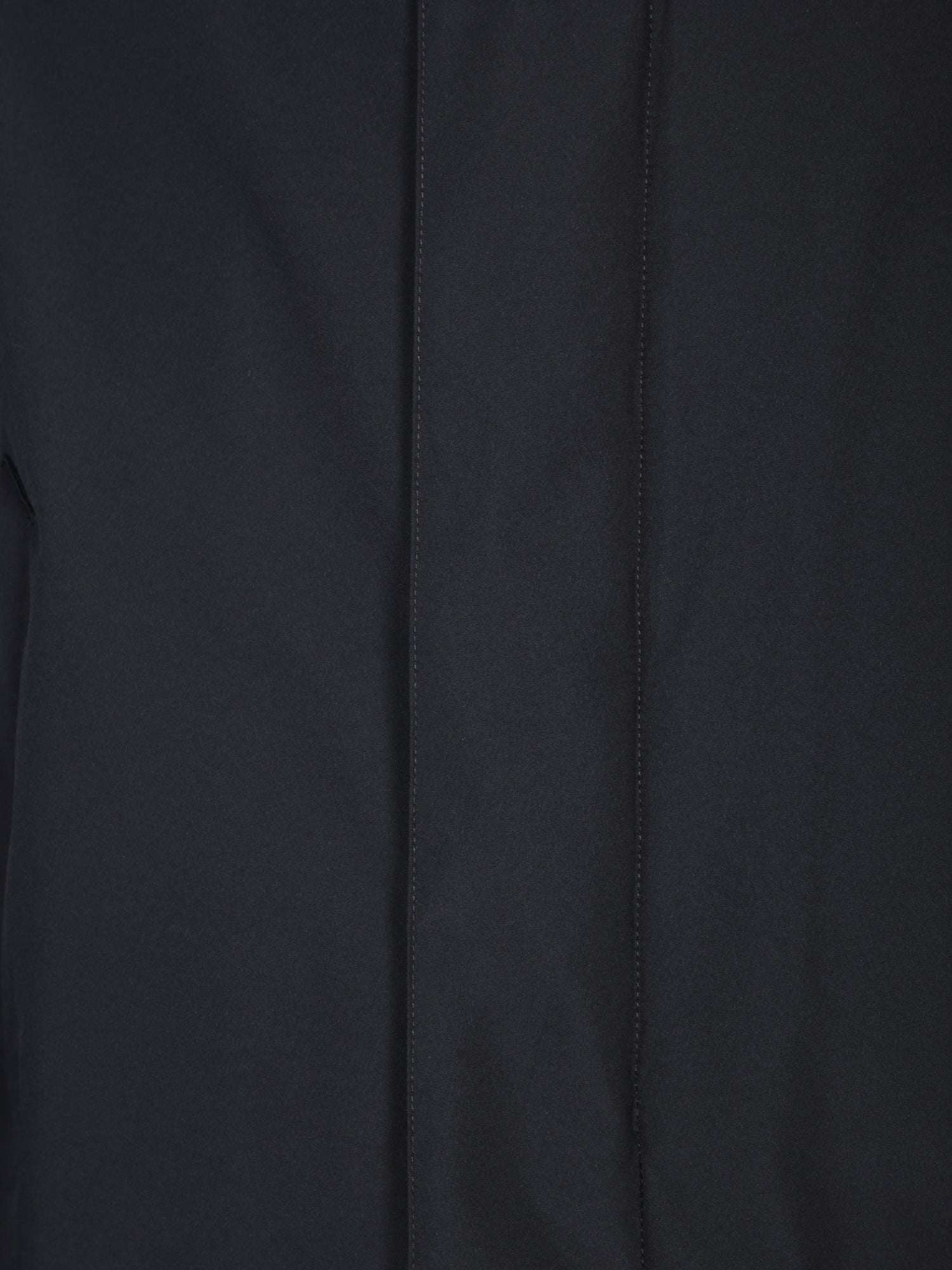 Three-quarter coat with concealed zipper and snap buttons. Adjustable collar with foldable hood. Flap side pockets.