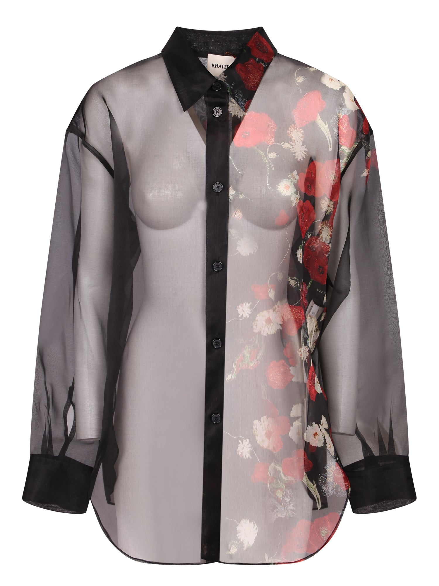 Transparent organza shirt with floral print. Classic collar and button closure.