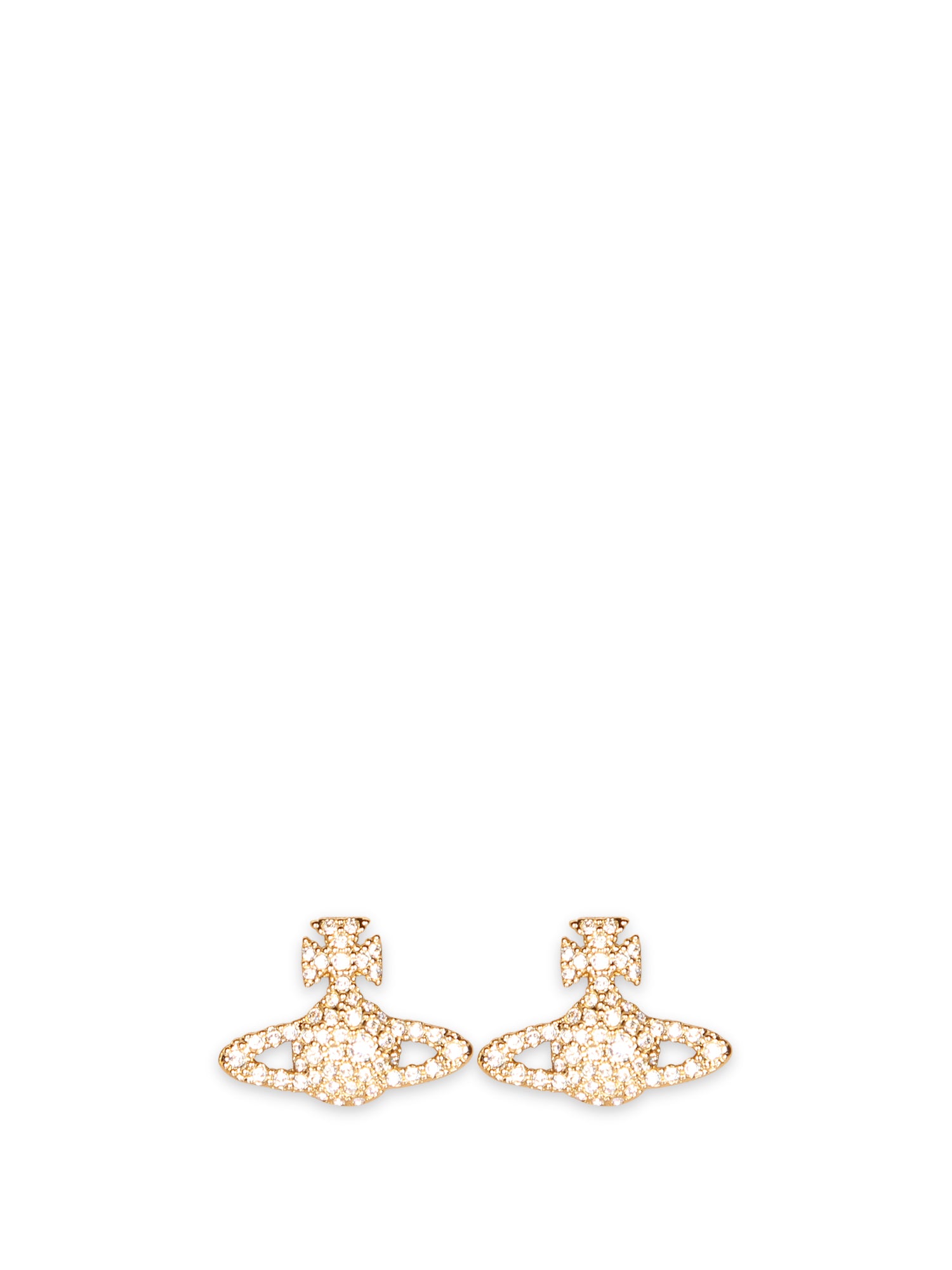Earrings with embedded crystals. Gold-toned metal alloy base. Orb-shaped design.