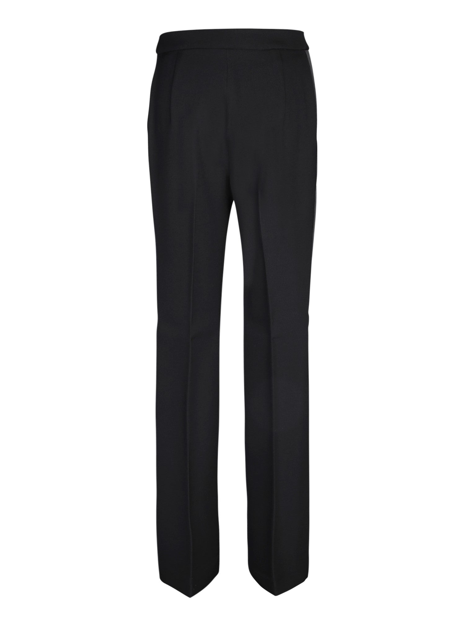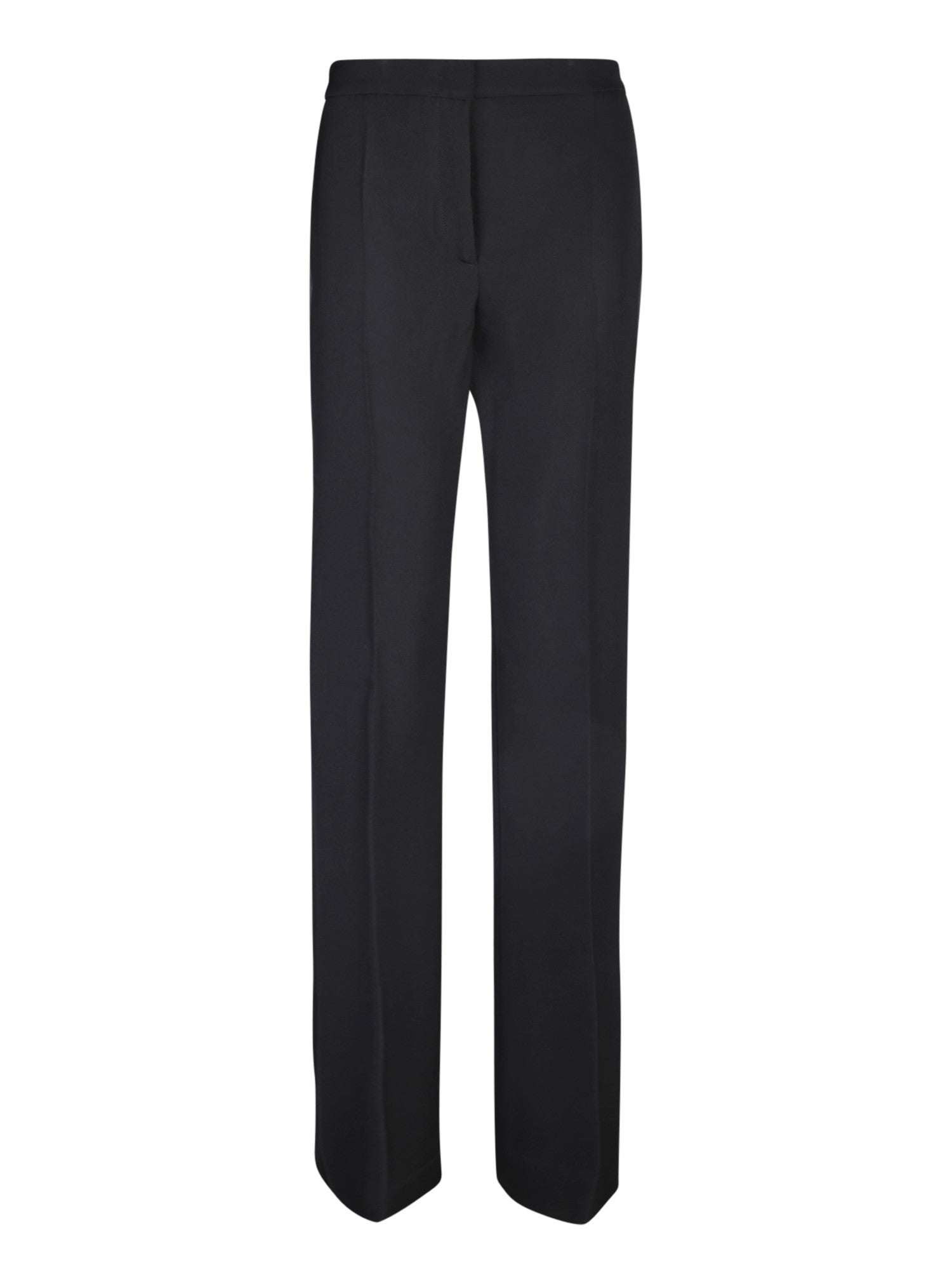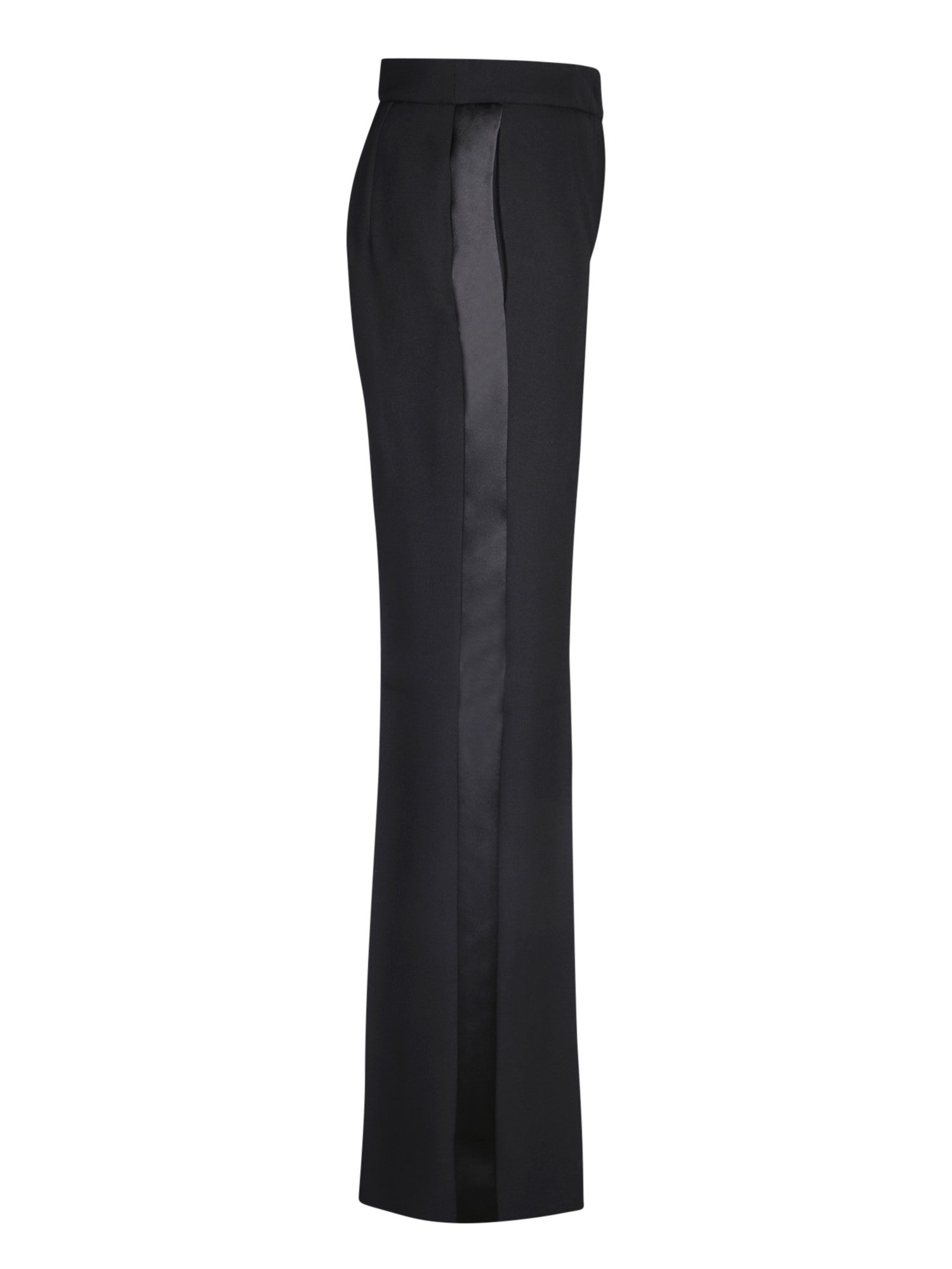 High waist. Concealed front fastening. Wide leg. Two rear welt pockets. Color: black