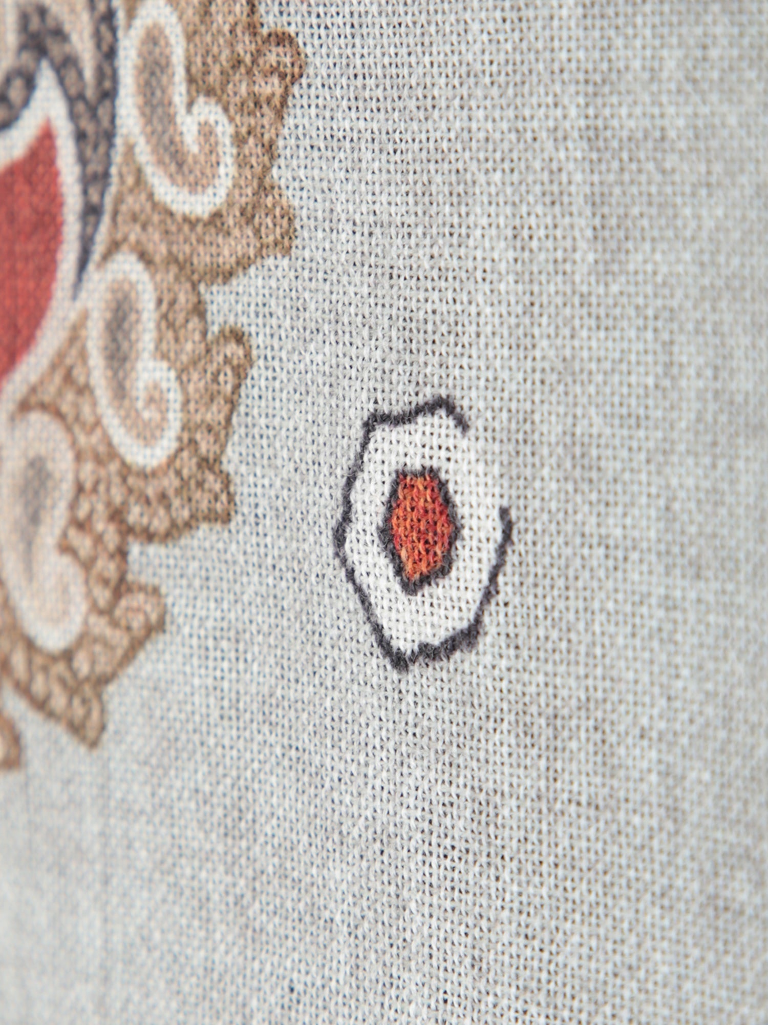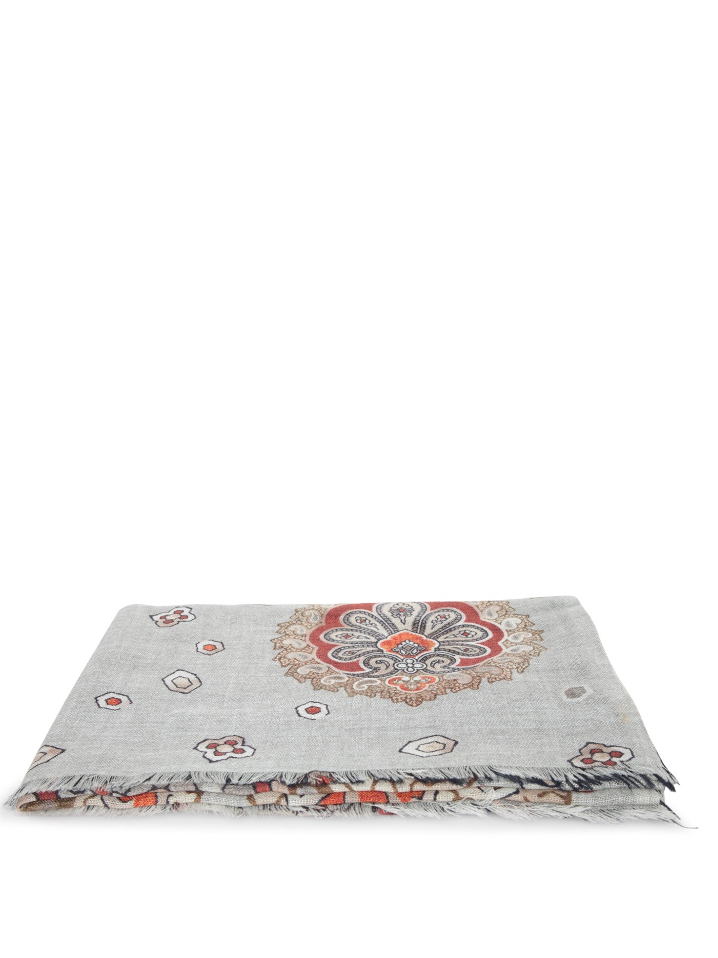 Wool scarf featuring ornamental details and frayed fringes. Dimensions: 65x185 cm.
