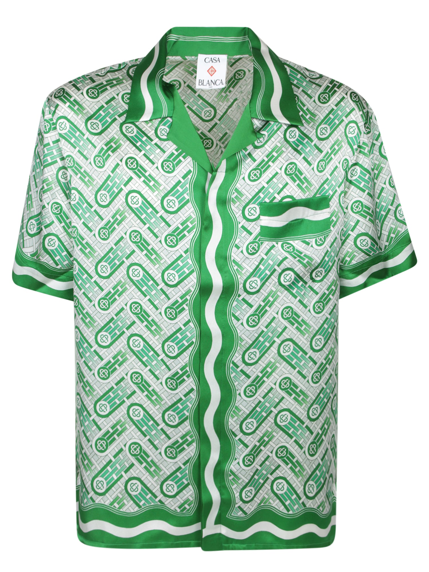 This Casablanca green shirt exudes casual elegance with a sporty twist. Crafted from fine silk, it features a playful graphic motif and striped details defining the collar and sleeve edges.
