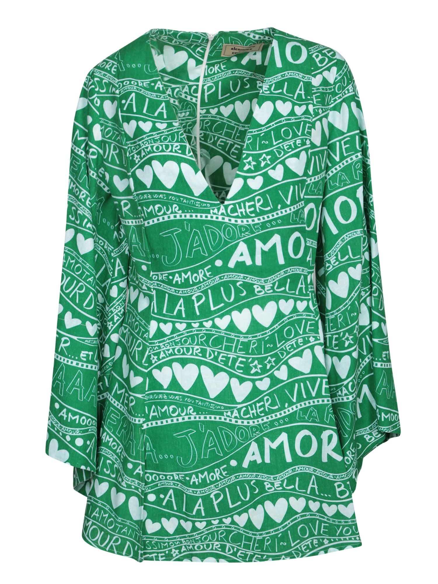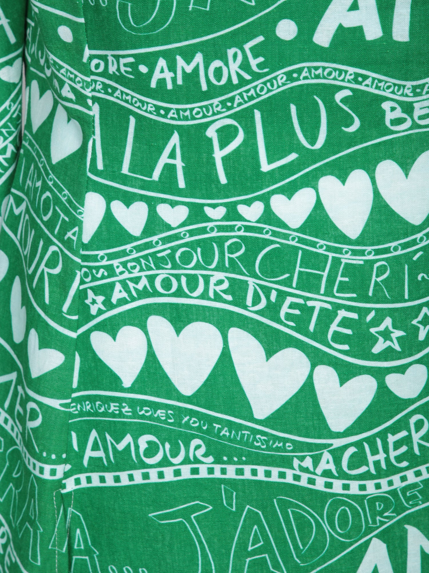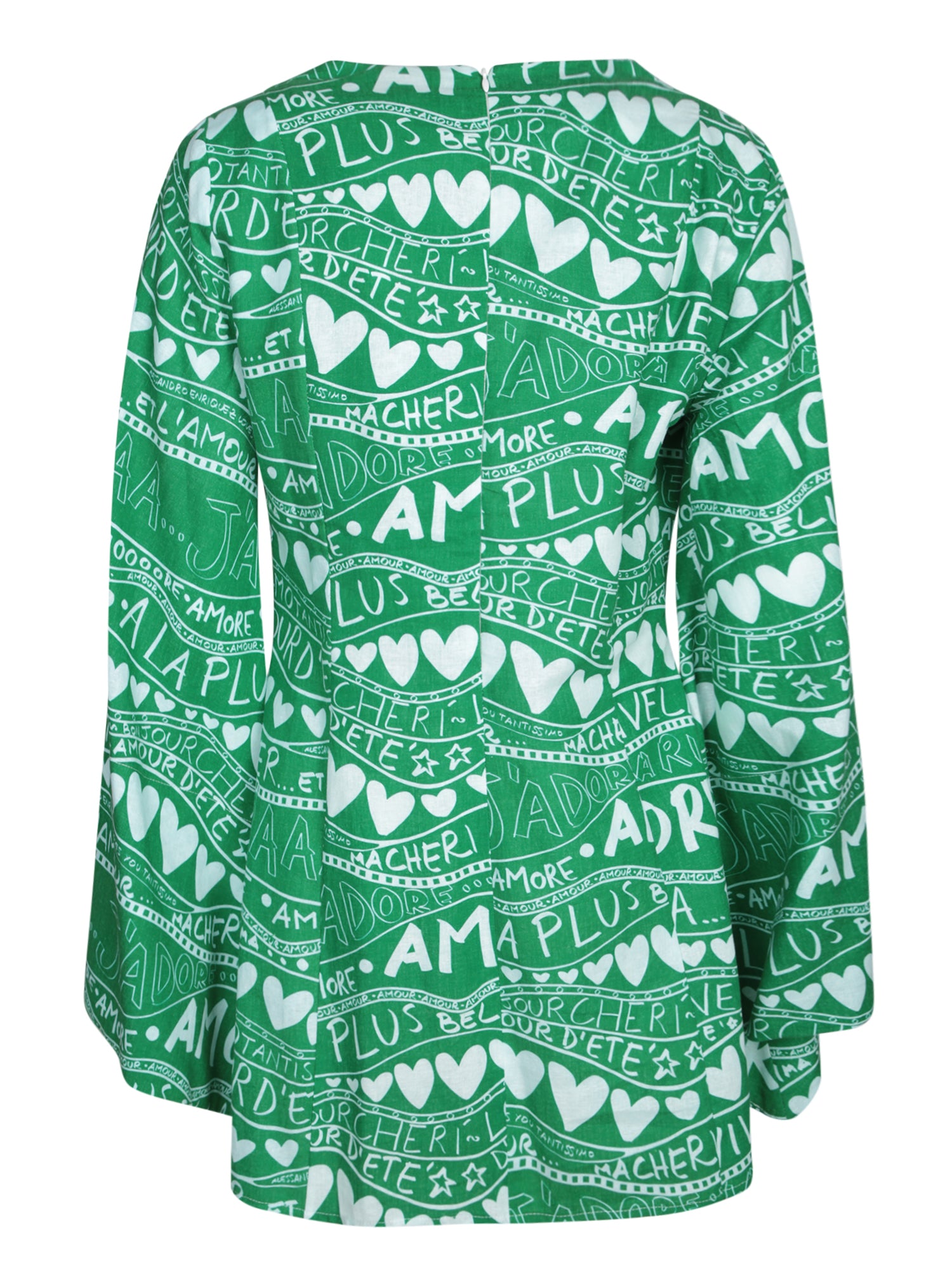 Green dress with long sleeves, wave and heart pattern, V-neckline.