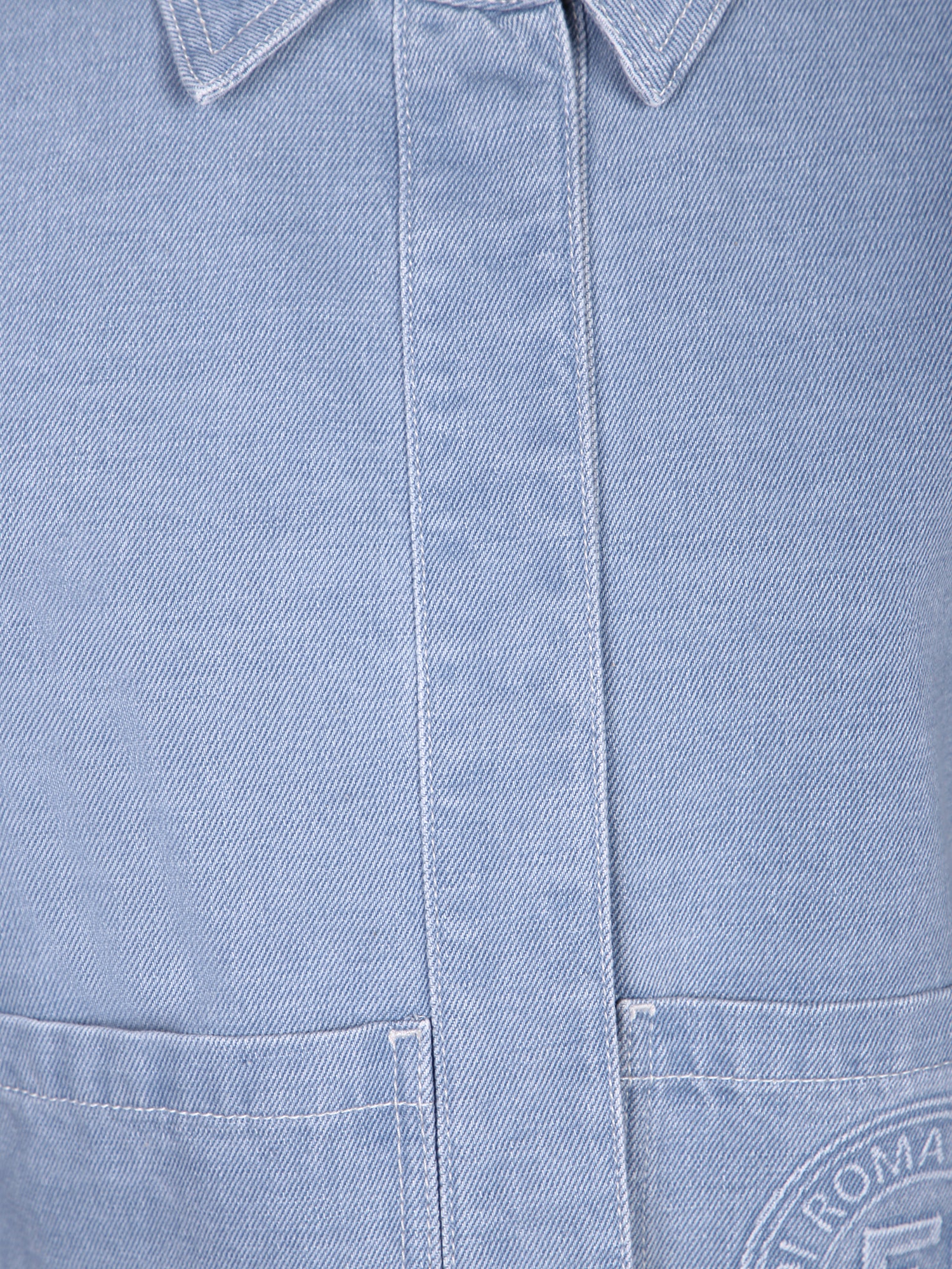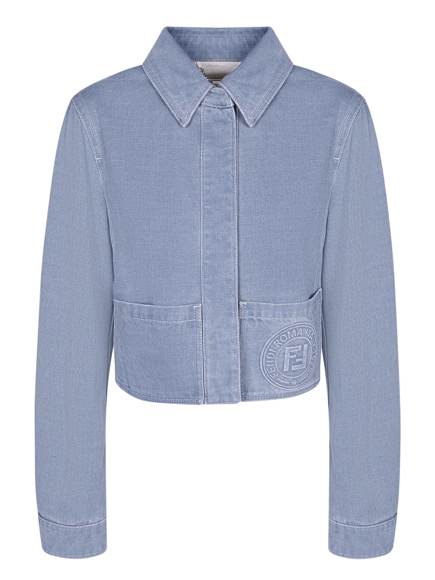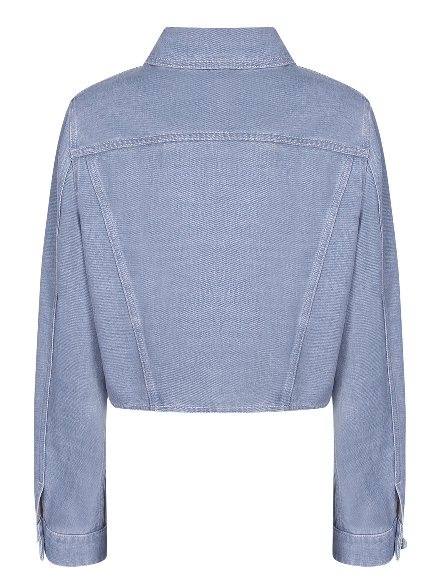 Grey denim jacket with a cropped cut. Features a classic collar and button front closure.