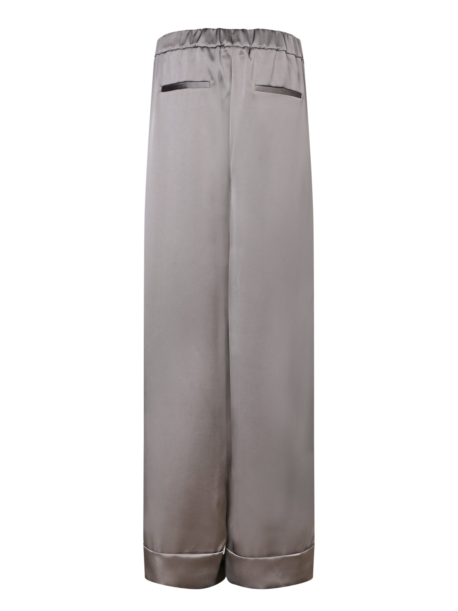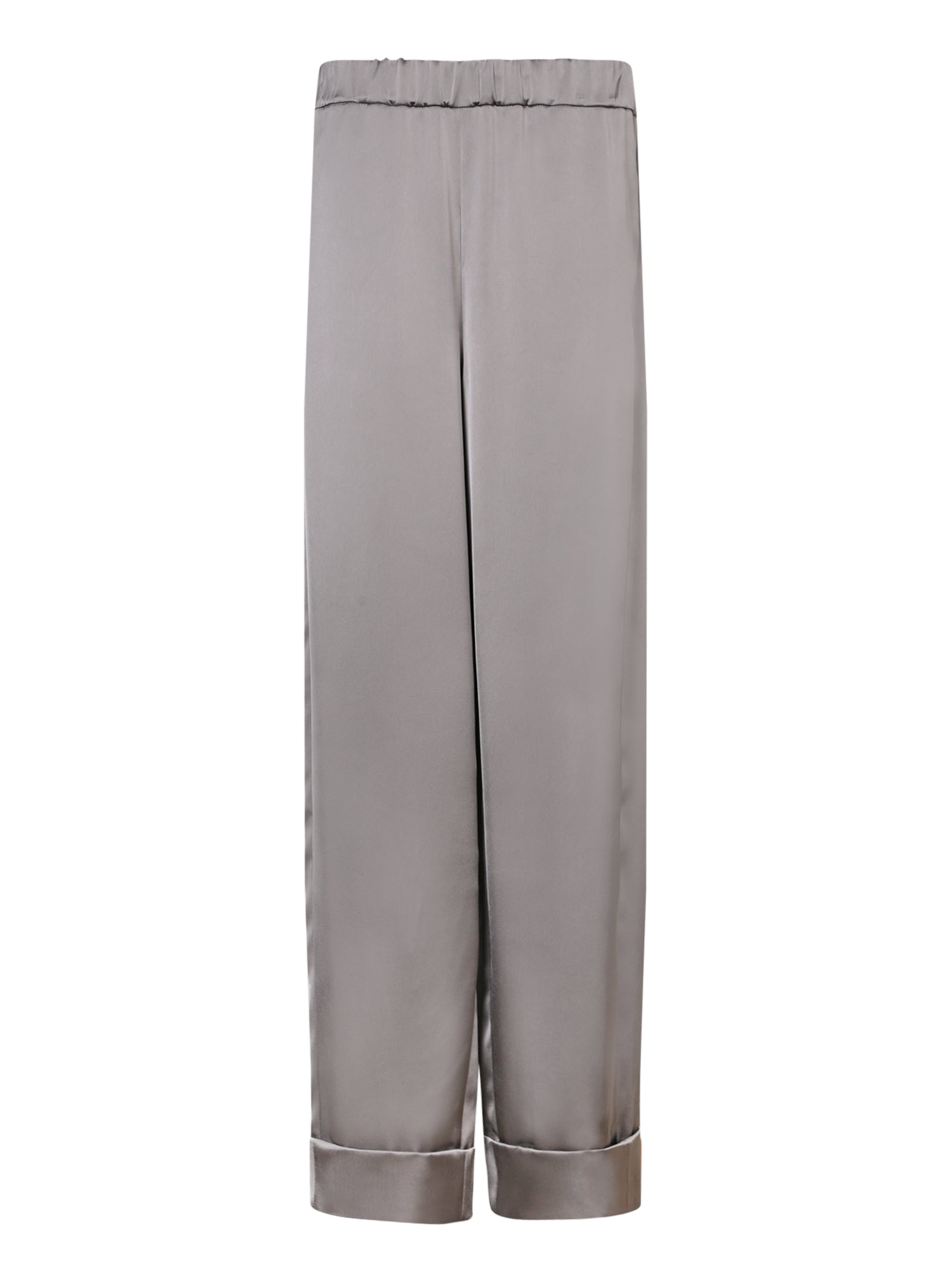 Elegant grey satin trousers with elastic waistband and cuffed hems.