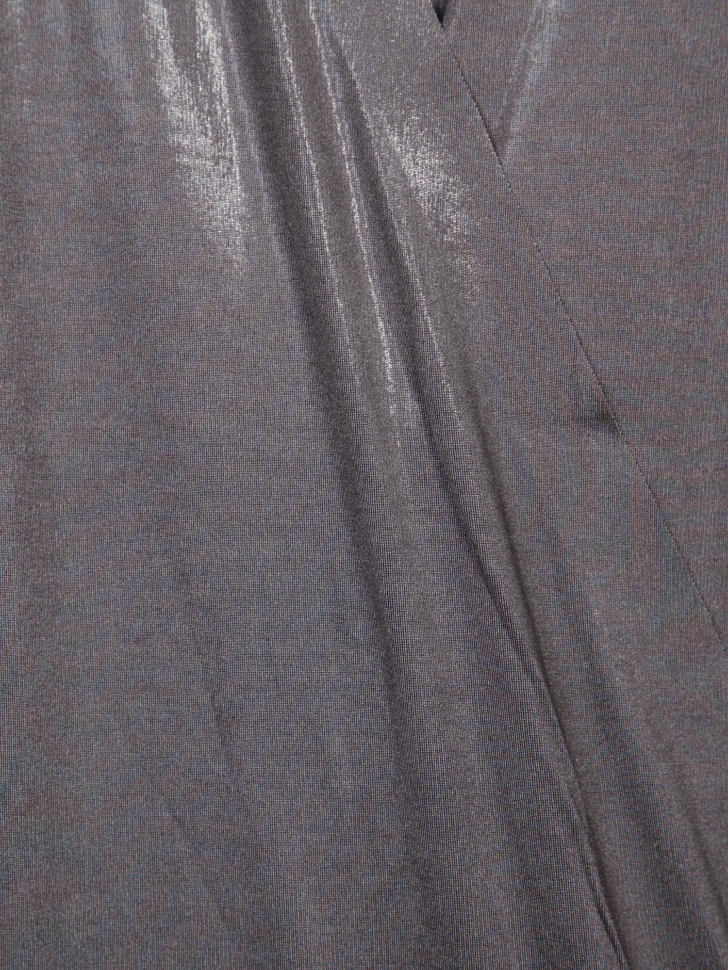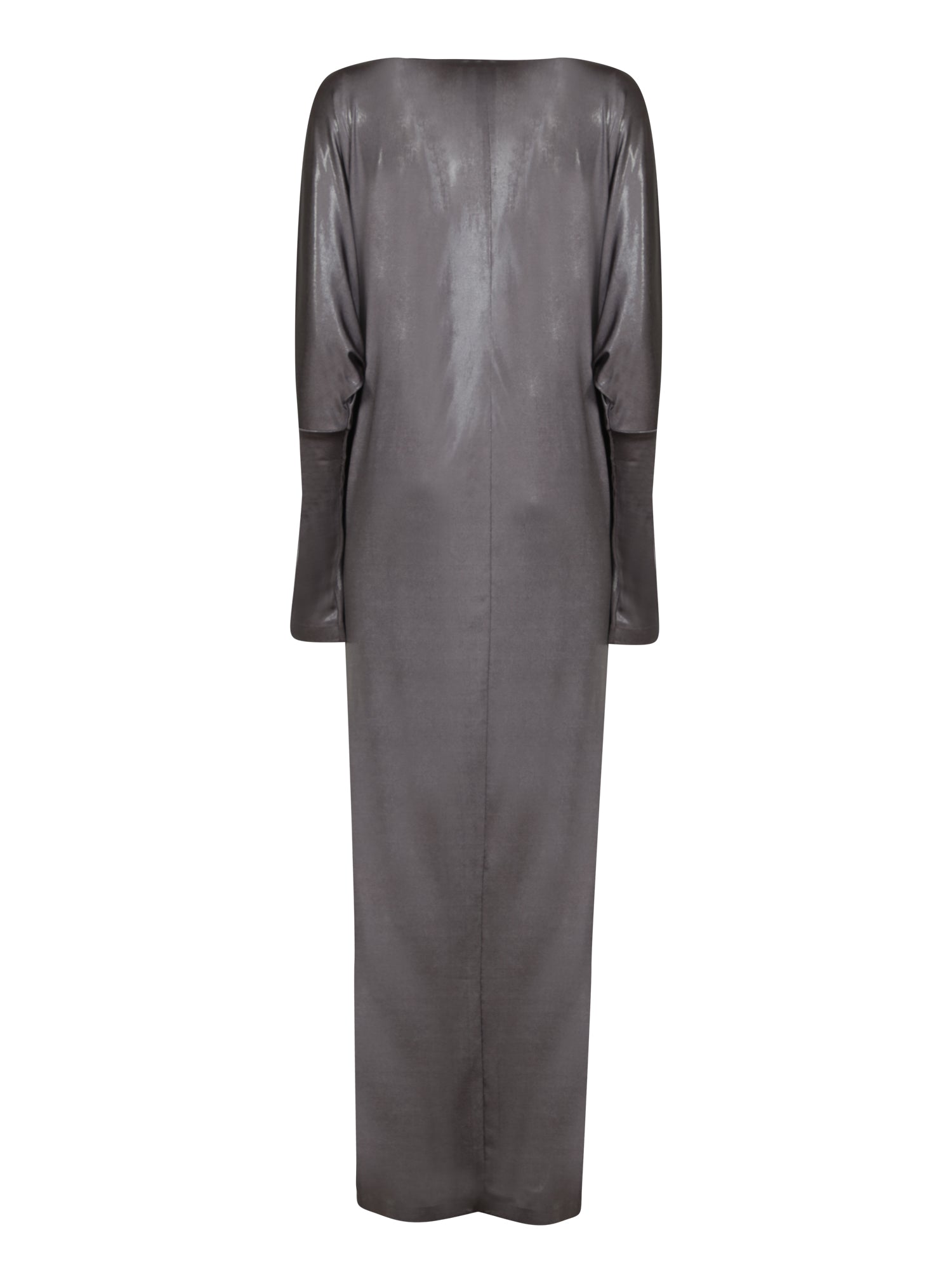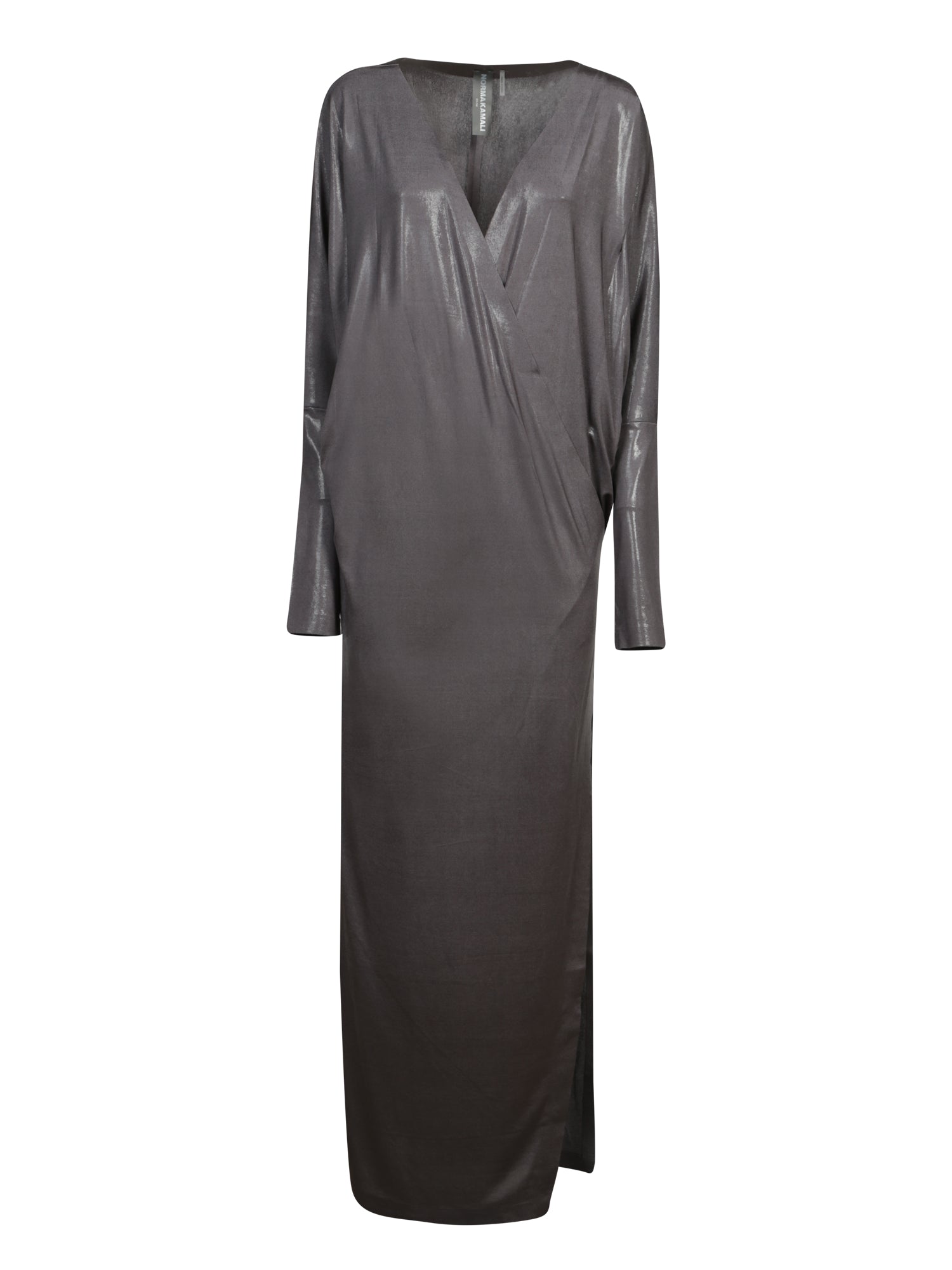 Sophisticated and modern, this grey dress from Norma Kamali enhances the silhouette with its wrap design. Perfect for evening events, the shiny fabric adds a touch of elegance.