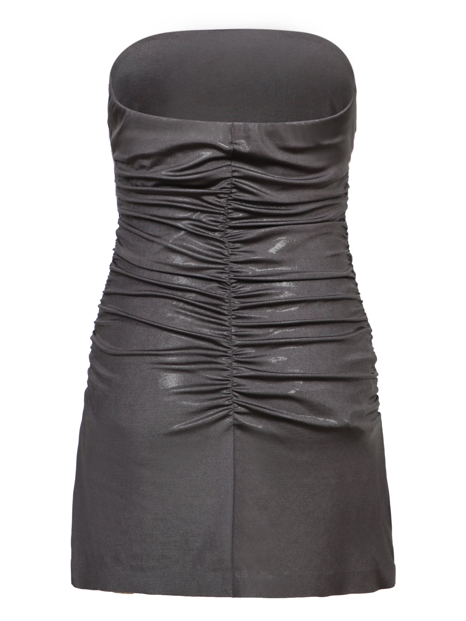 This Norma Kamali mini dress embodies modern elegance with its shimmering fabric that hugs the figure and ruched details that accentuate curves.