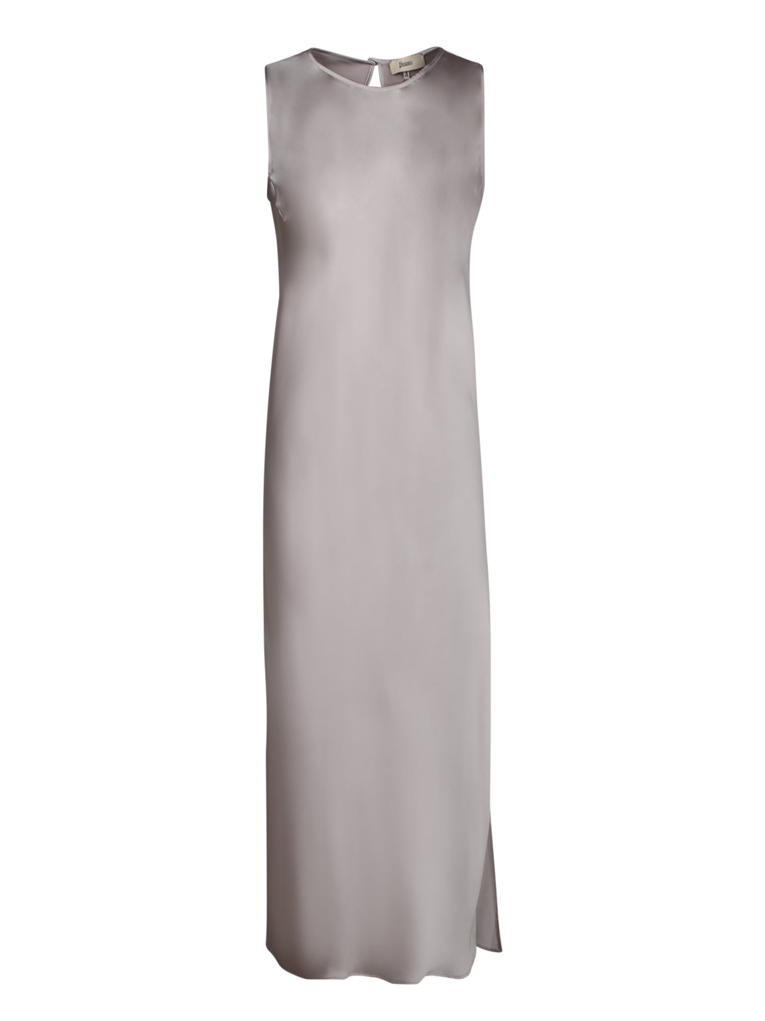 Sleeveless midi model. Glossy satin fabric. Crew neck.