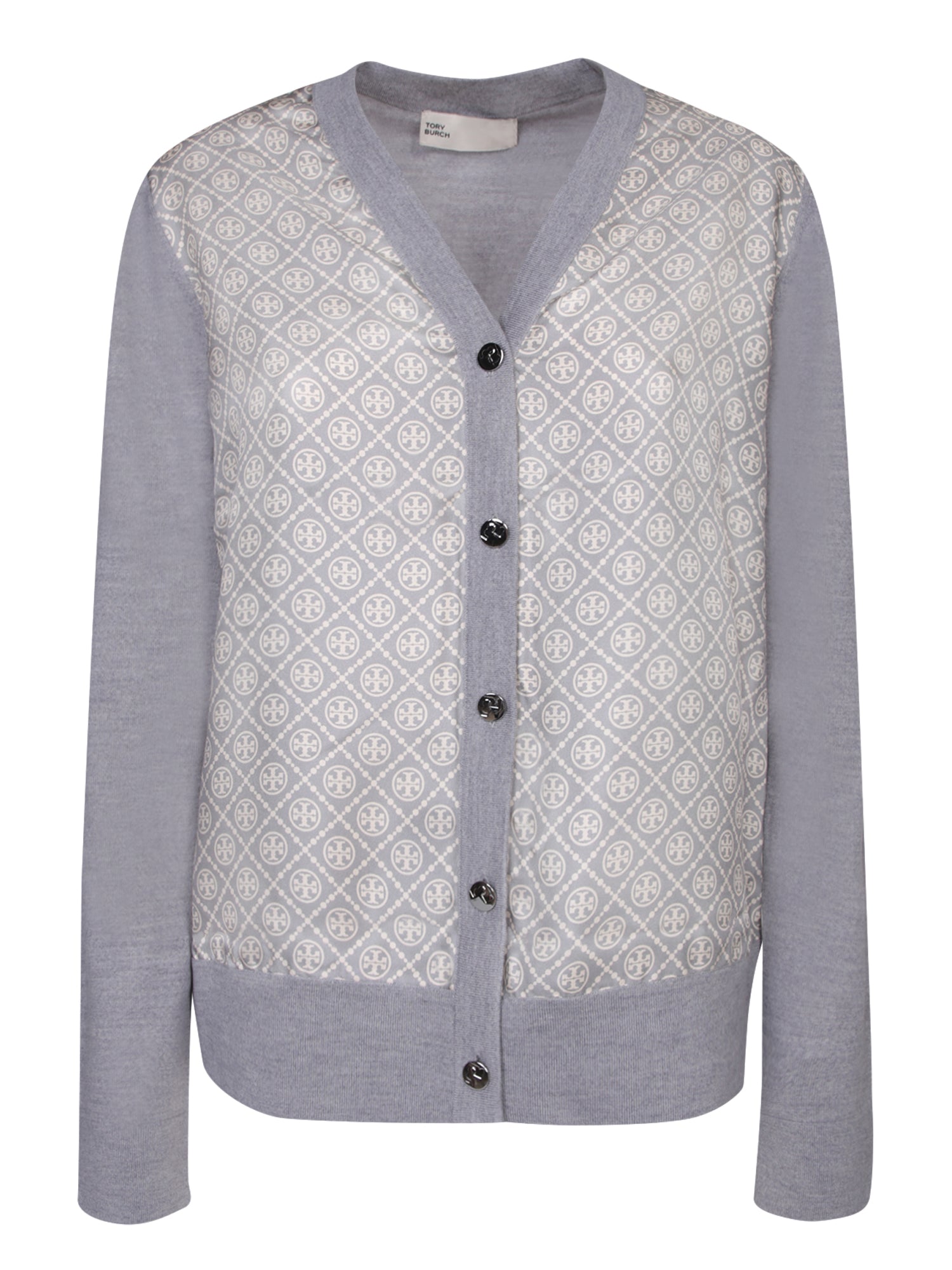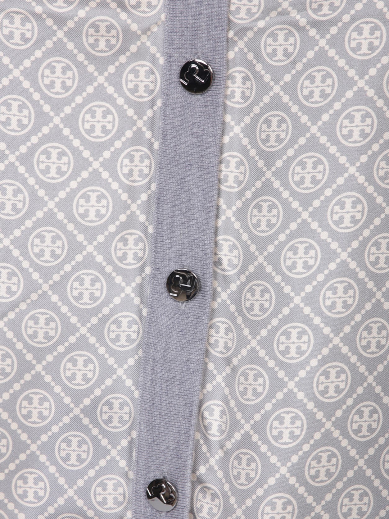 Crafted in luxurious silk knit, this elegant Tory Burch cardigan features an exclusive monogrammed design. With a soft fit and button closure, it's perfect for adding a touch of class to any outfit.