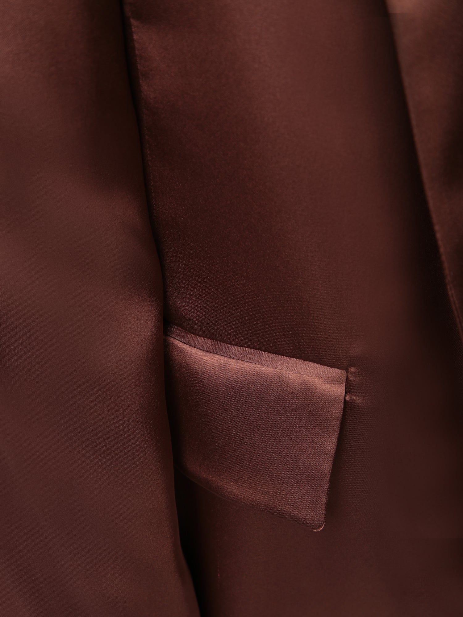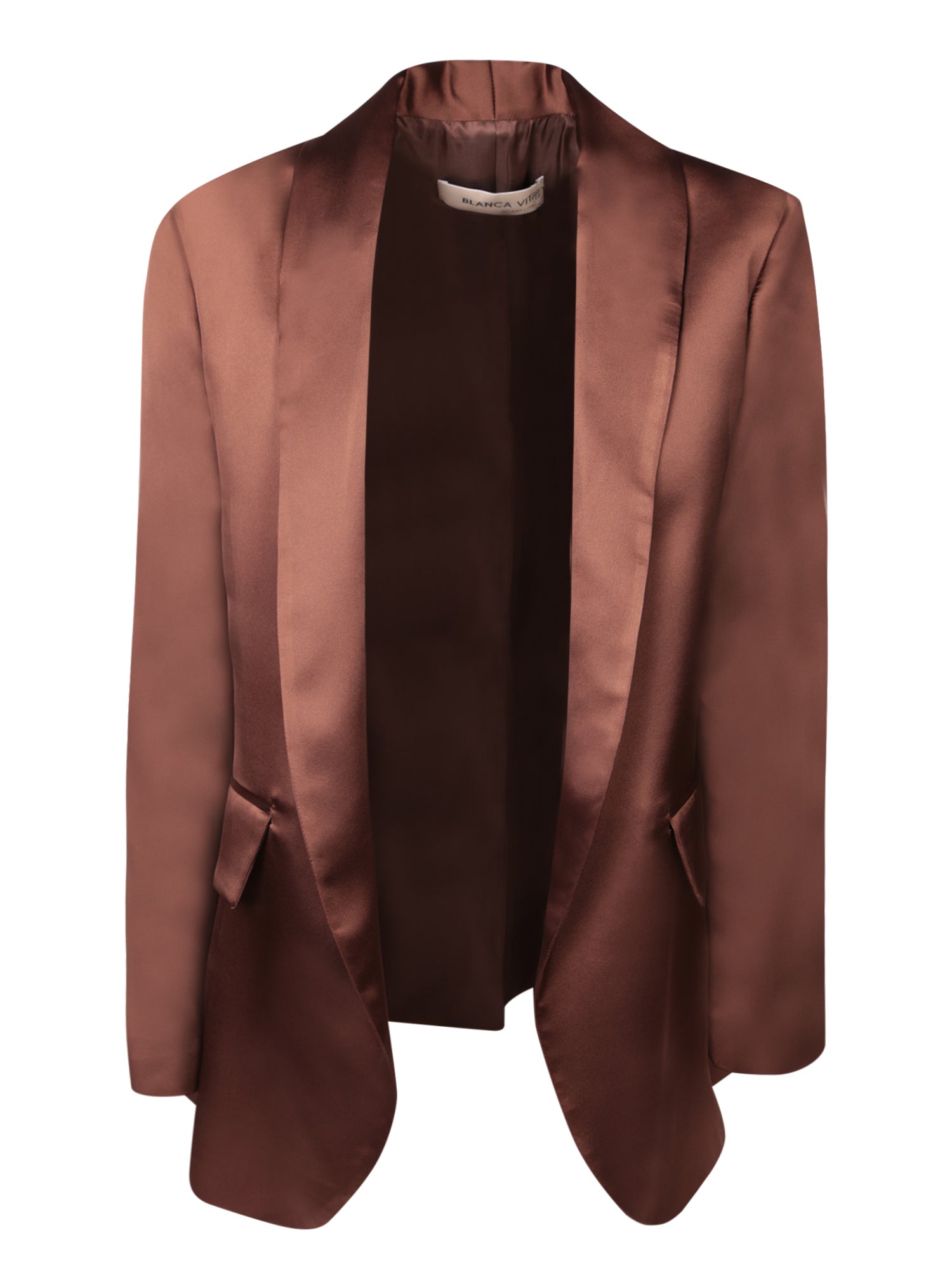 Shawl lapels. Single-breasted. No fastening. Long sleeves. Two side flap pockets. Rear slit. Tone-on-tone stitching. Regular fit. Curved hem. Color: brown