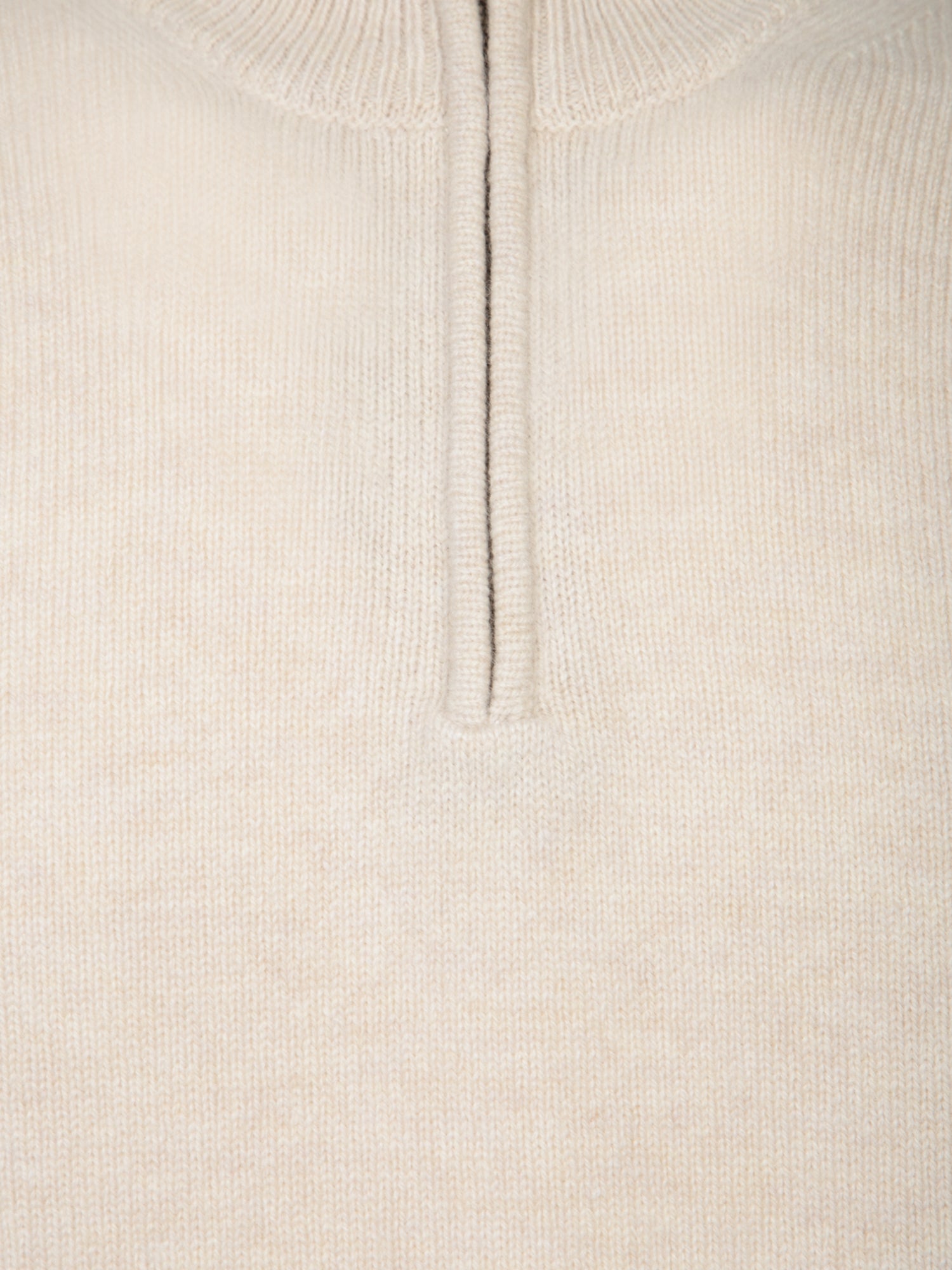 High collar sweater with half zip closure. Ribbed cuffs and hem. Soft and comfortable composition.