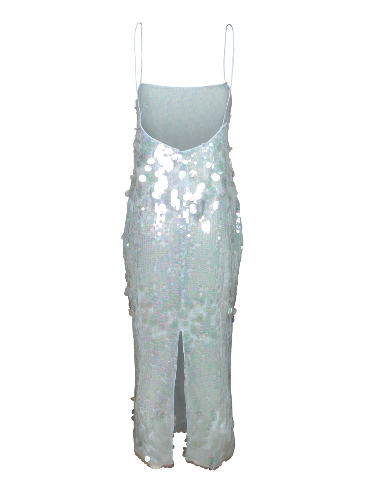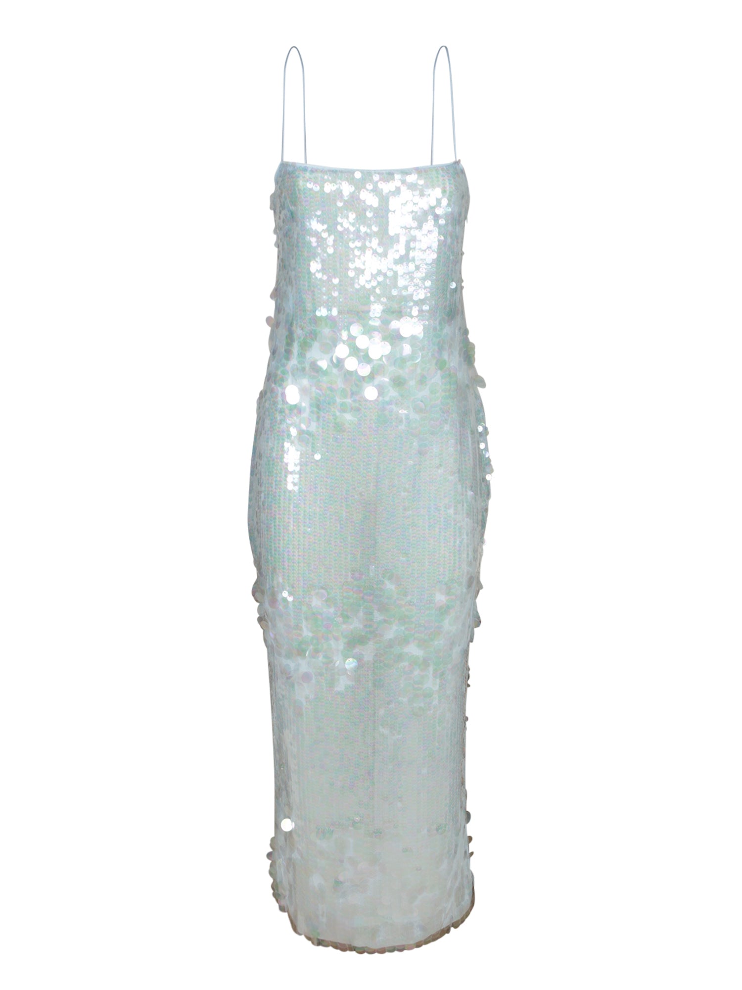 Fitted midi dress. Crafted with sparkling sequins. Adjustable thin straps.