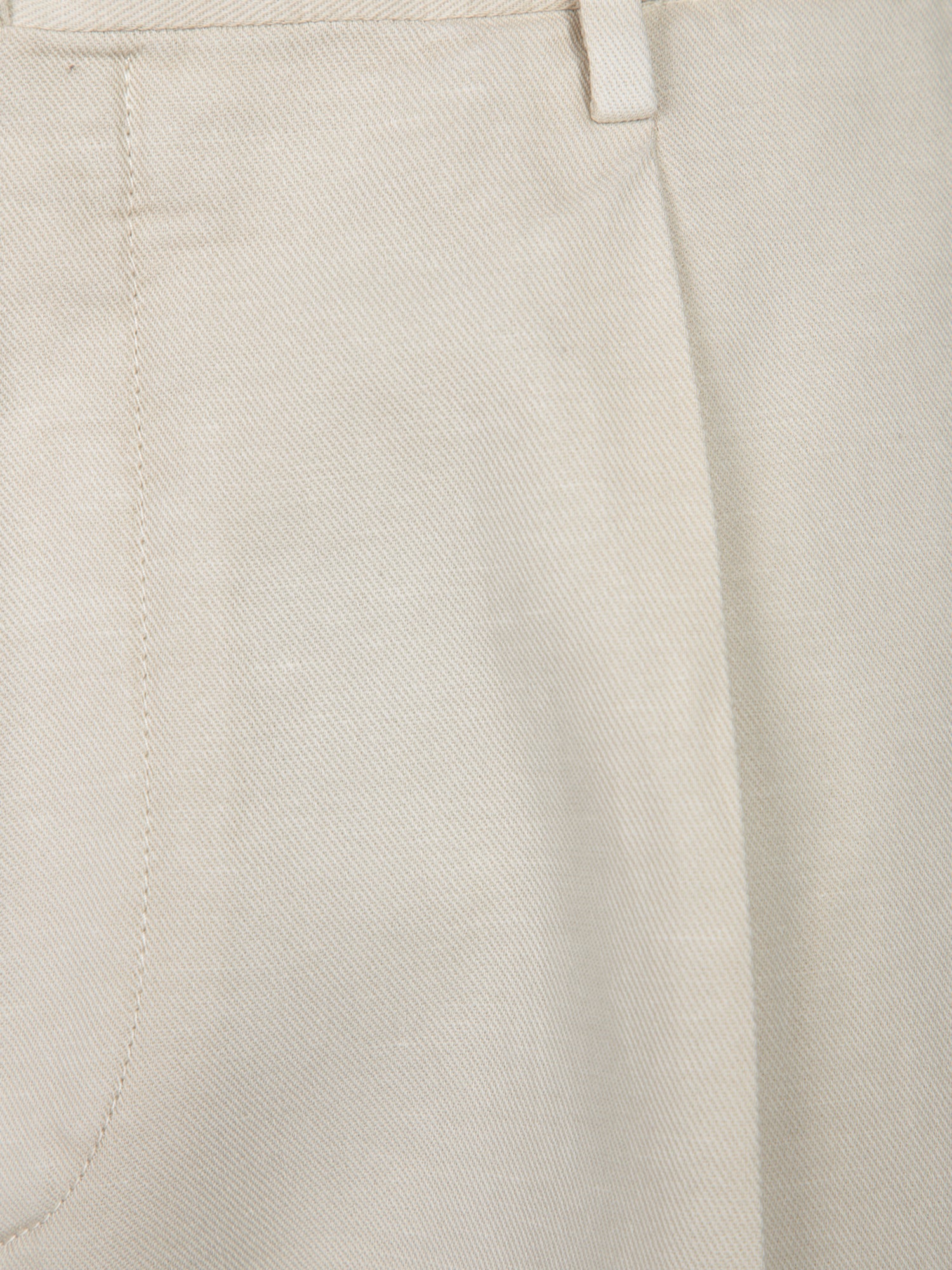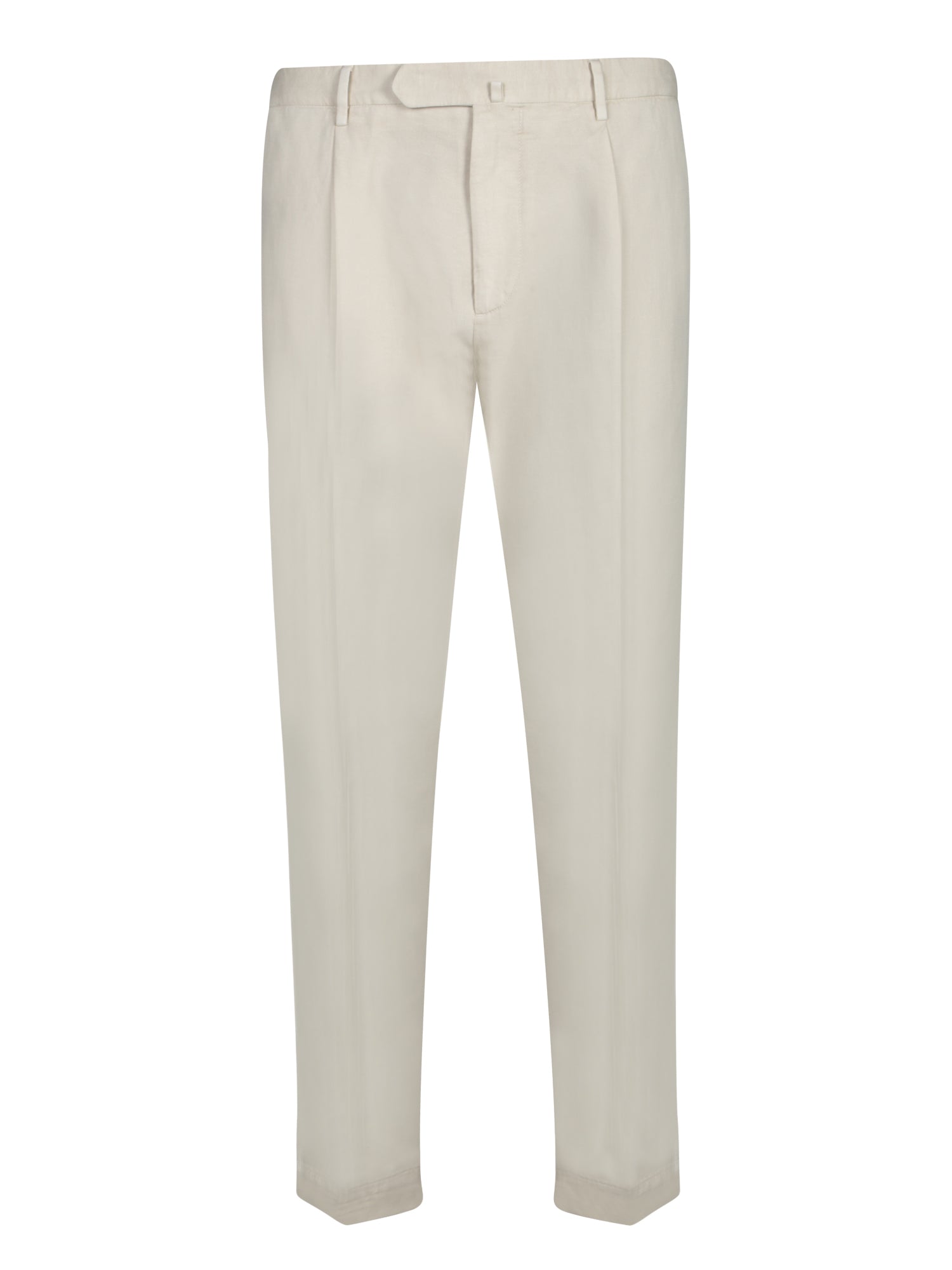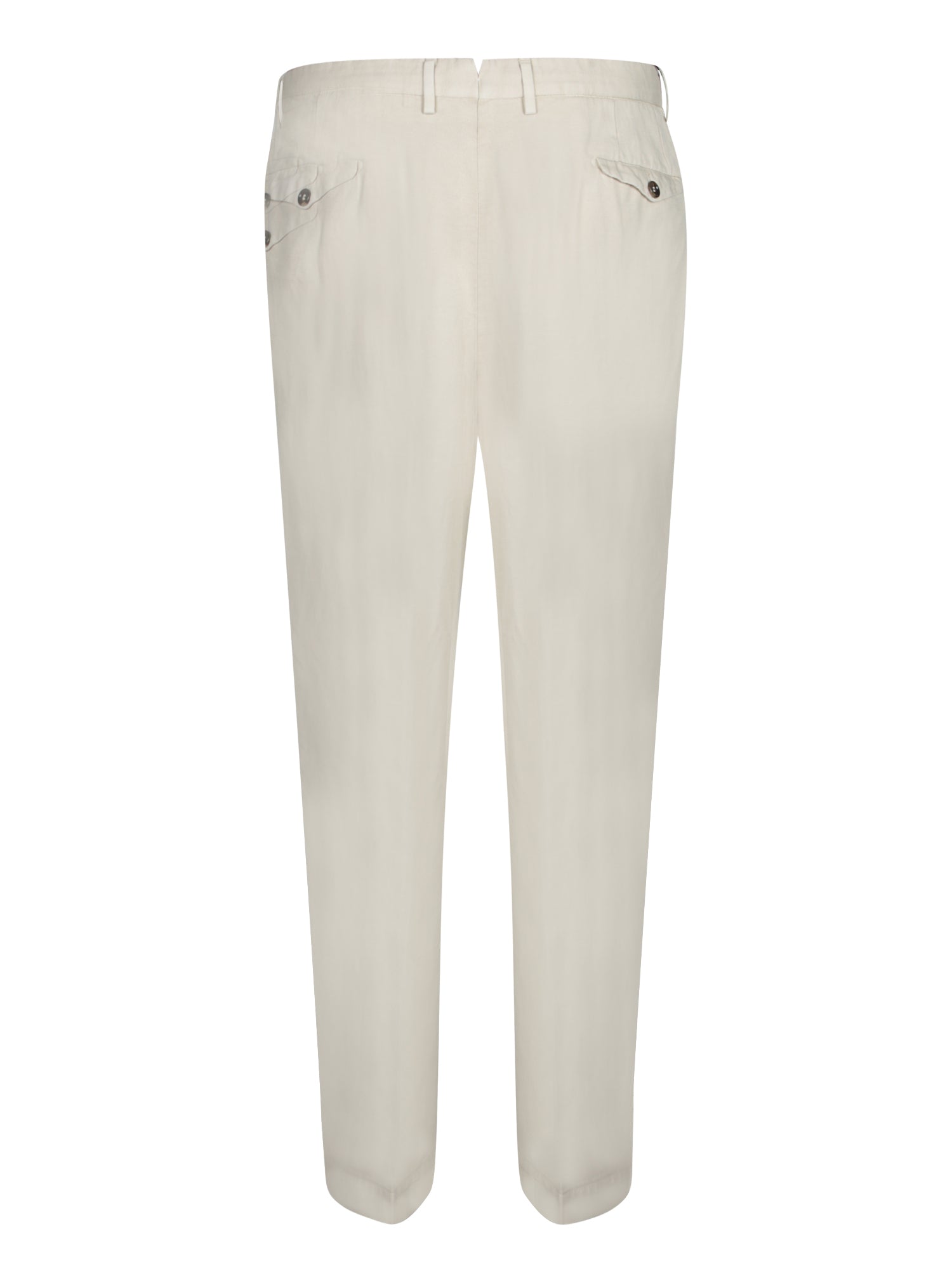 Straight-cut trousers. Zip and button closure. Side pockets.