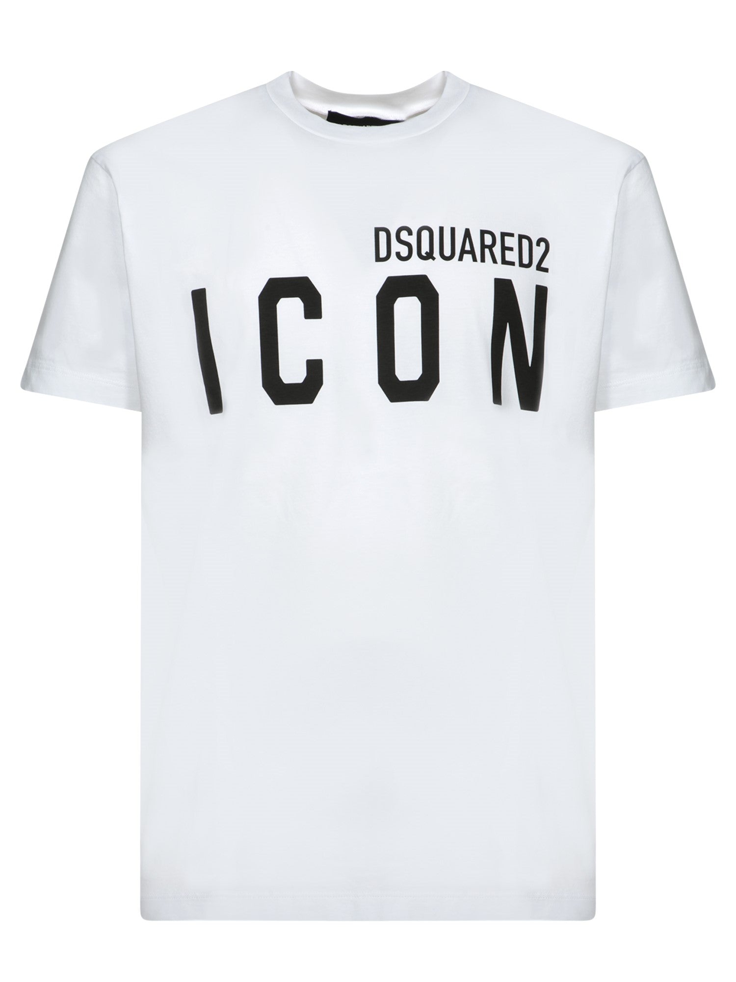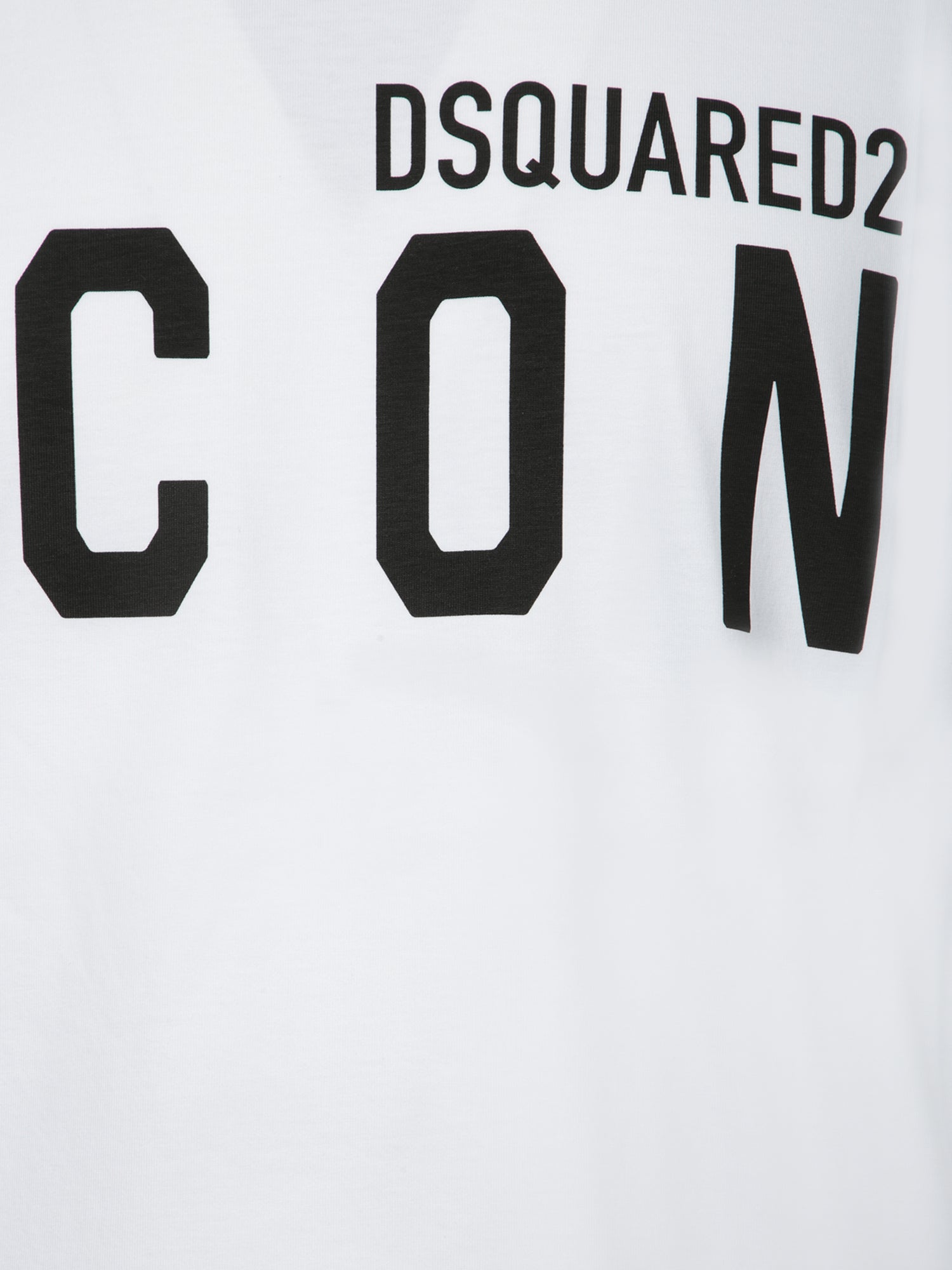 Short sleeve, crew-neck cotton t-shirt in white with 'ICON' logo print in black.