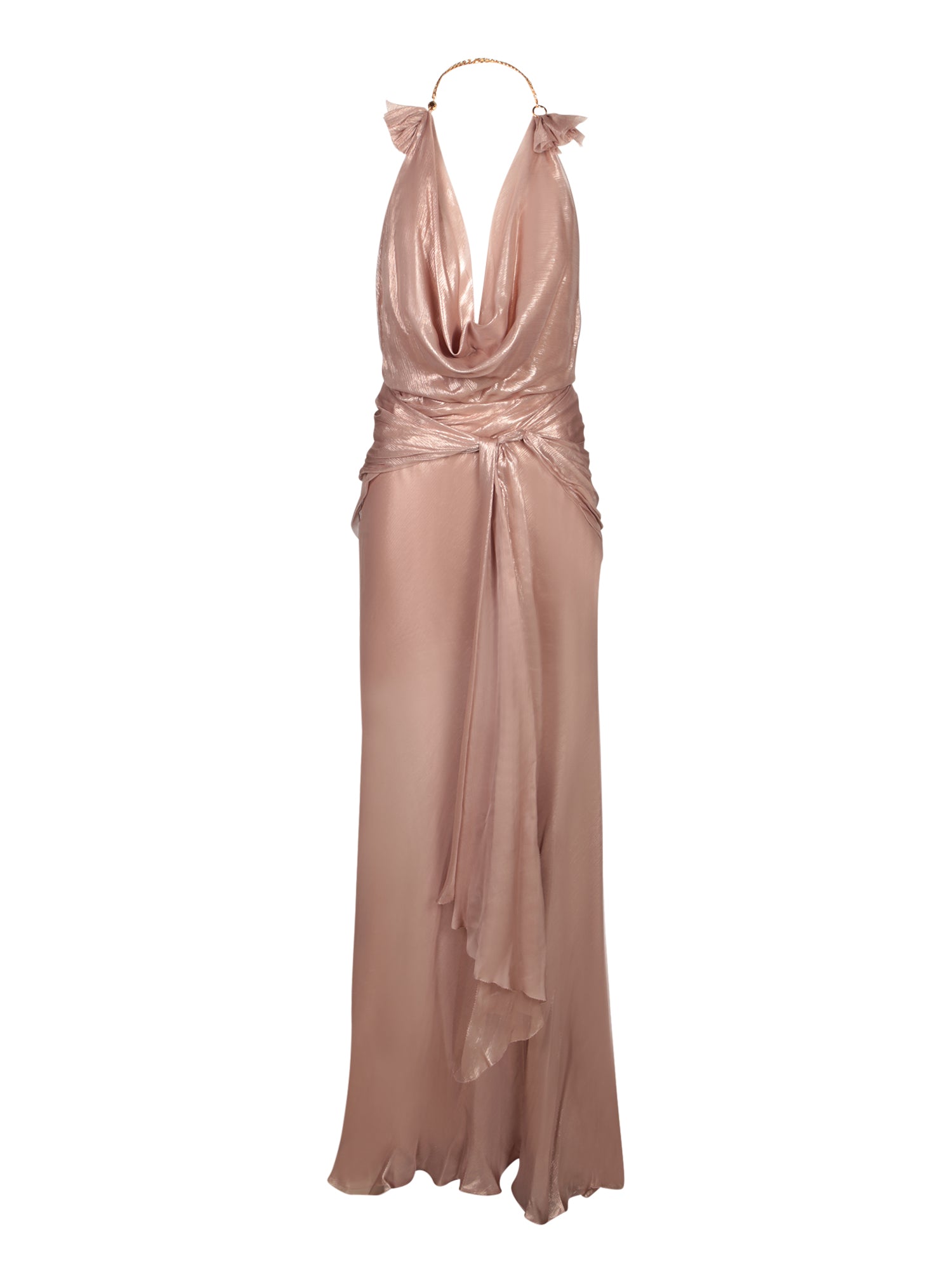 Long silk dress with shiny finish and draped details. Adjustable neck closure with golden metal accents.