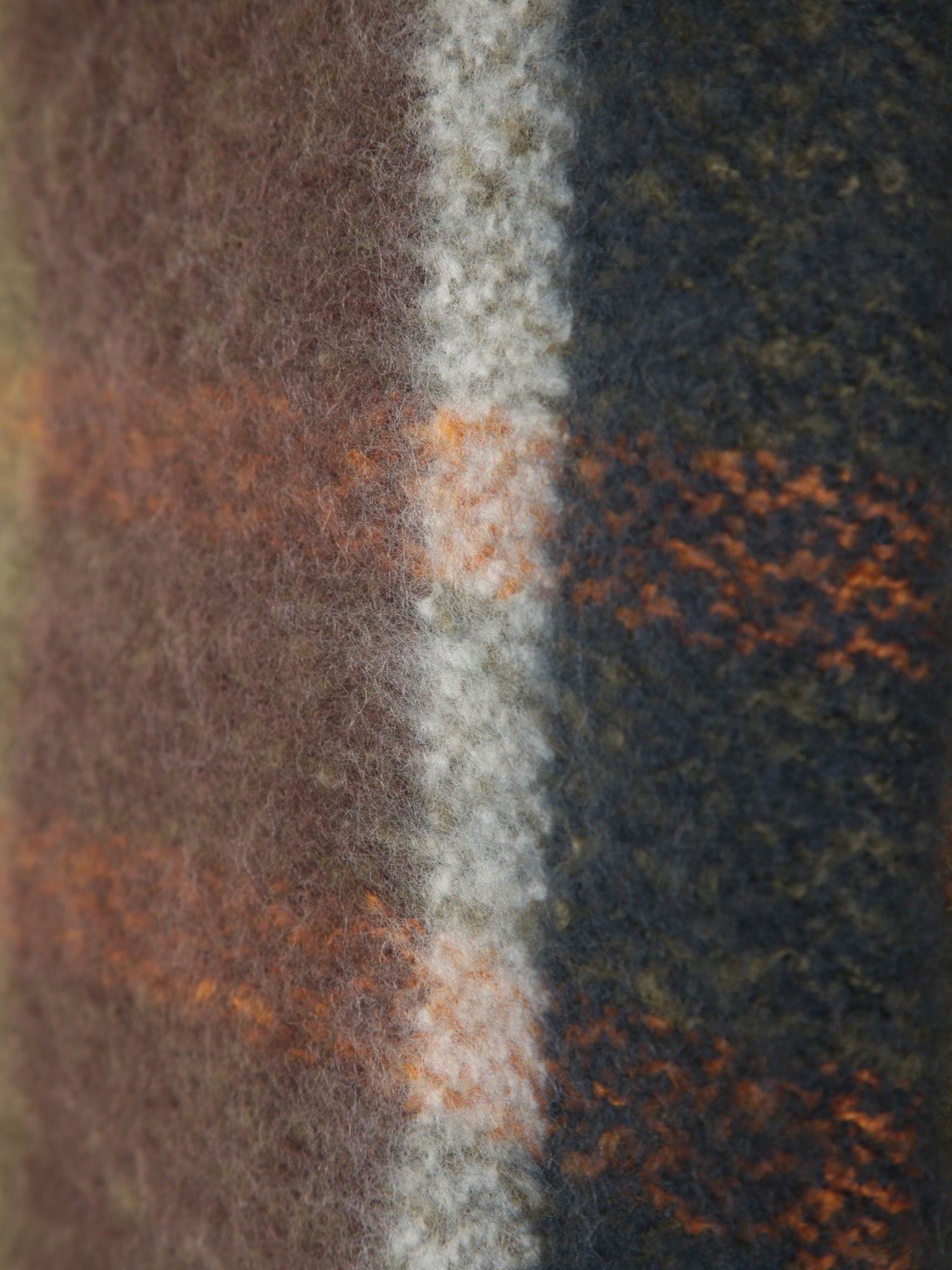 Cape in bouclé fabric with colorful check pattern. Contrast trim.