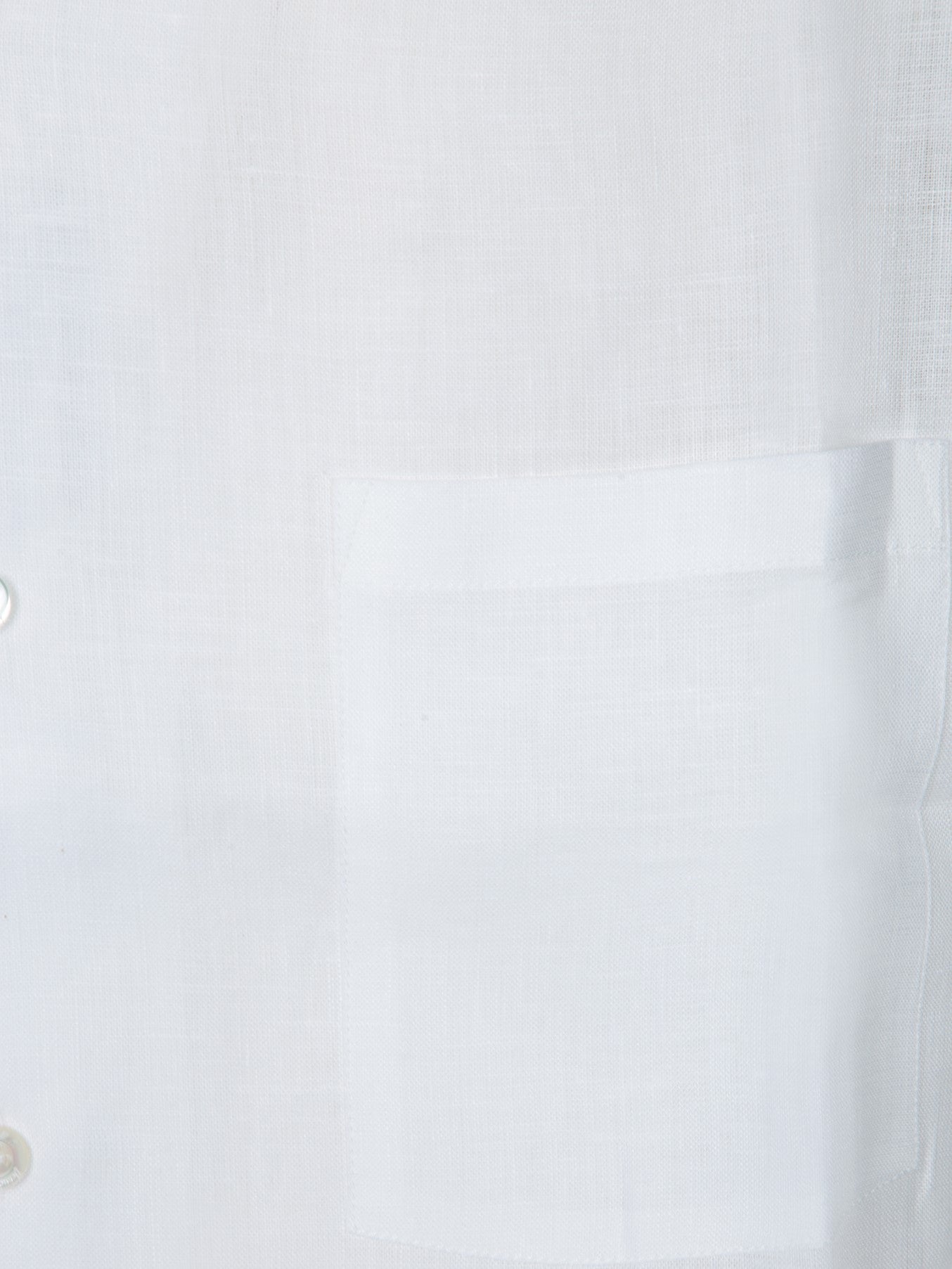 Short sleeve linen shirt. Bowling collar. Button front closure.