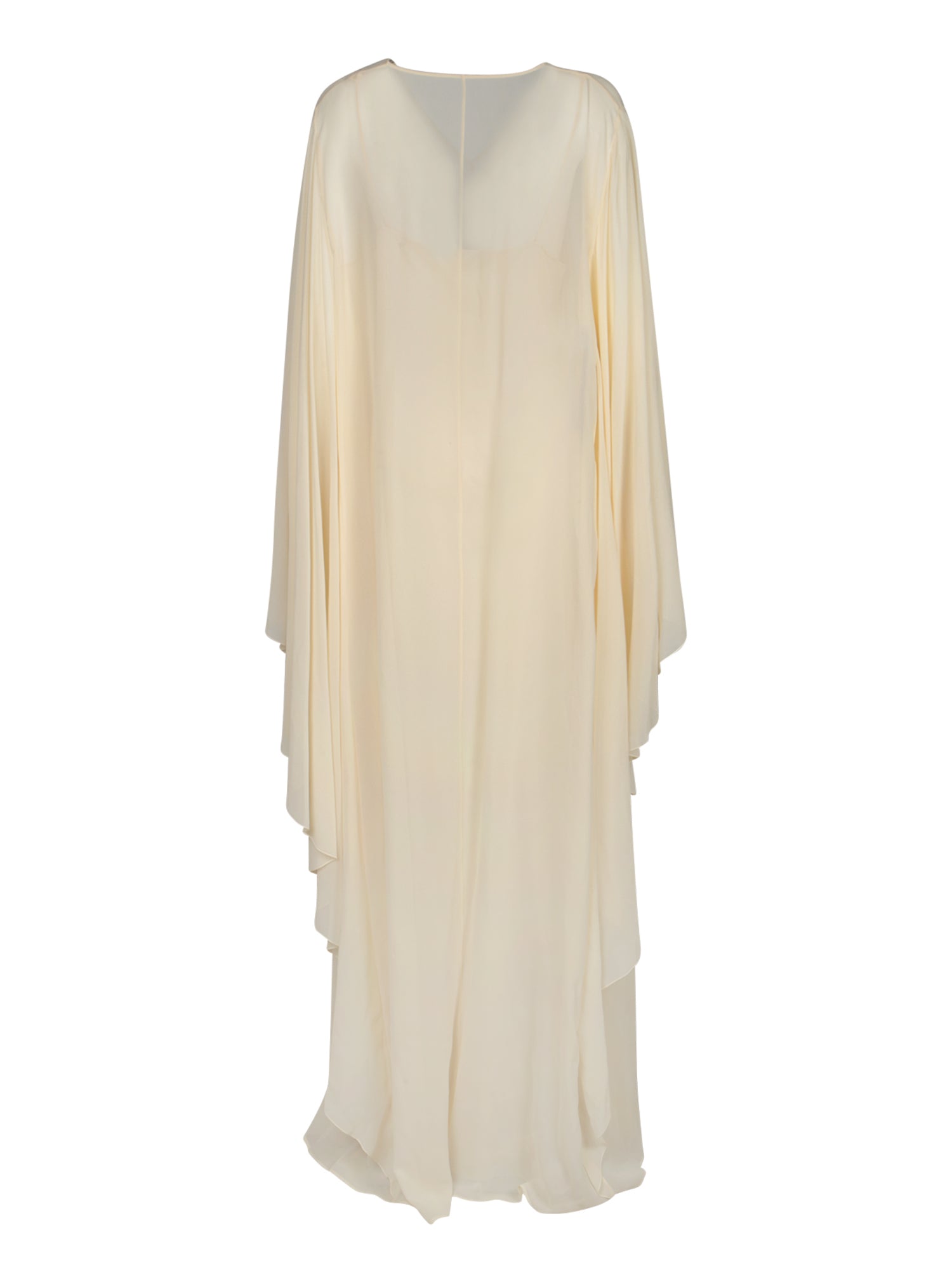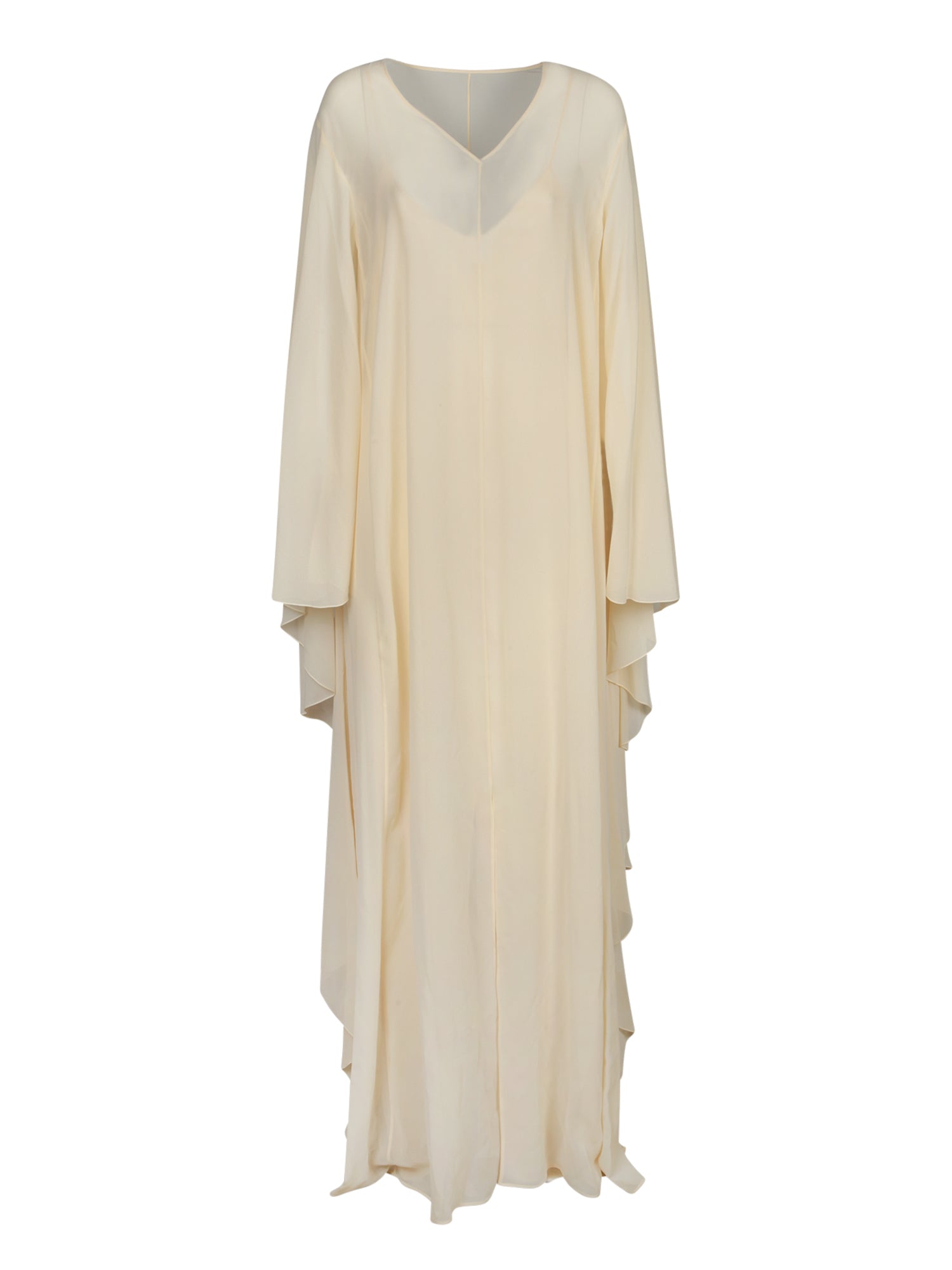 Long silk dress. Kimono sleeves. Fluid cut with visible seam details. V-neckline.