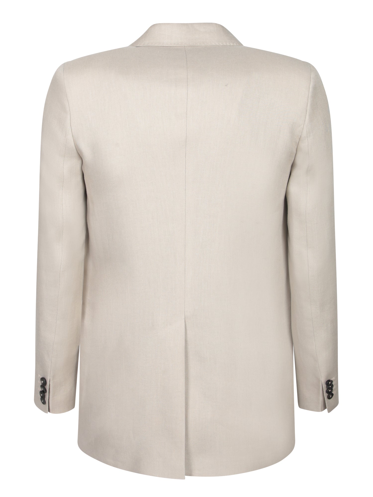 Double-breasted jacket in linen fabric. Features flap pockets and contrasting black buttons.