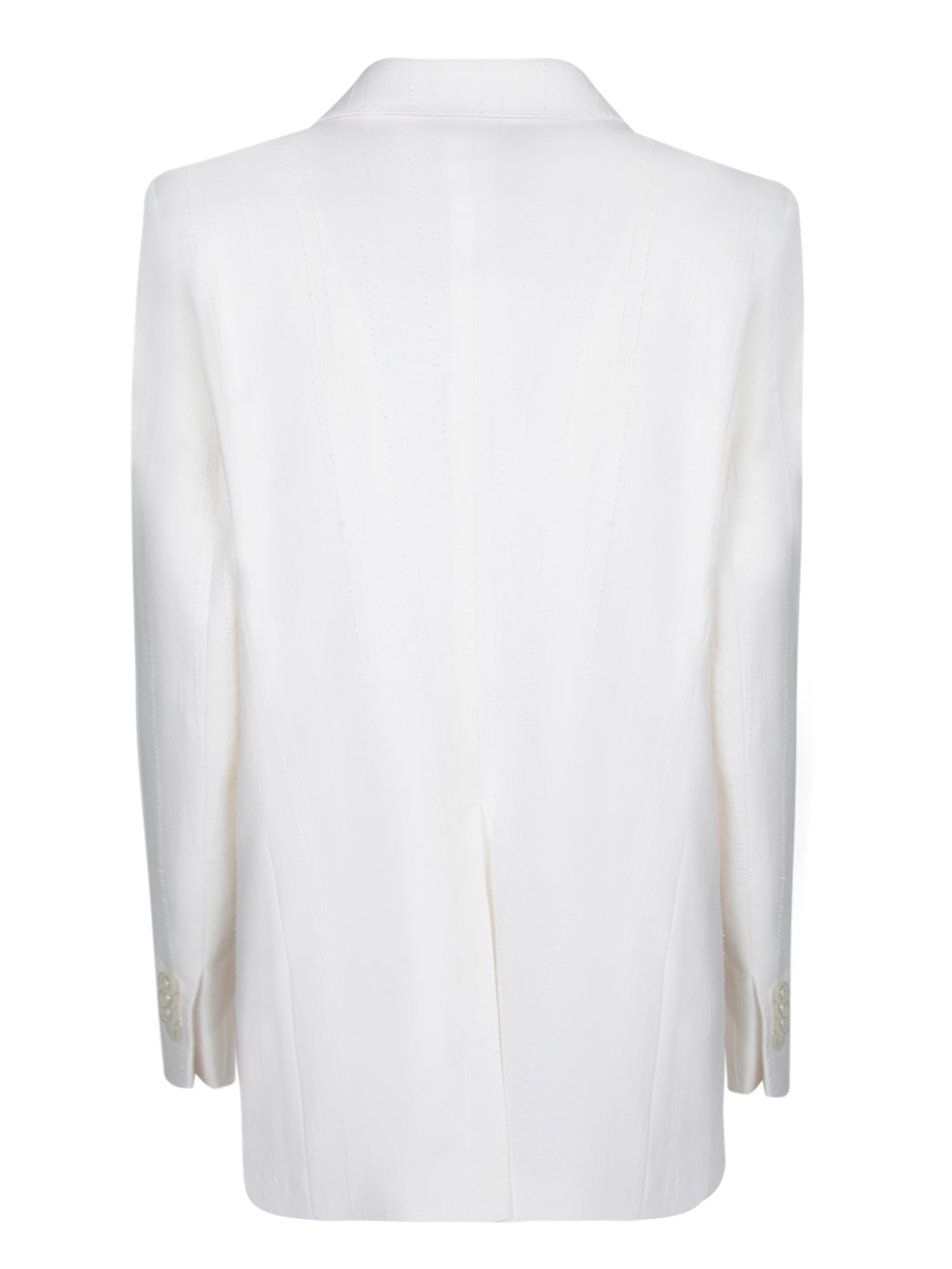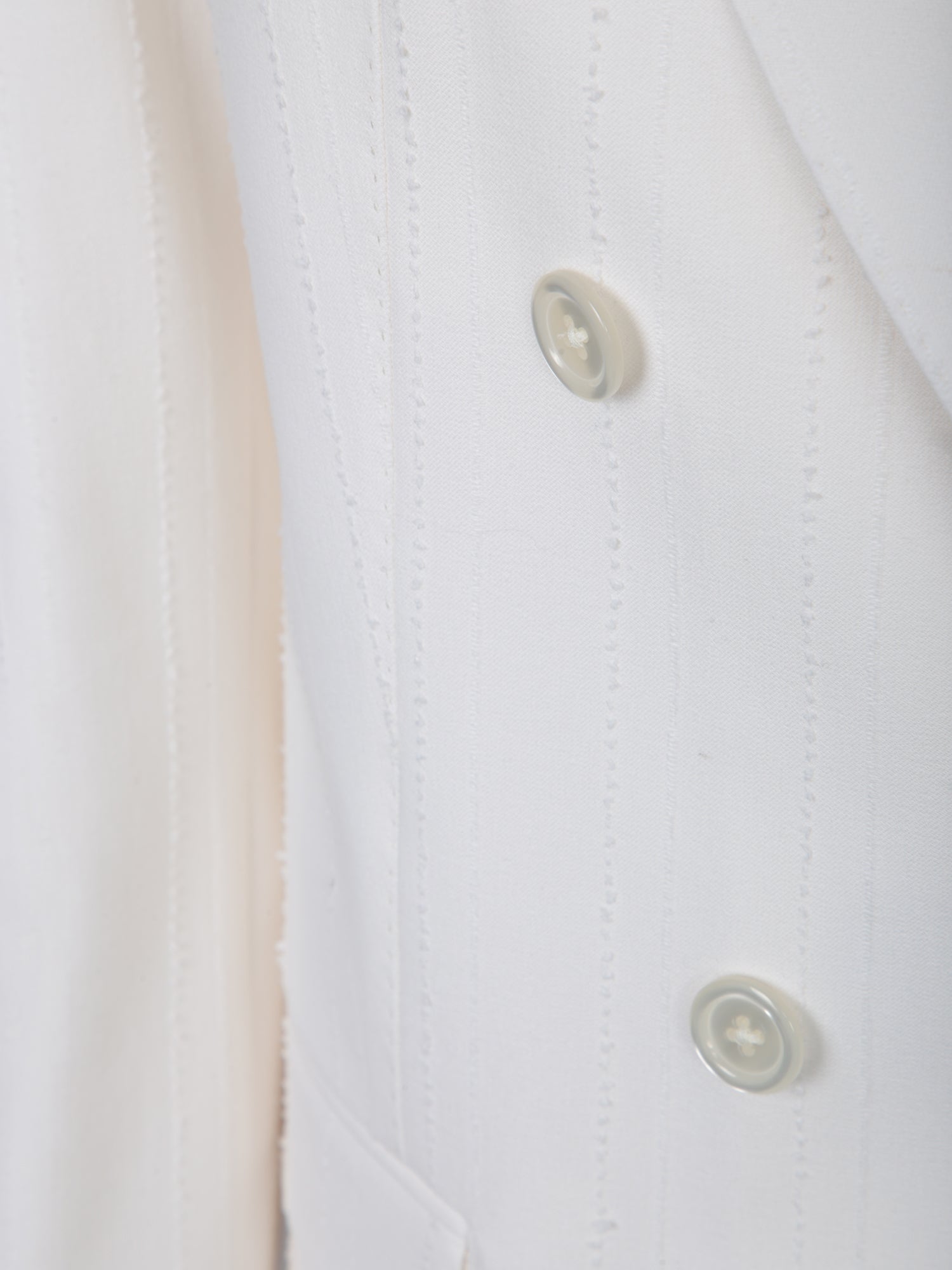 Double-breasted textured linen jacket featuring peak lapels, front buttons, and welt pockets.