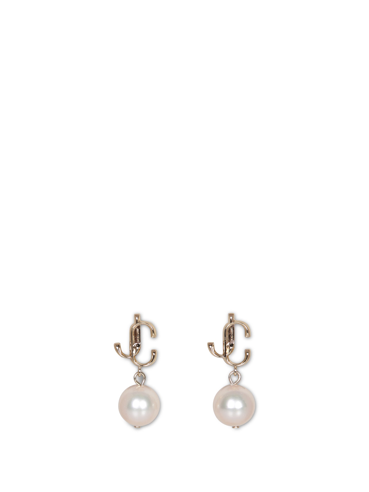 These refined Jimmy Choo earrings feature a glossy pearl suspended from a delicate chain, anchored by a distinctive JC logo in white gold, perfect for adding a touch of luxury to any occasion.