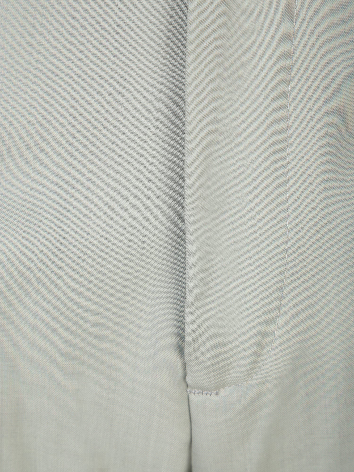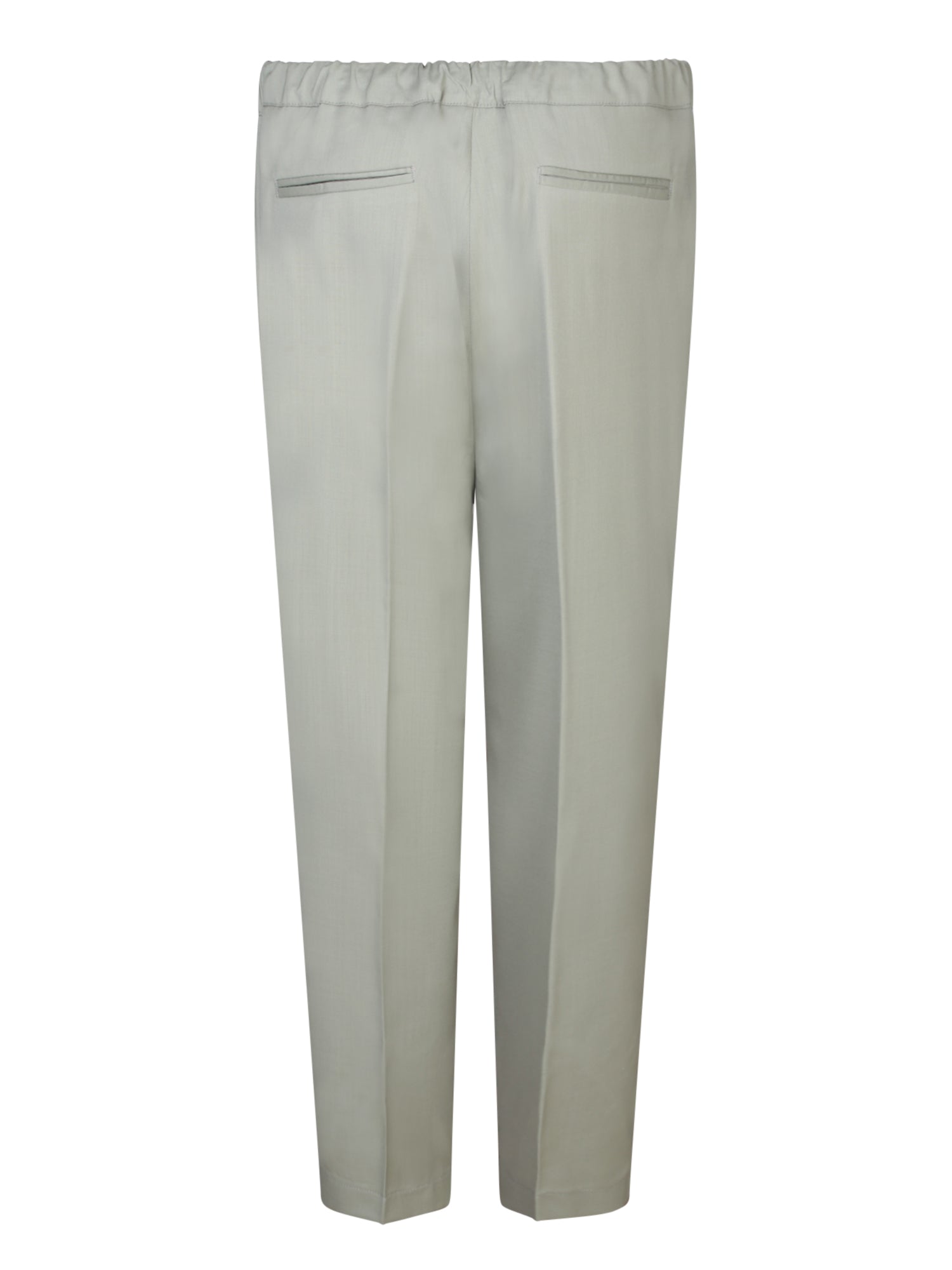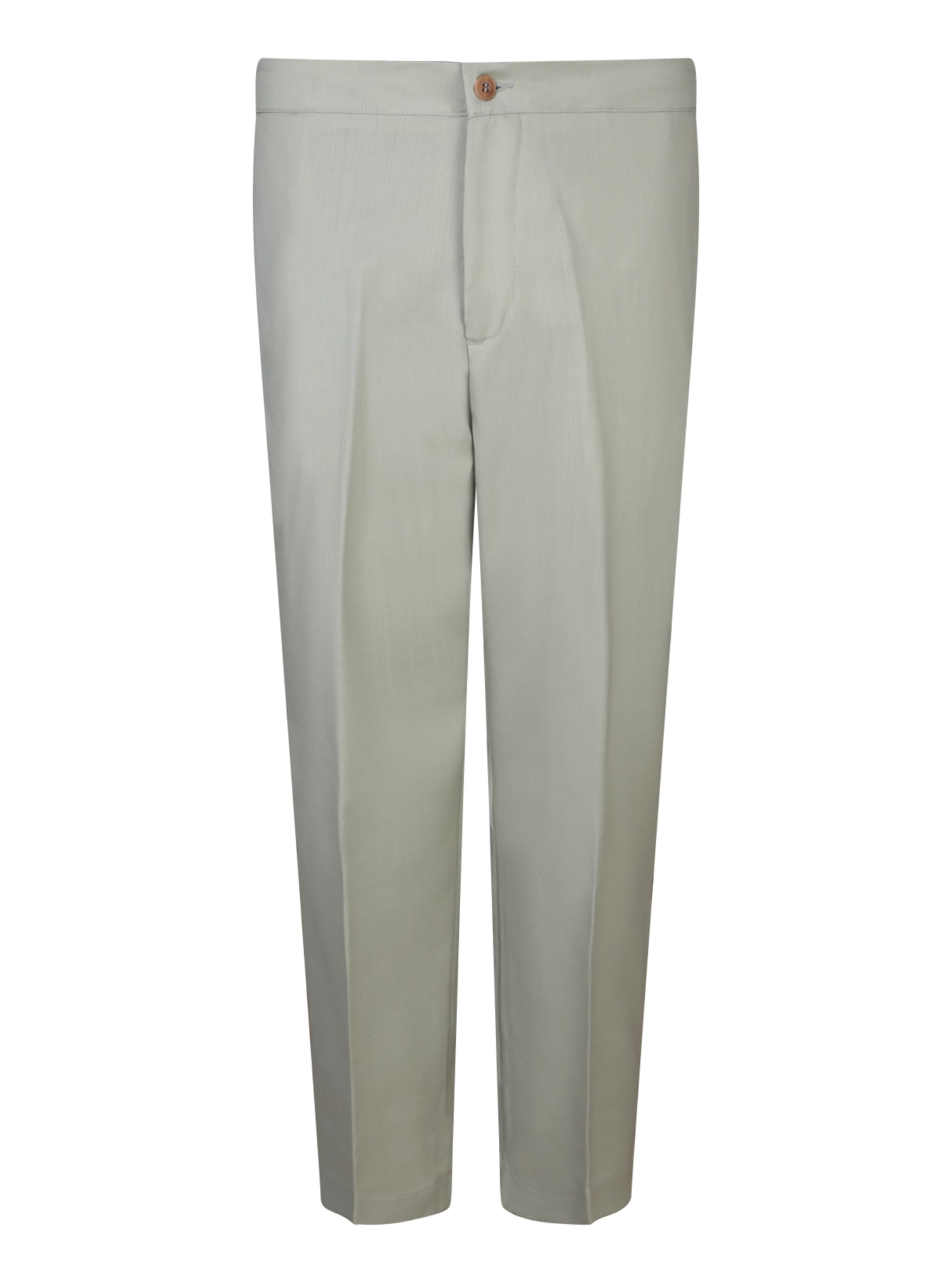 Straight cut trousers. Zip and button front fastening. Side pockets.