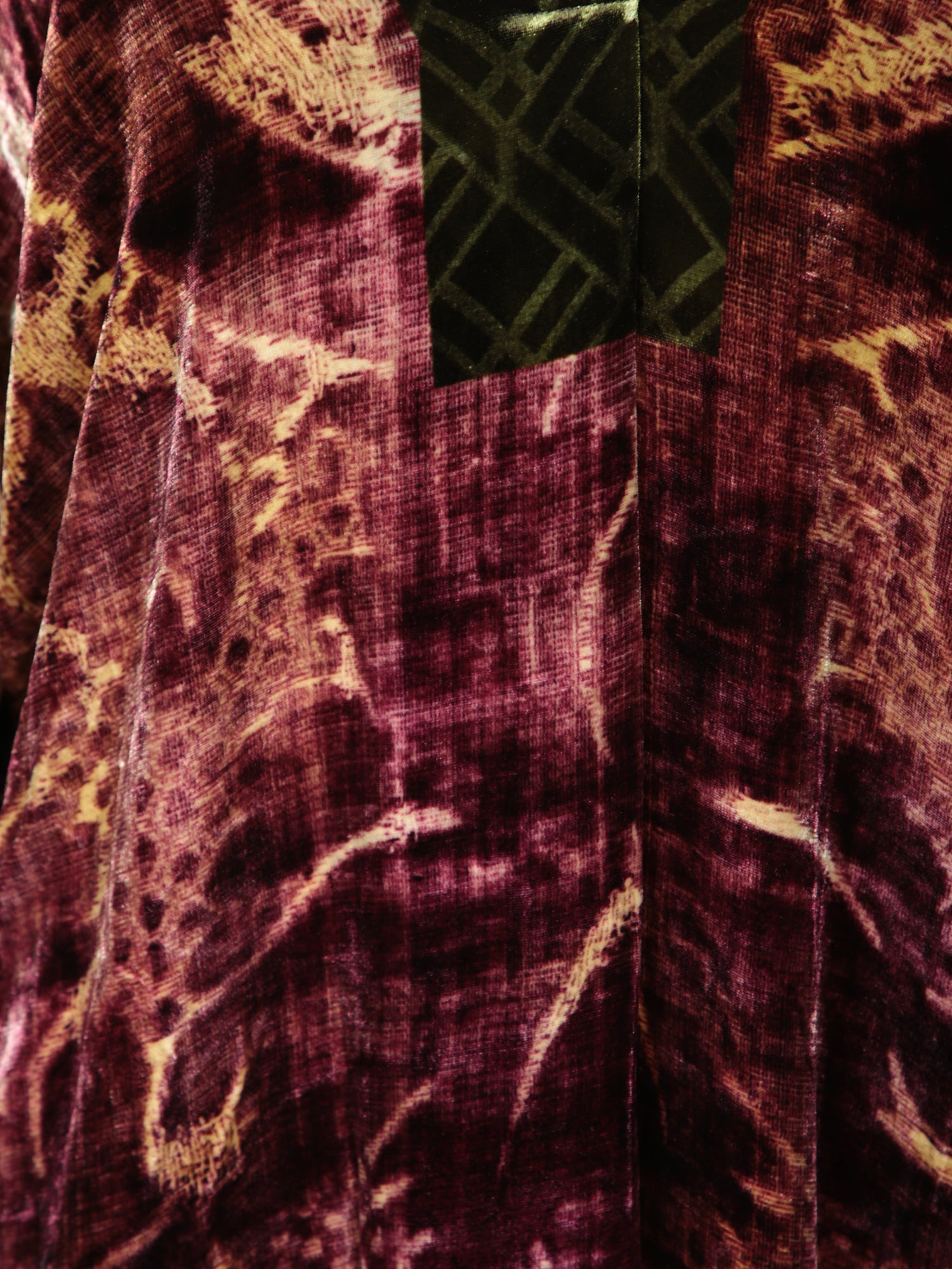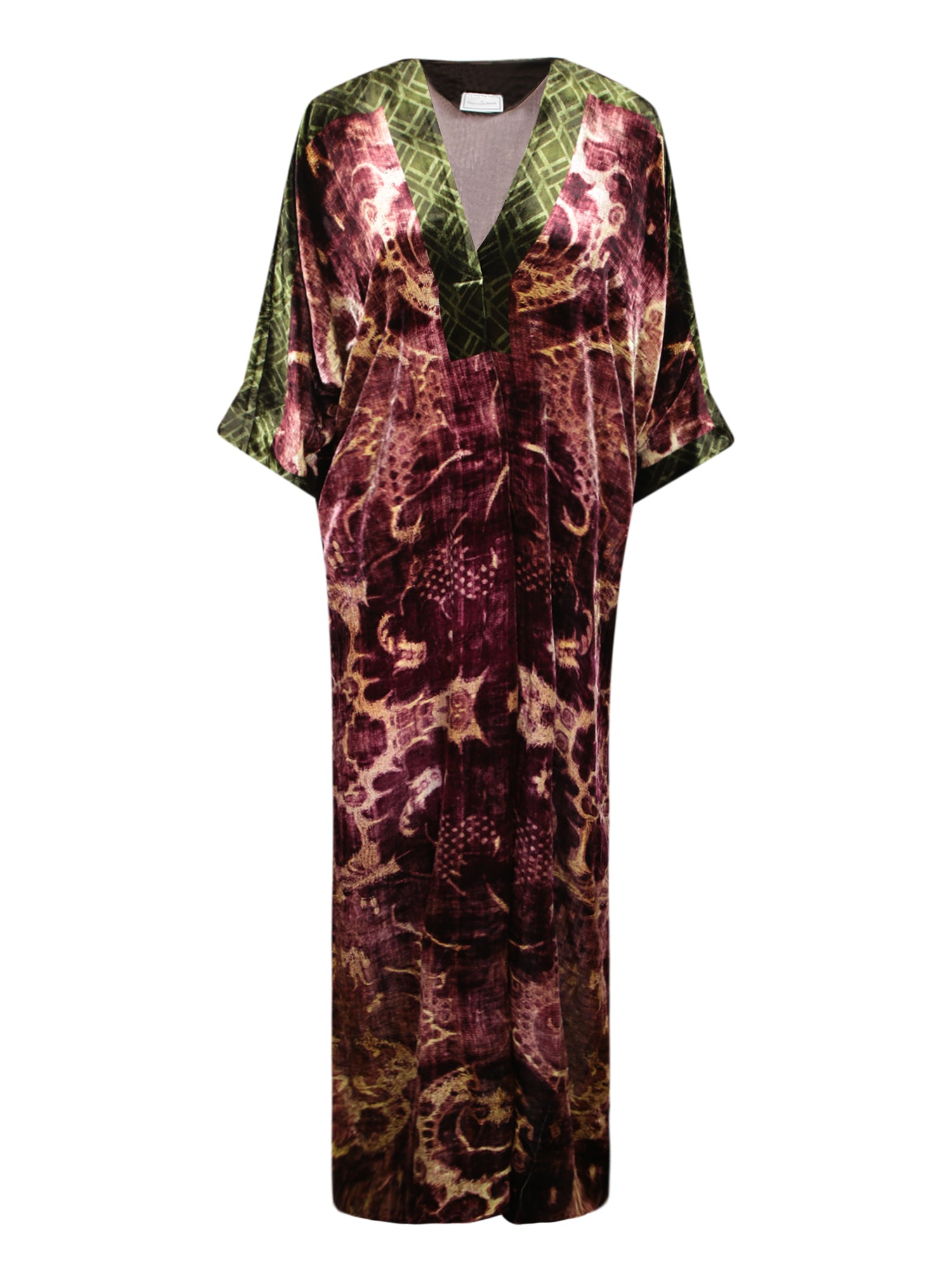 Long dress with multifunctional print. Wide sleeves. V-neckline.