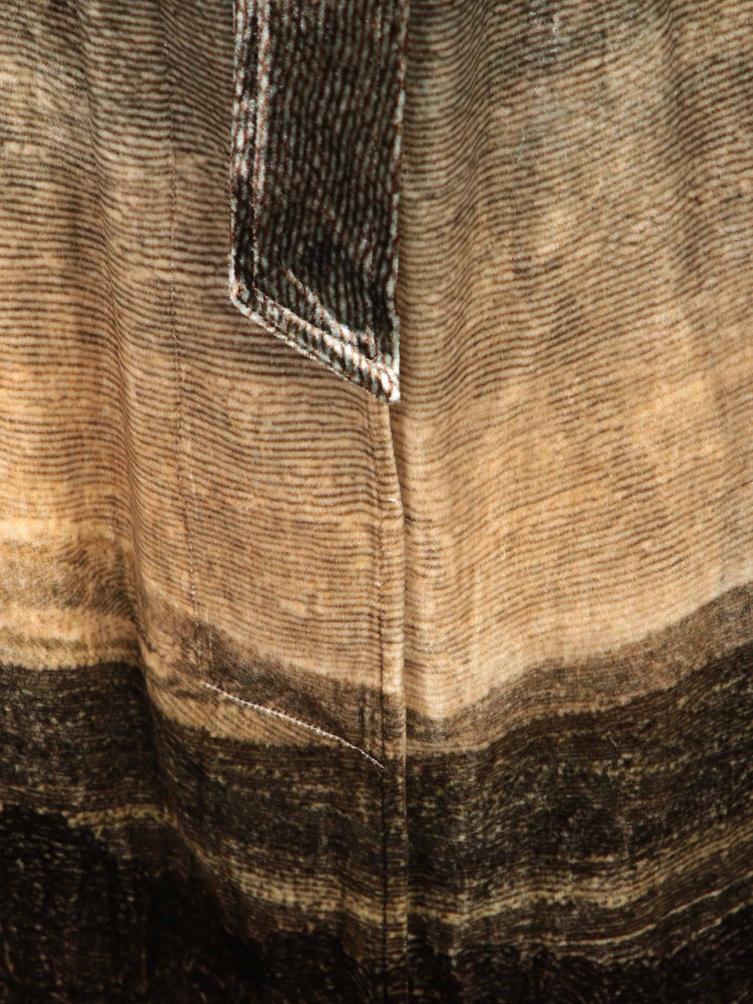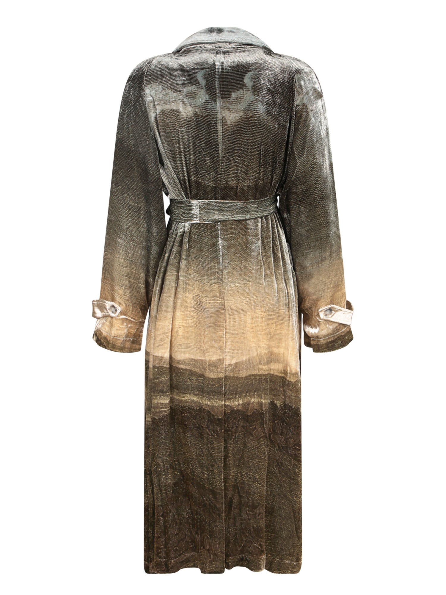 Trench with adjustable belt. Features a multicolored metallic texture. Button closure.