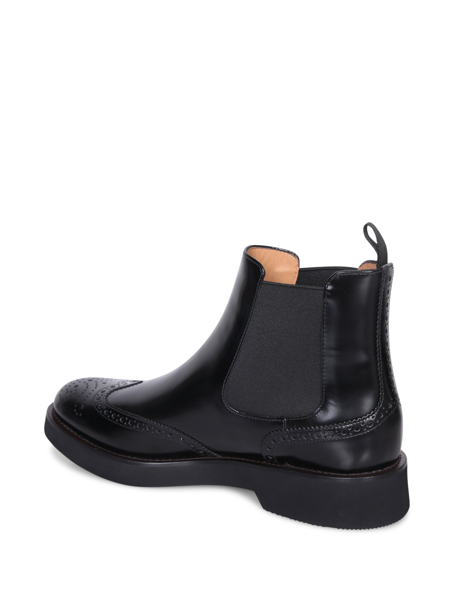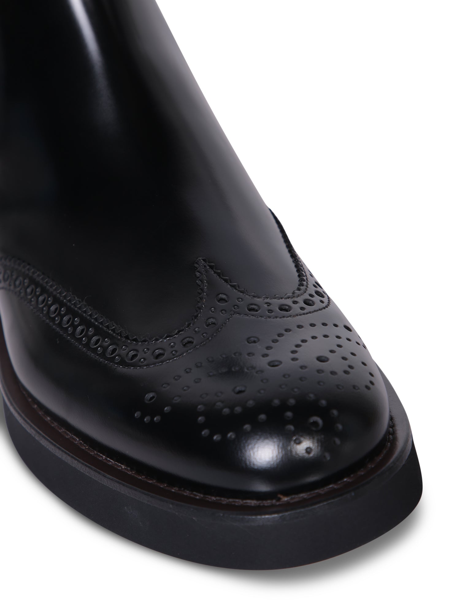 Shiny black leather ankle boots with side elastic panels. Features brogue detailing and a back pull tab.