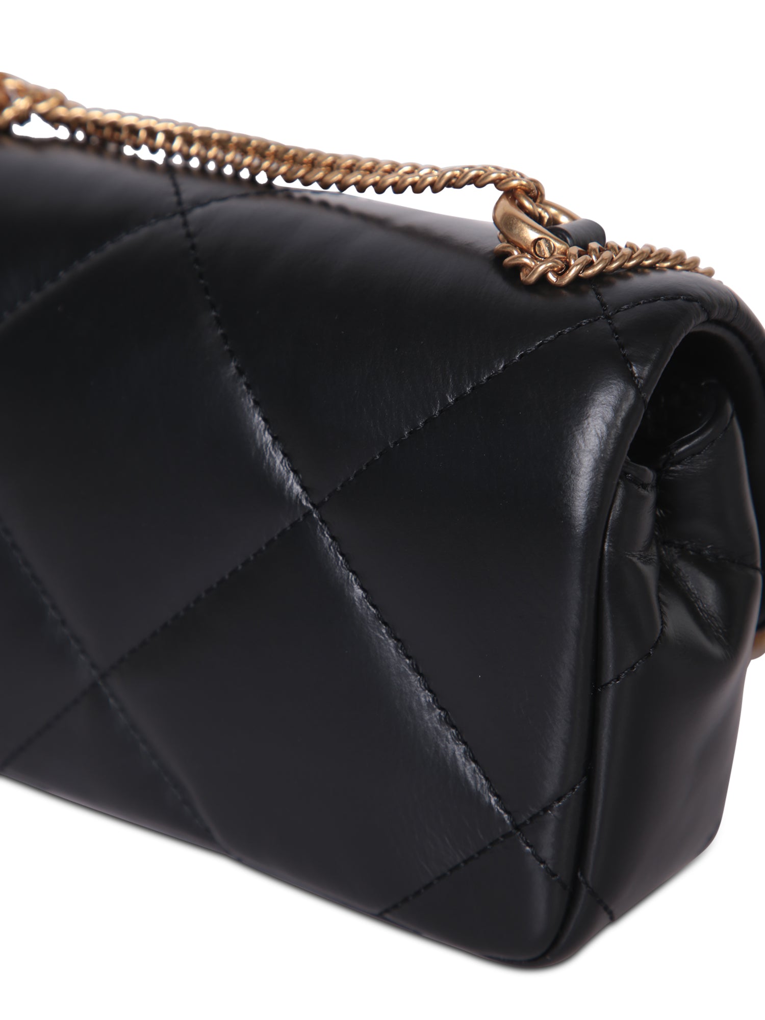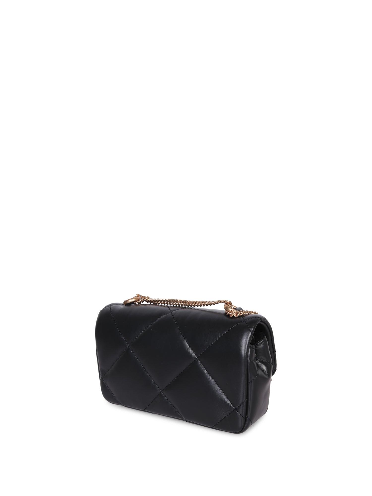 Quilted leather shoulder bag. Adjustable and detachable golden chain strap. Snap closure with front logo.