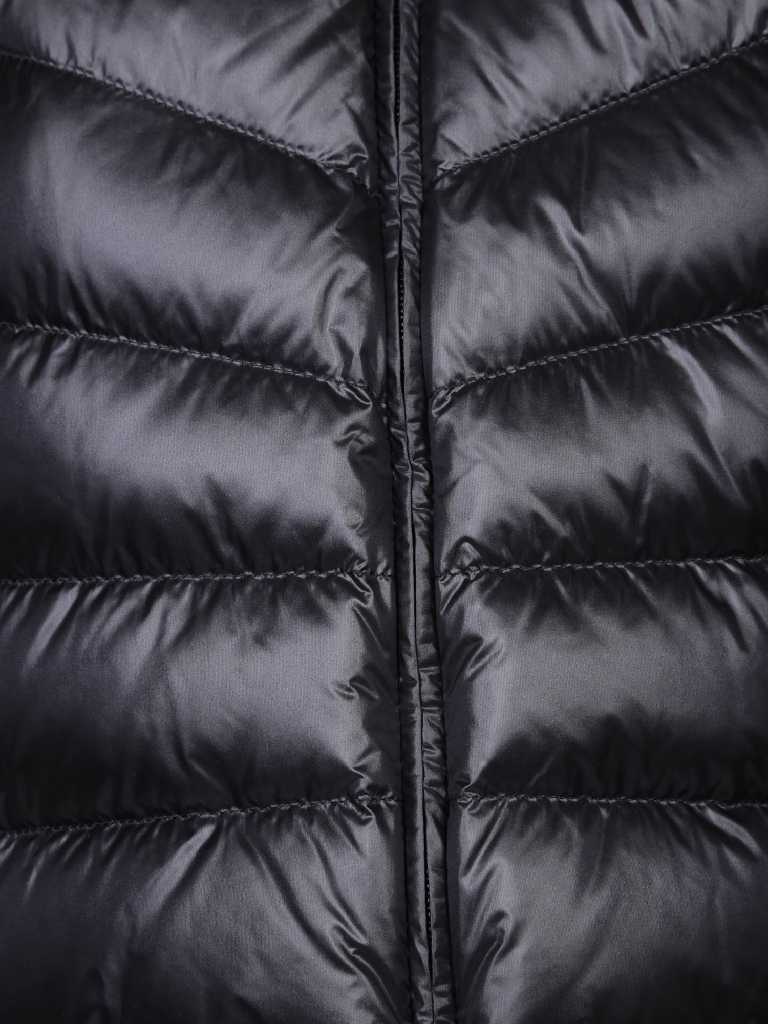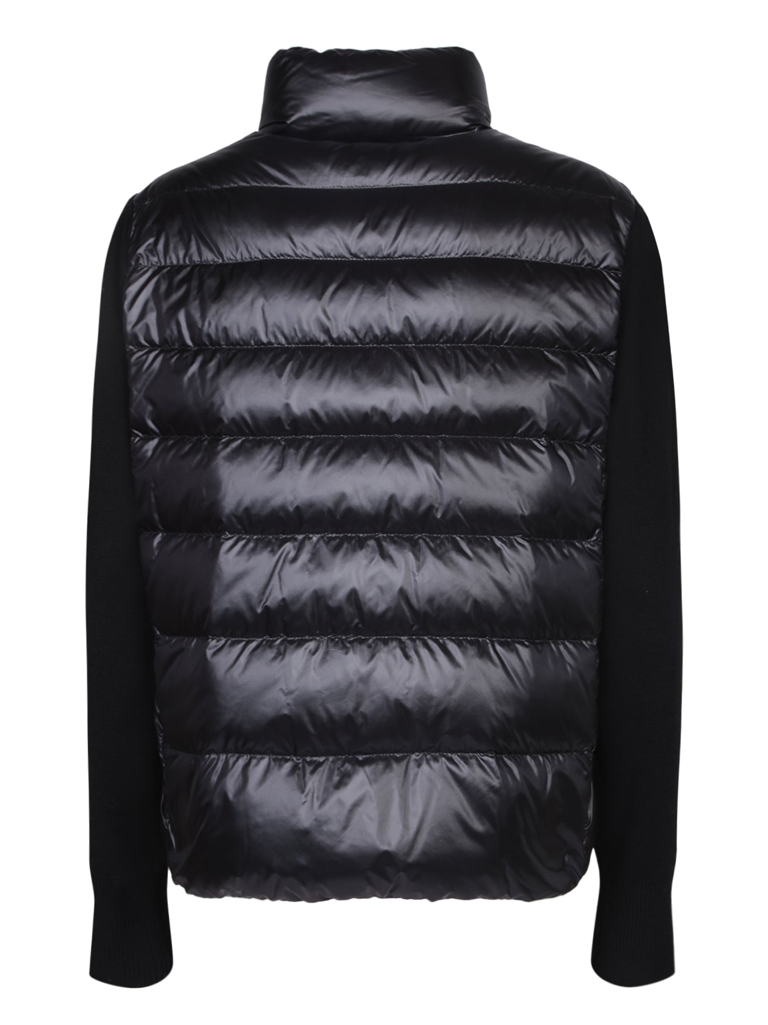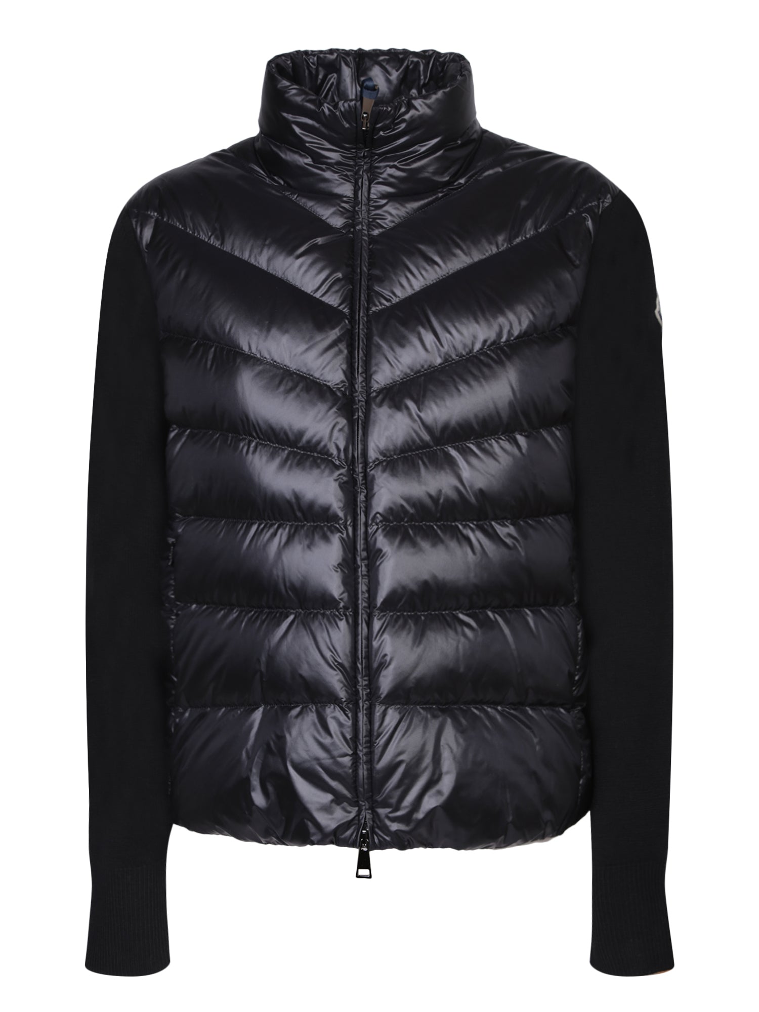This Moncler cardigan blends elegance and functionality with a glossy down body and knitted sleeves, perfect for a sophisticated winter look.