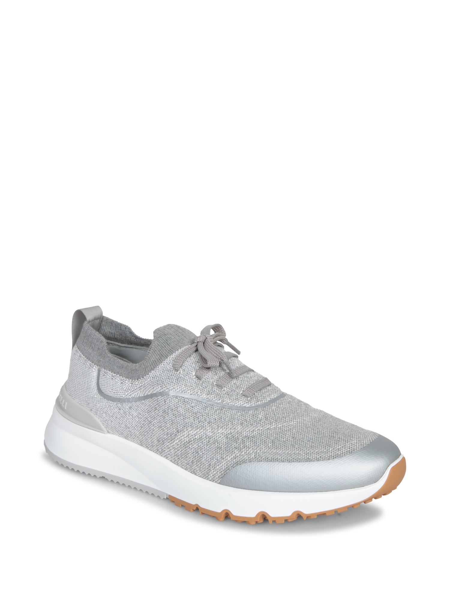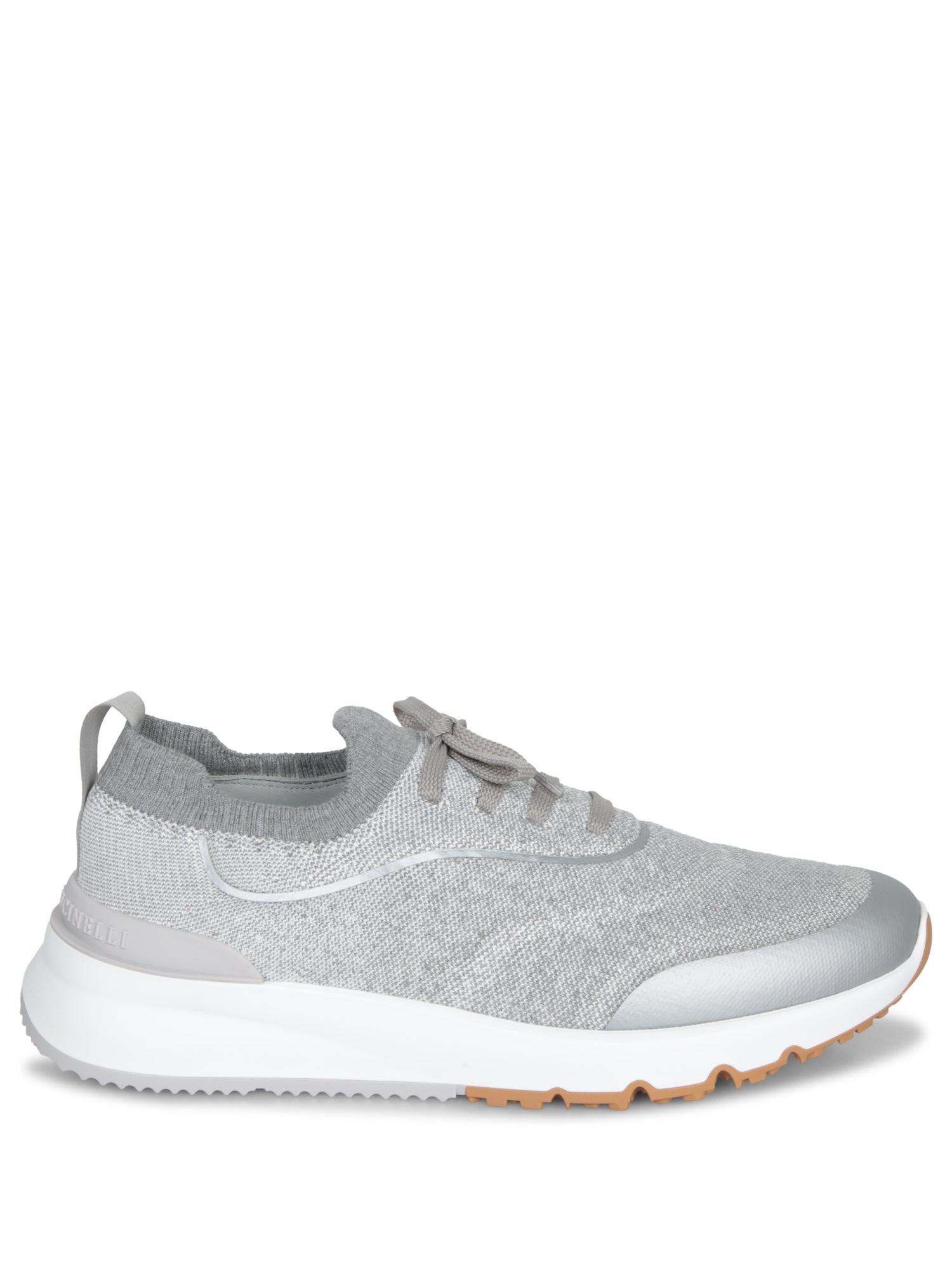 Sock-like design. Knitted weave. White and brown rubber sole.