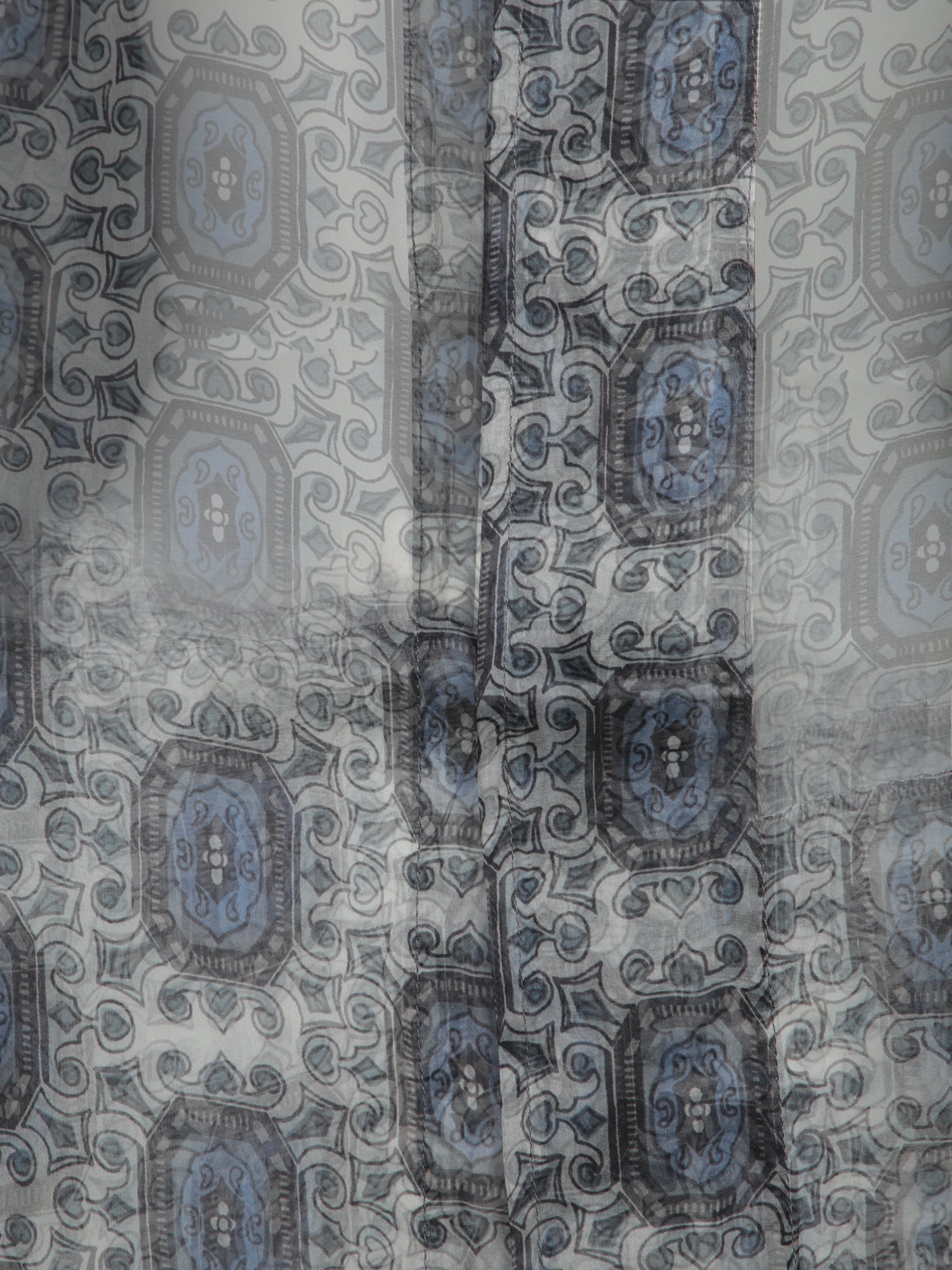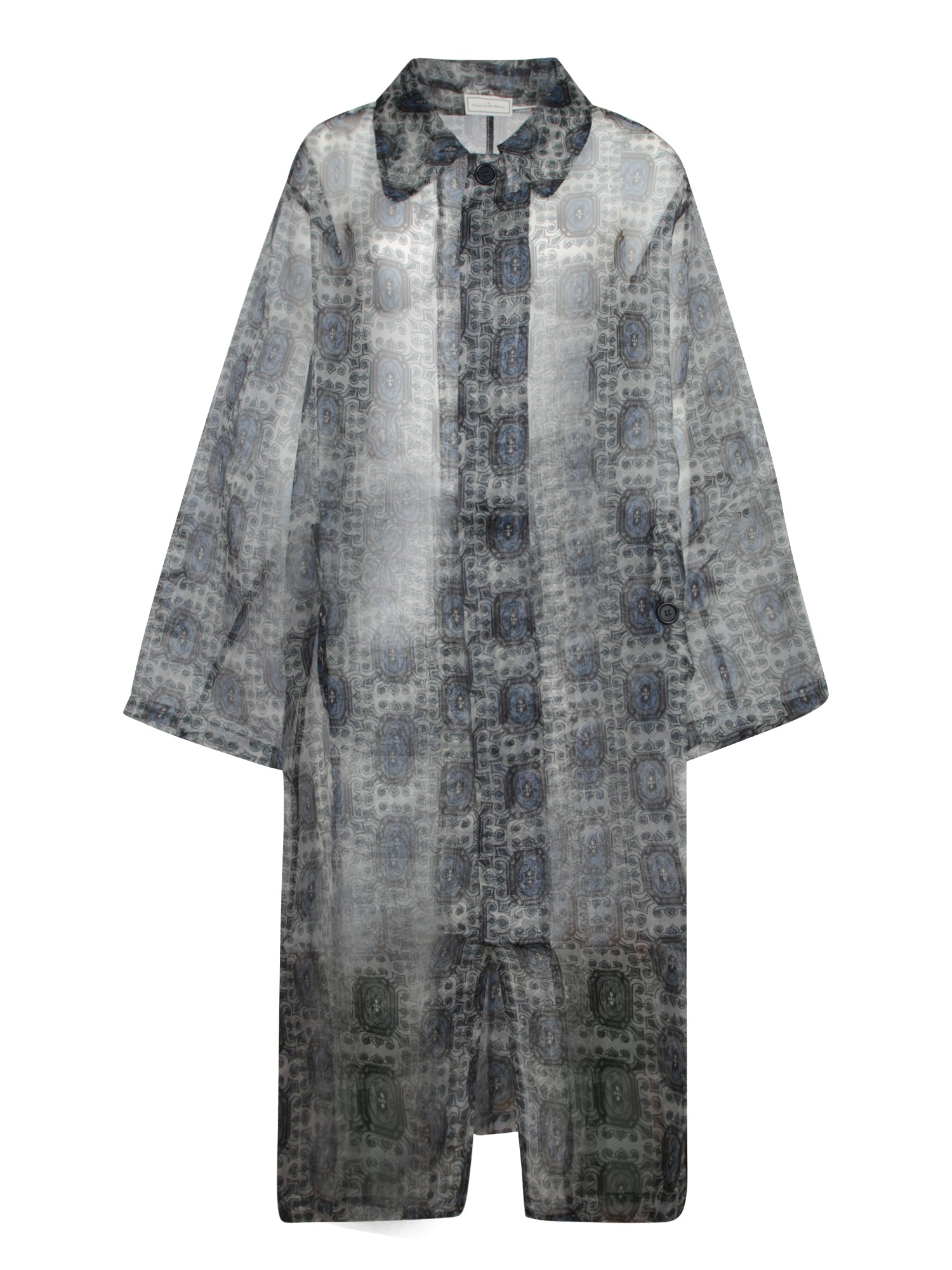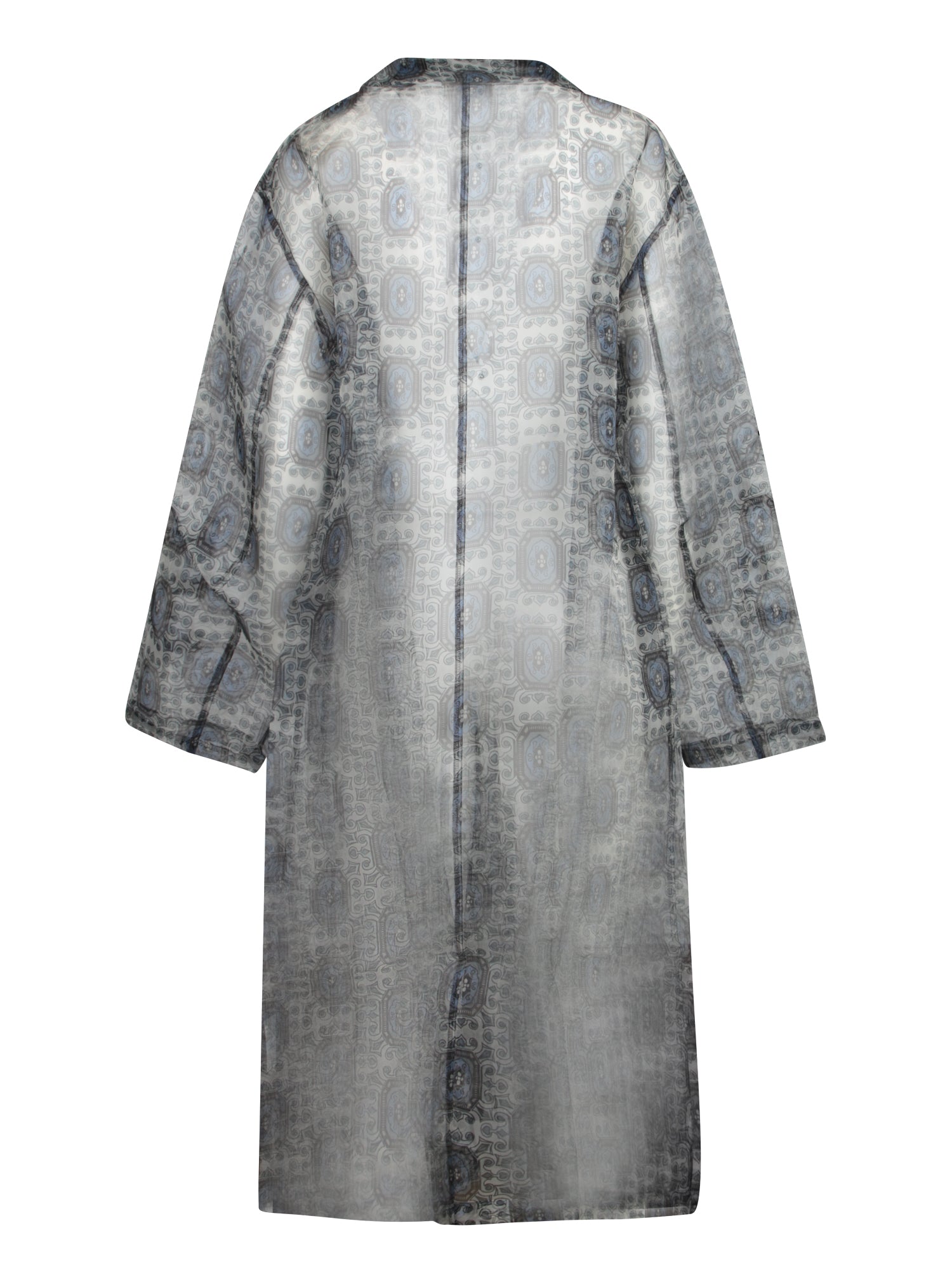Light organza duster coat with graphic print. Long sleeves, classic collar, and button front closure.