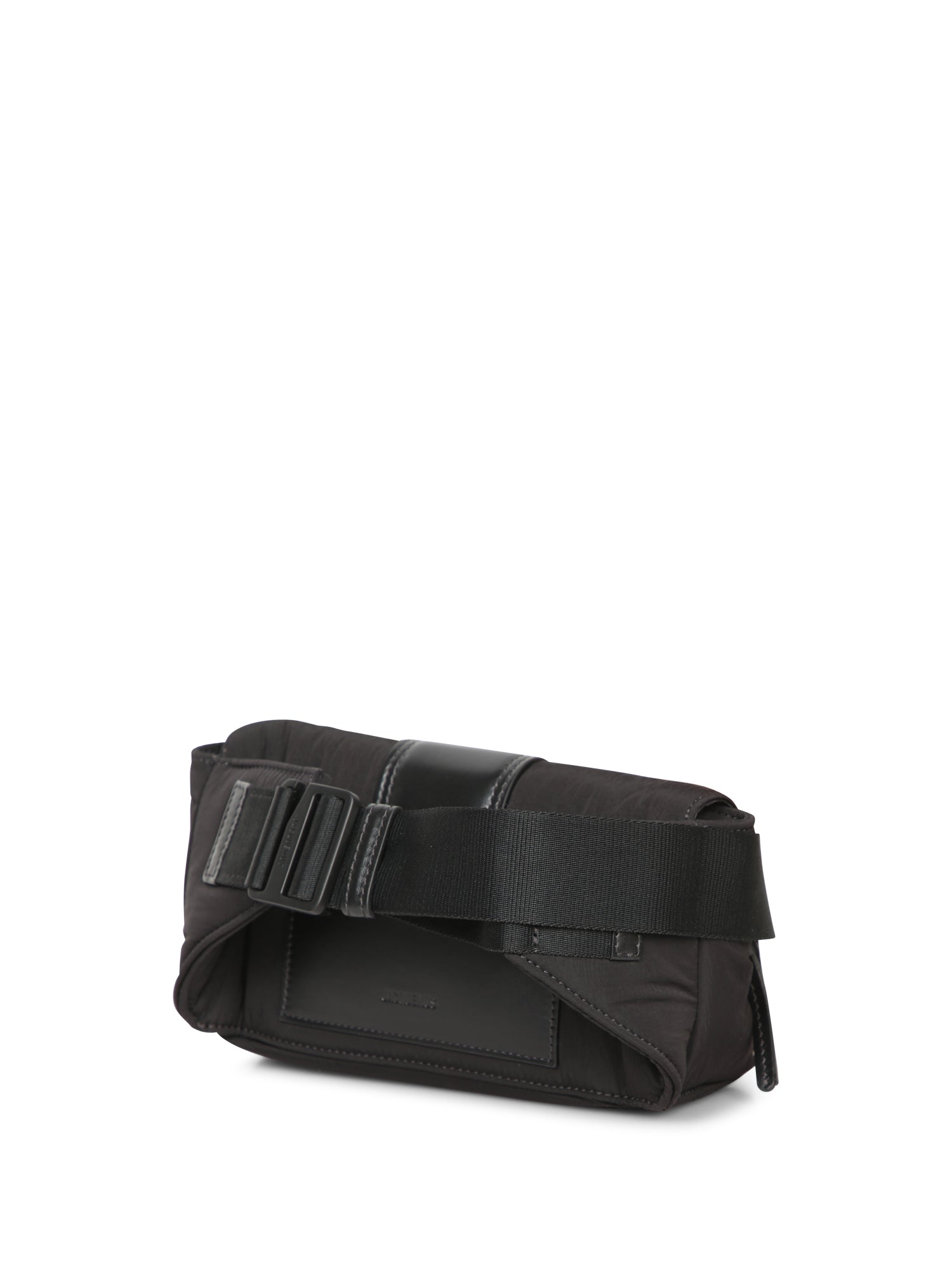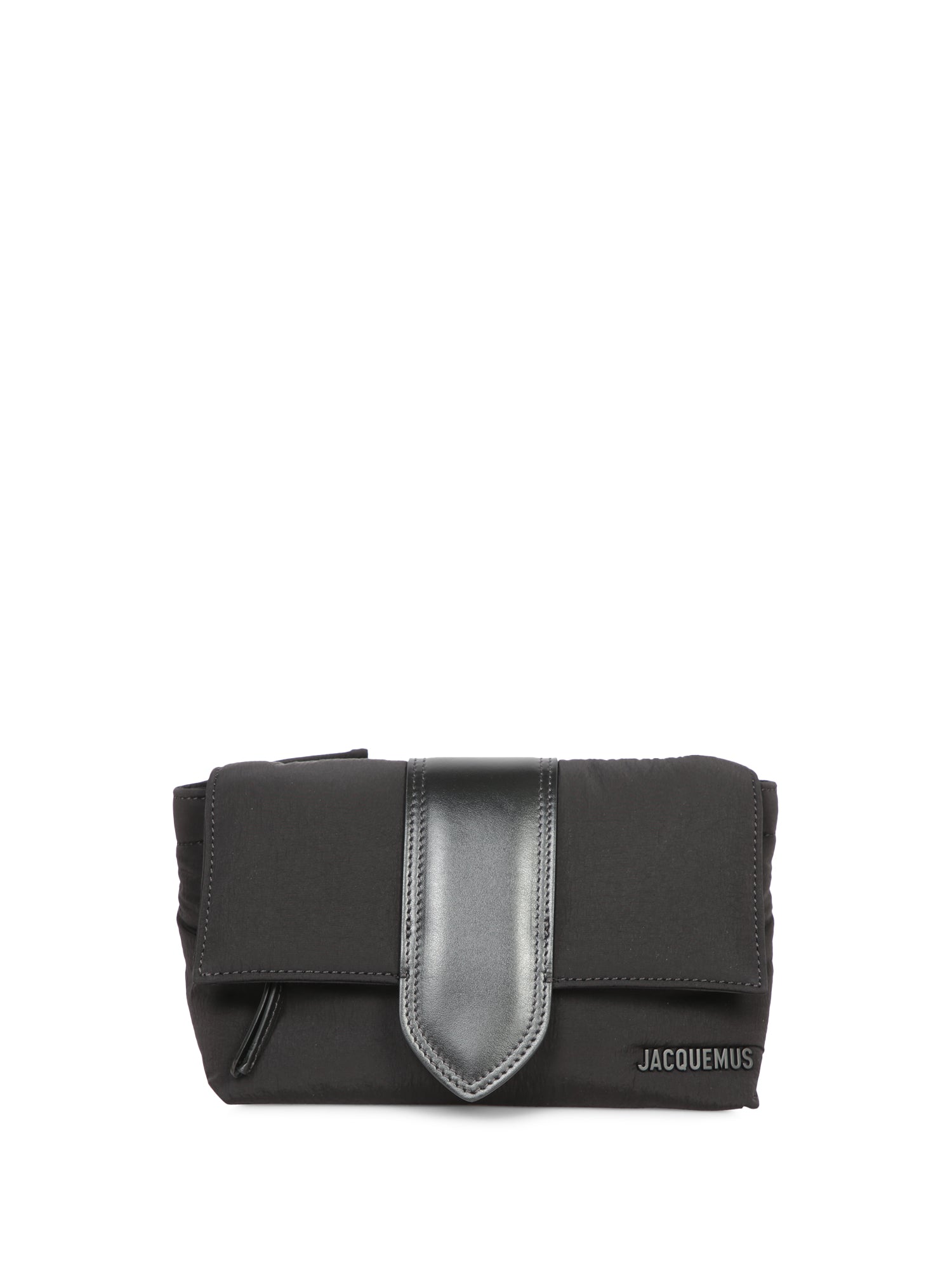 Black technical fabric belt bag with silver metallic leather detail. Zip closure and Jacquemus logo on the front.