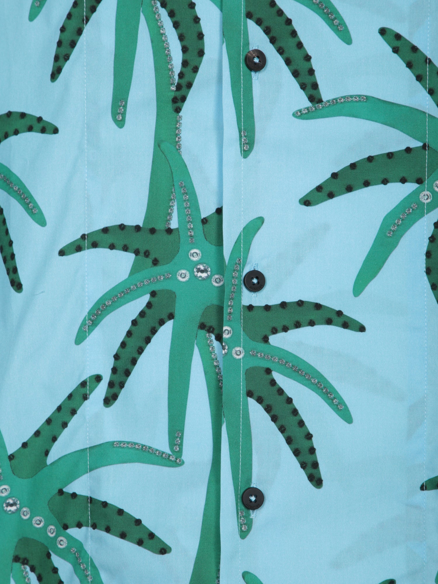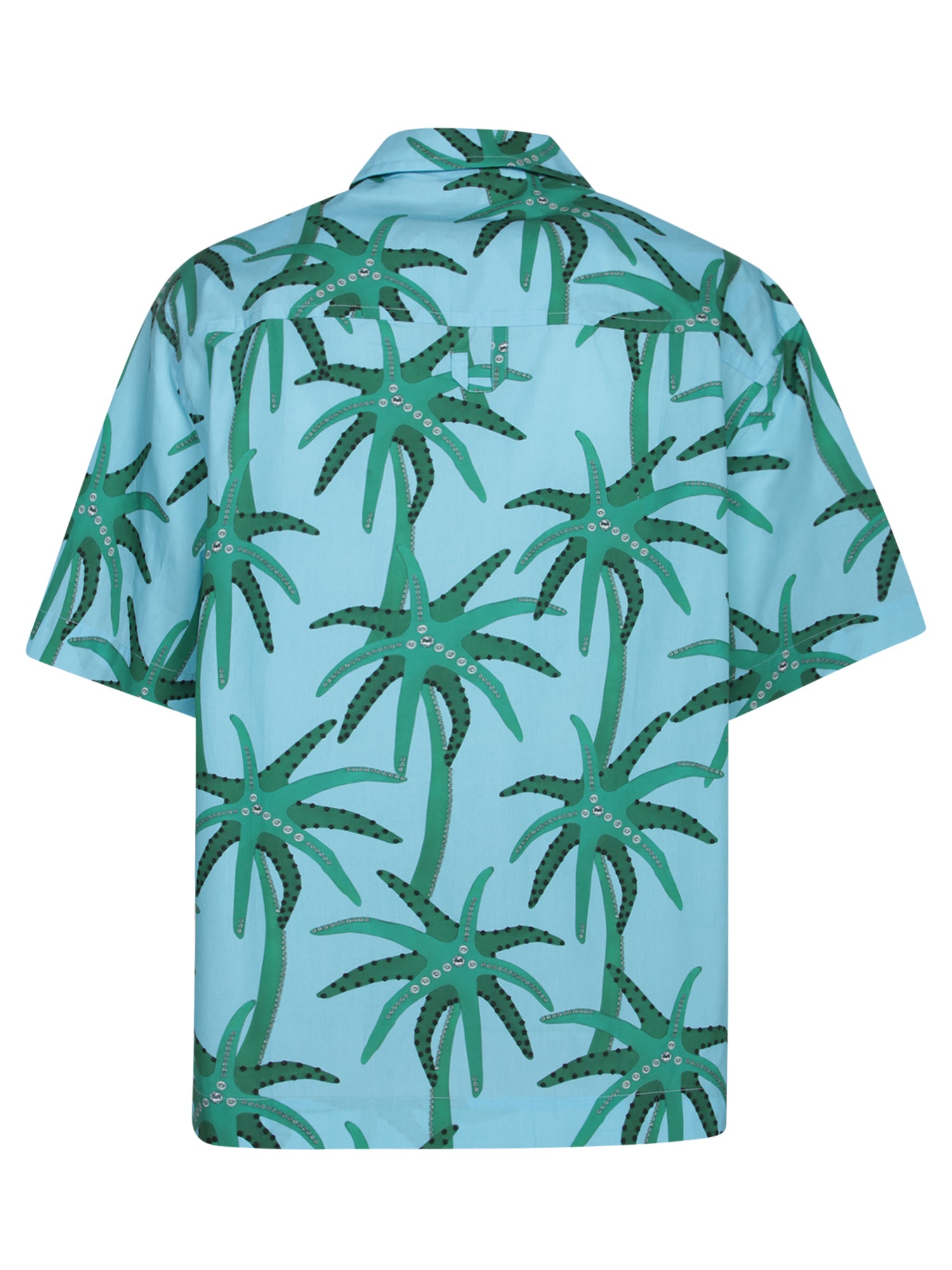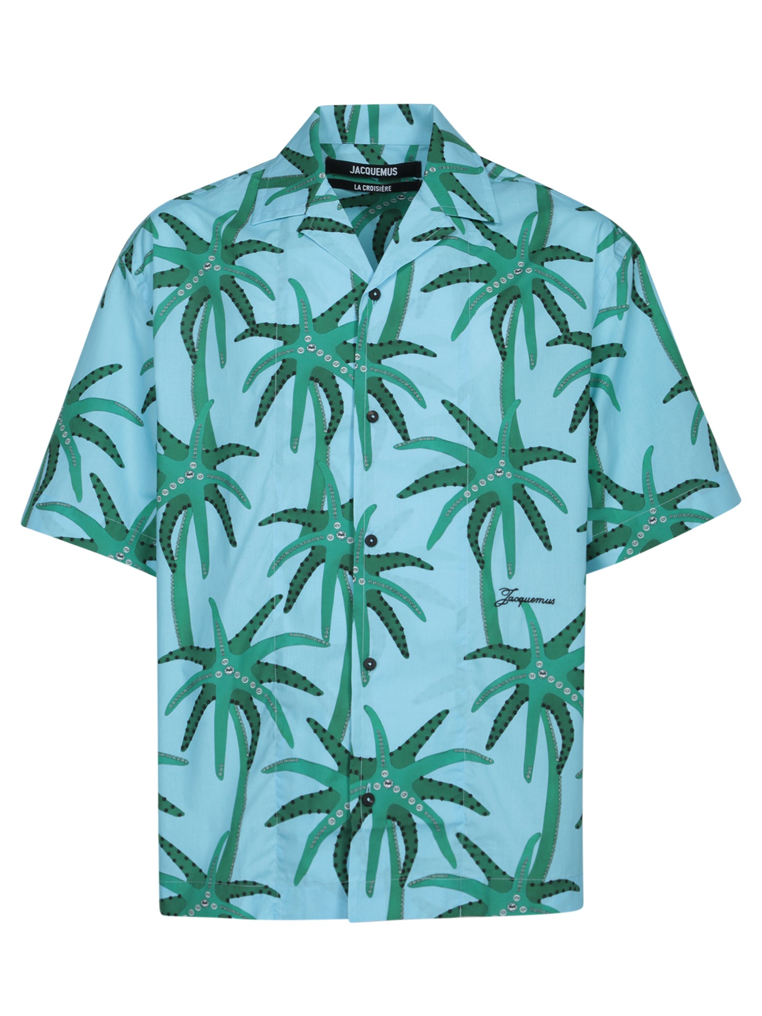 This exclusive Jacquemus shirt features a vibrant green palm print on an azure background, adding a fresh and original touch to your summer wardrobe.