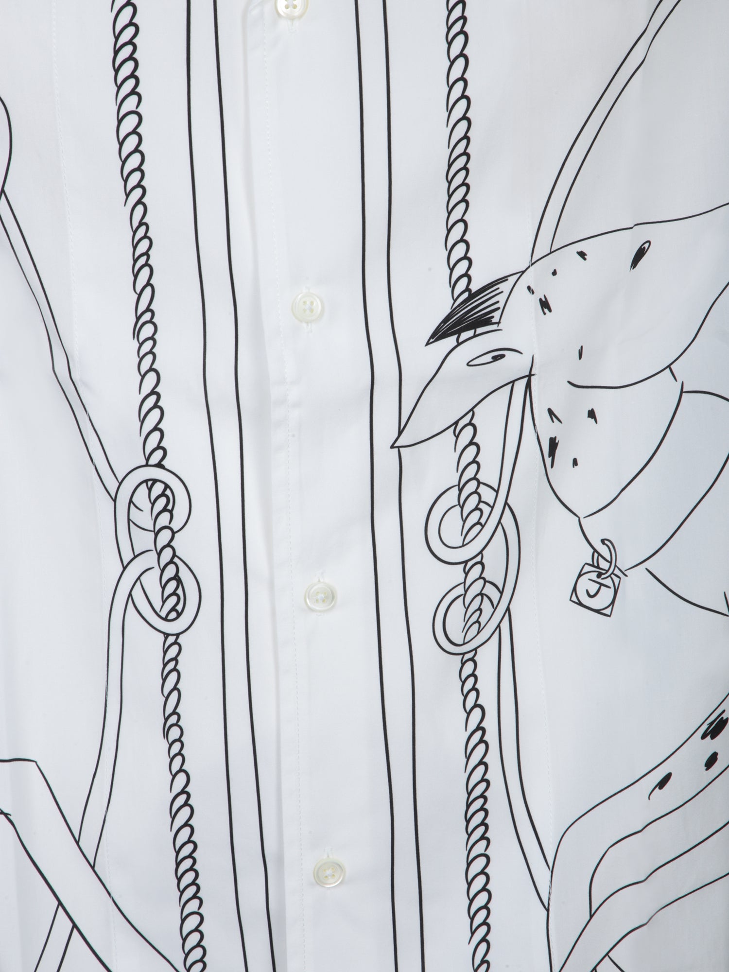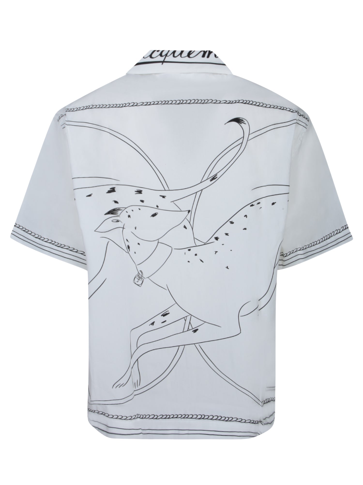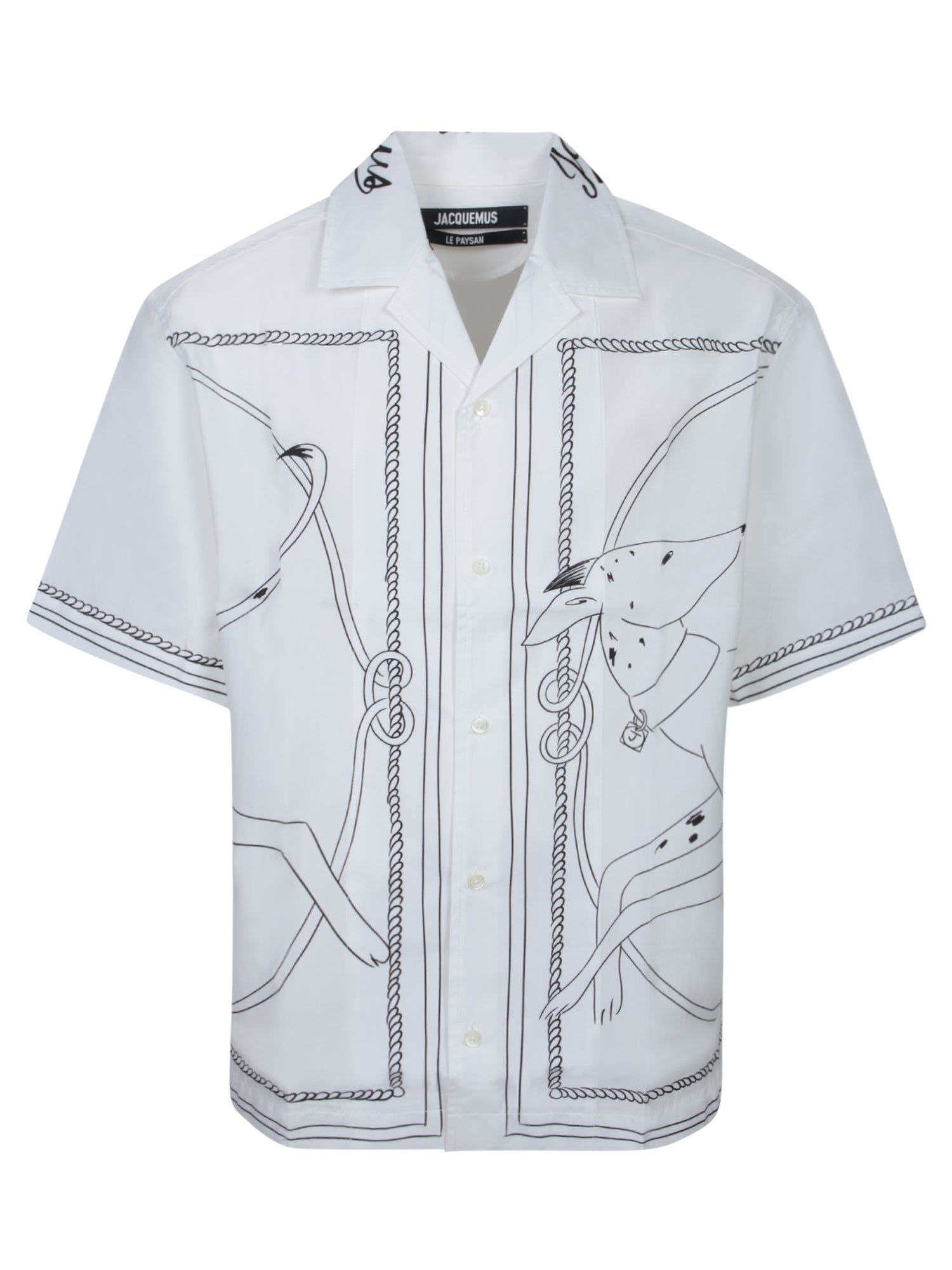 Short sleeve shirt with a classic collar, front button closure. Features an artistic interpretative print.