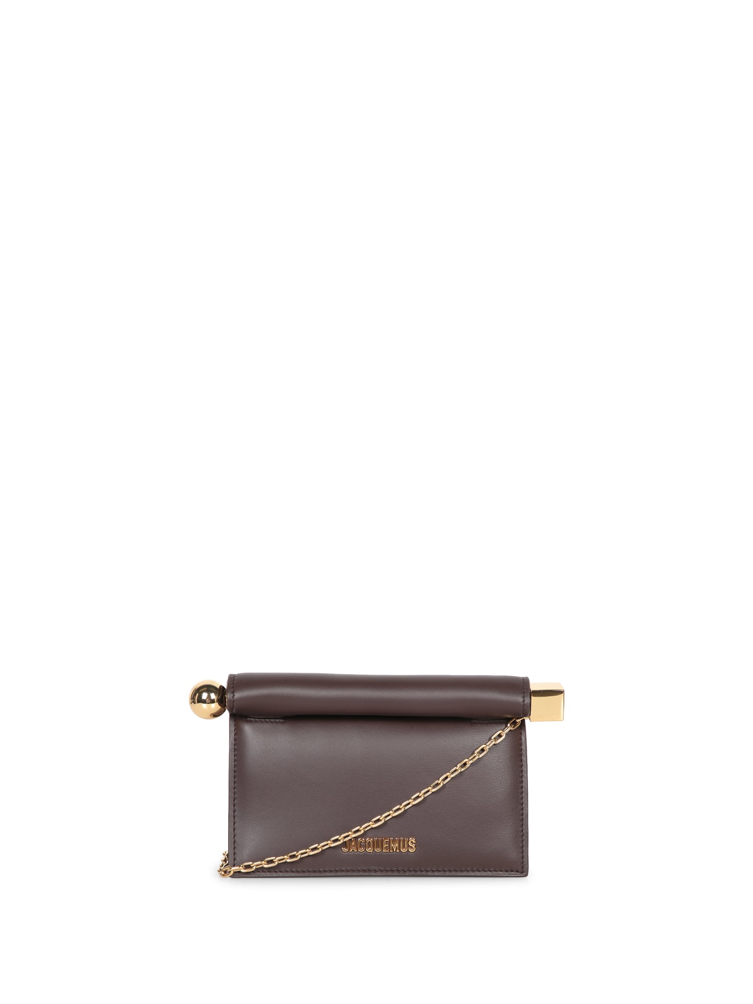 Brown leather bag with a golden metal chain. Top flap closure with a golden ball detail.