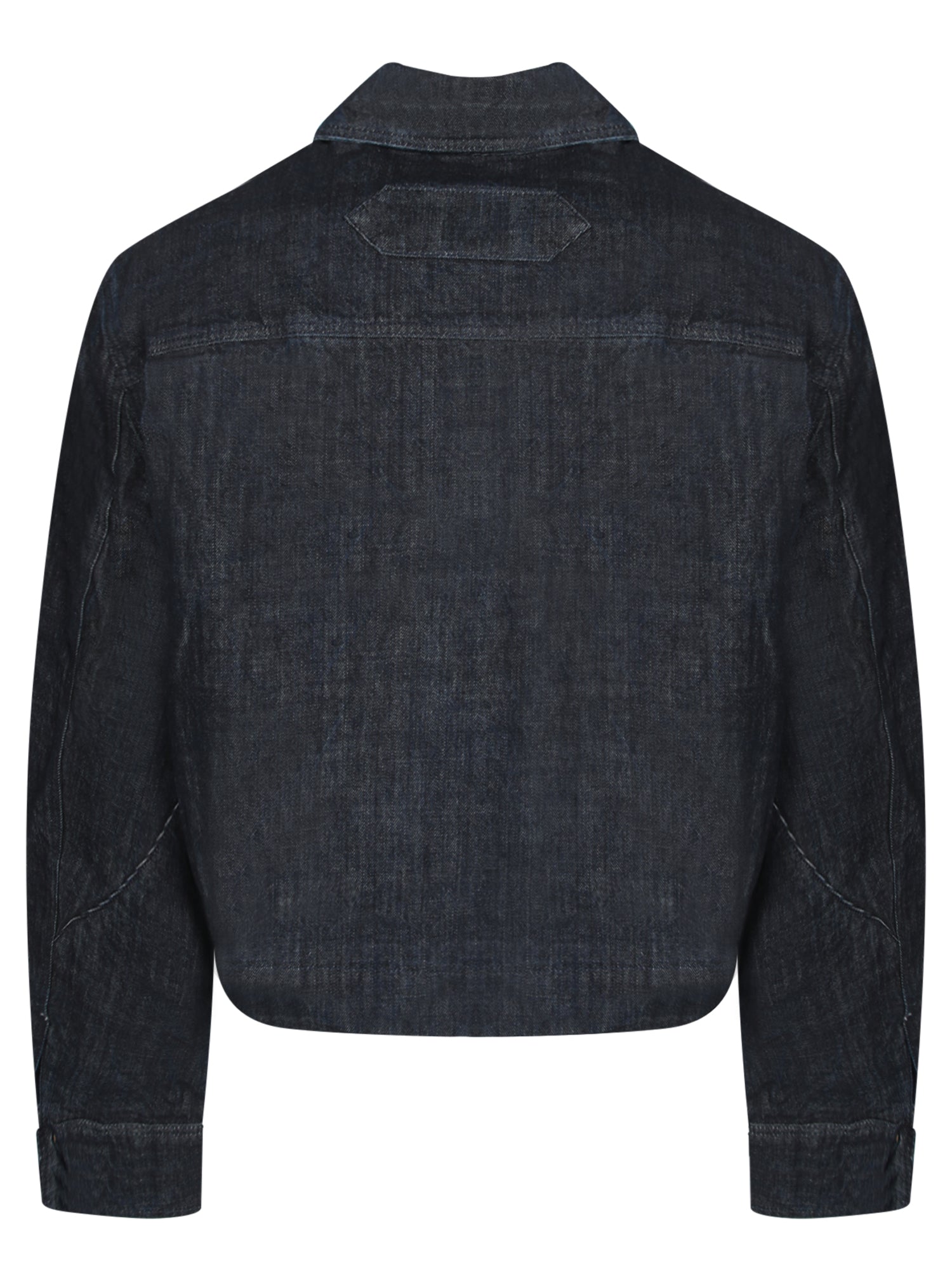 Denim jacket with front zip closure. Classic collar, long sleeves, and embroidered logo detail.