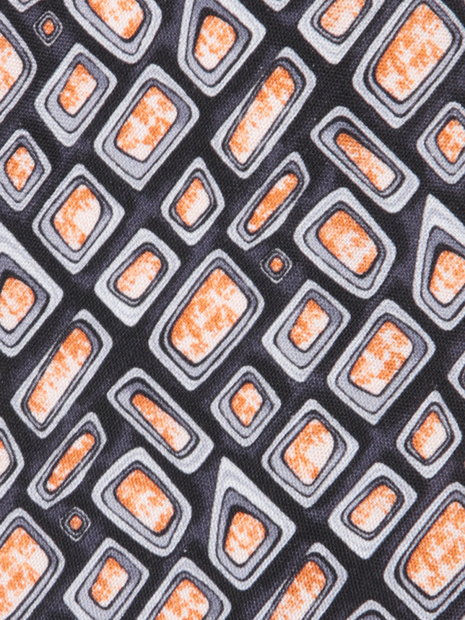 Silk tie with geometric print. 7 cm width. Blue and orange pattern.