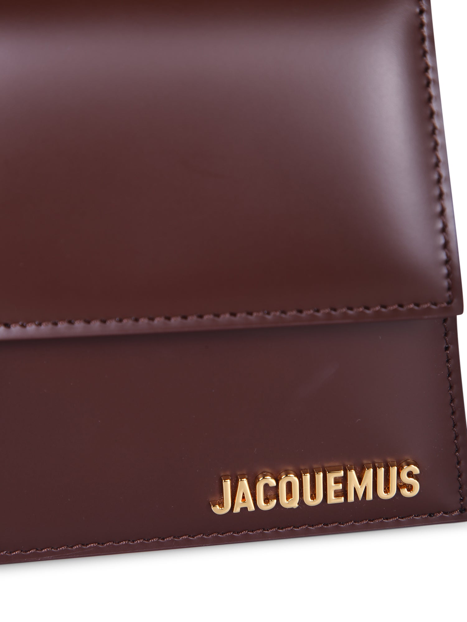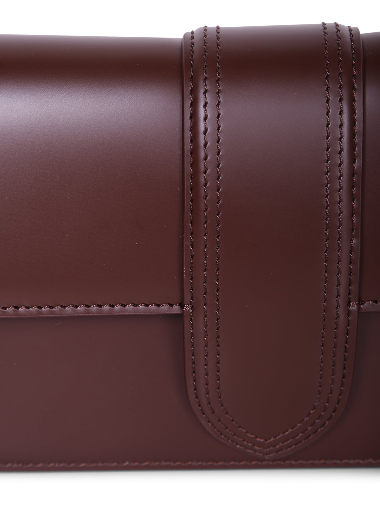 Structured leather bag. Lid closure with buckle. Long and thin shoulder strap.