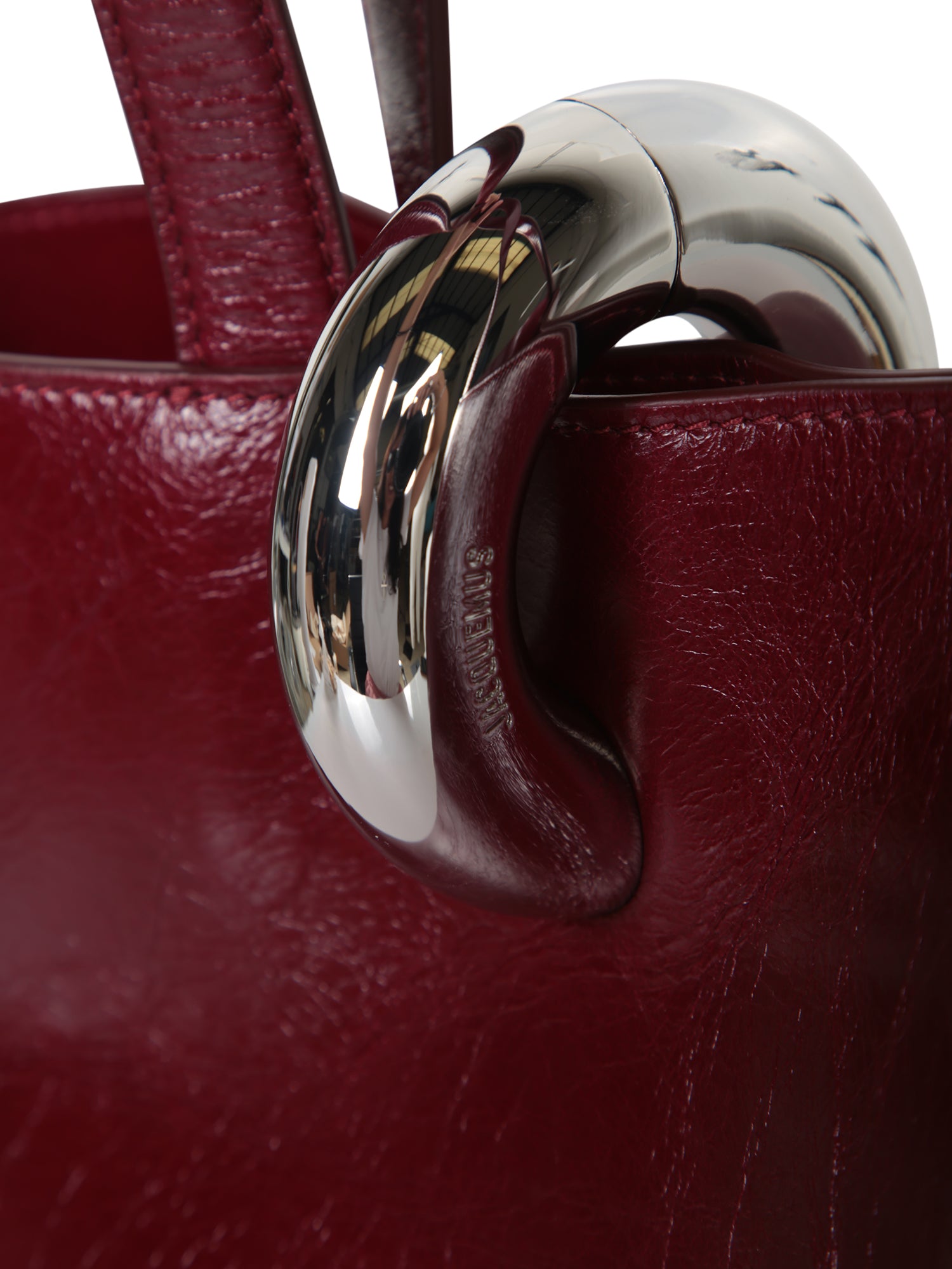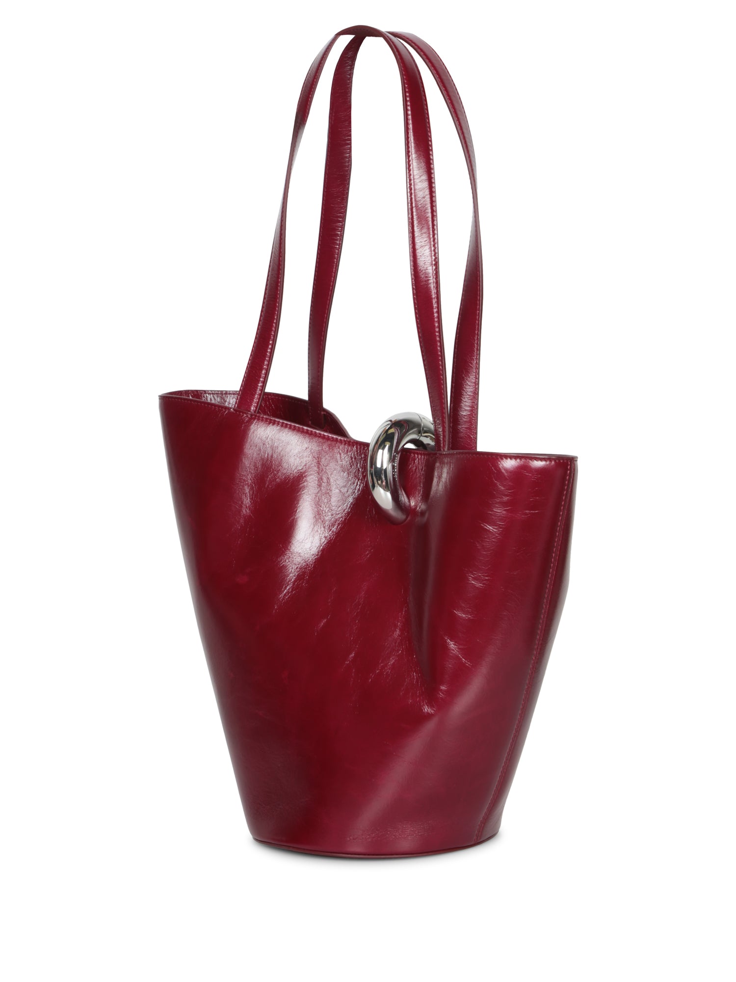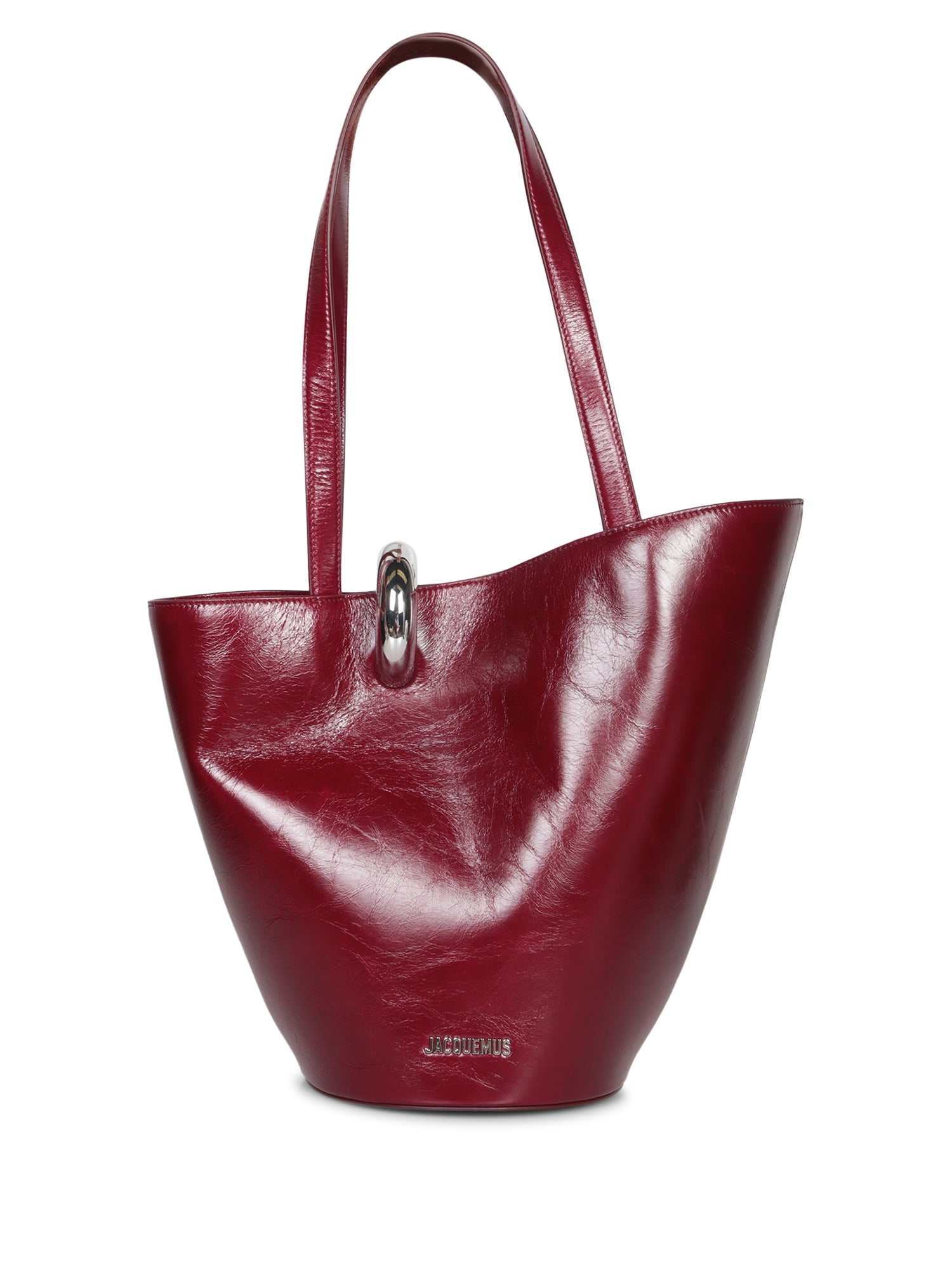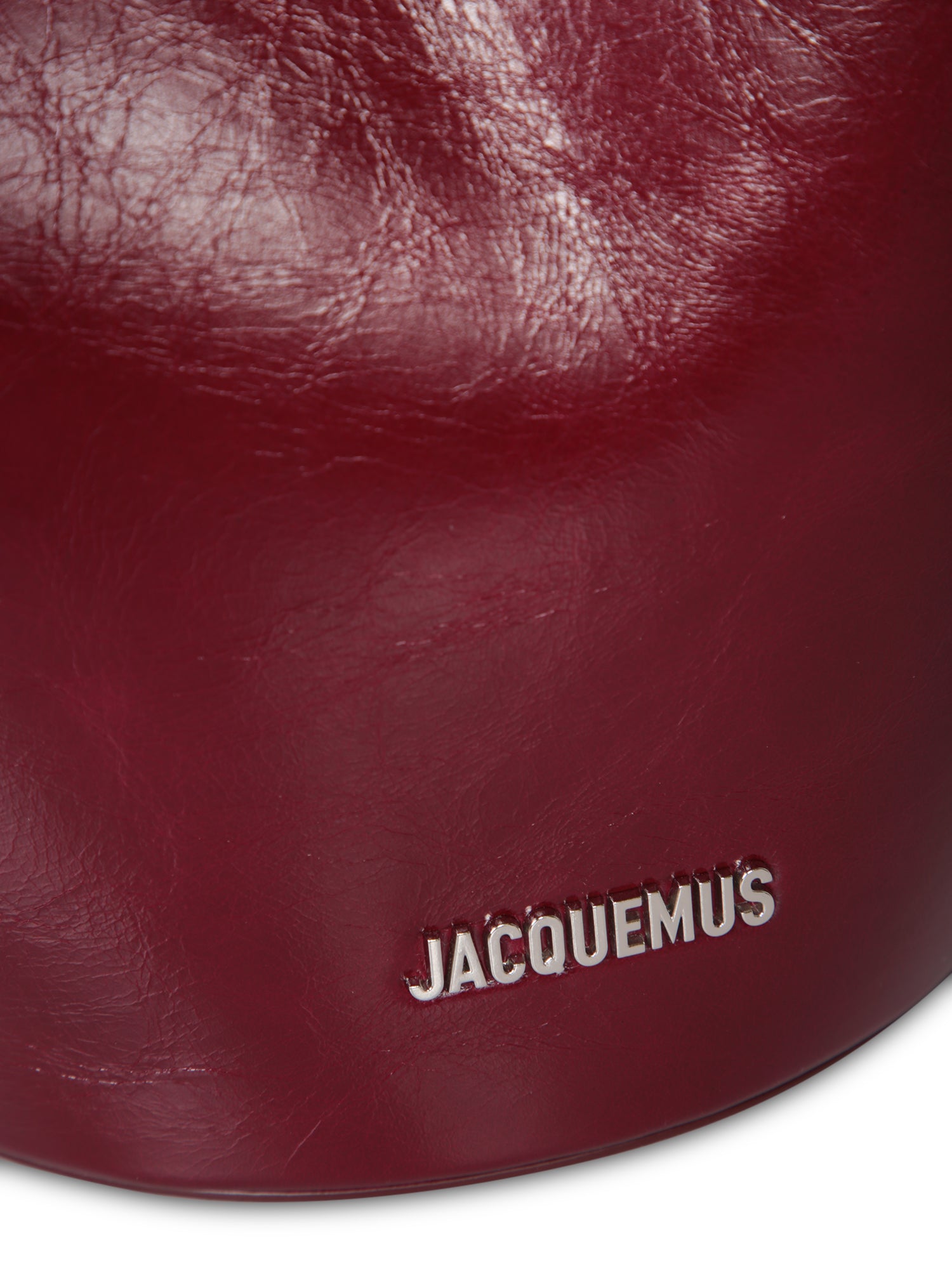 Crafted from premium leather. Bucket-shaped design with a single handle. Glossy burgundy finish.