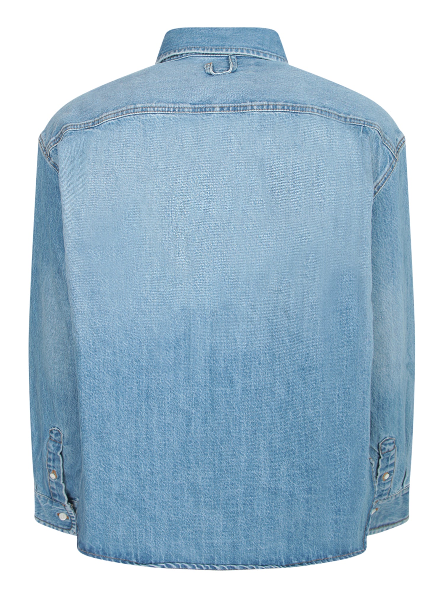 Light denim shirt, button front closure, pointed collar, long sleeves with buttoned cuffs.