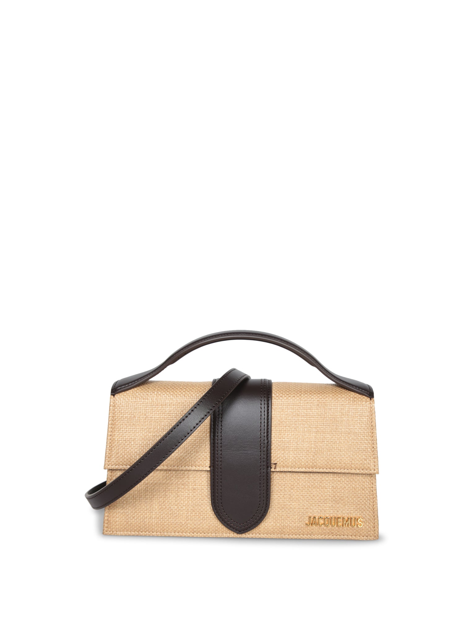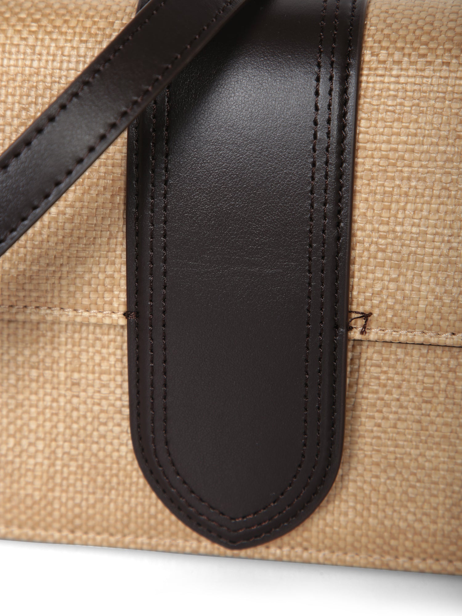 Elegant mix of fabric and leather. Adjustable and removable shoulder strap. Flap closure.