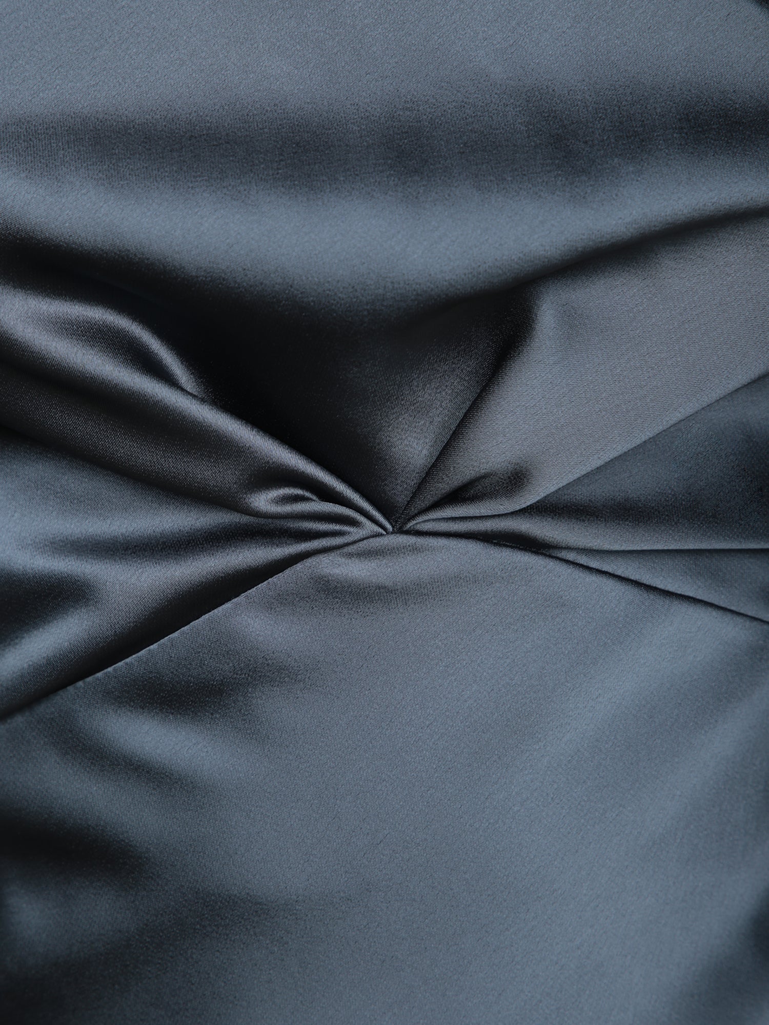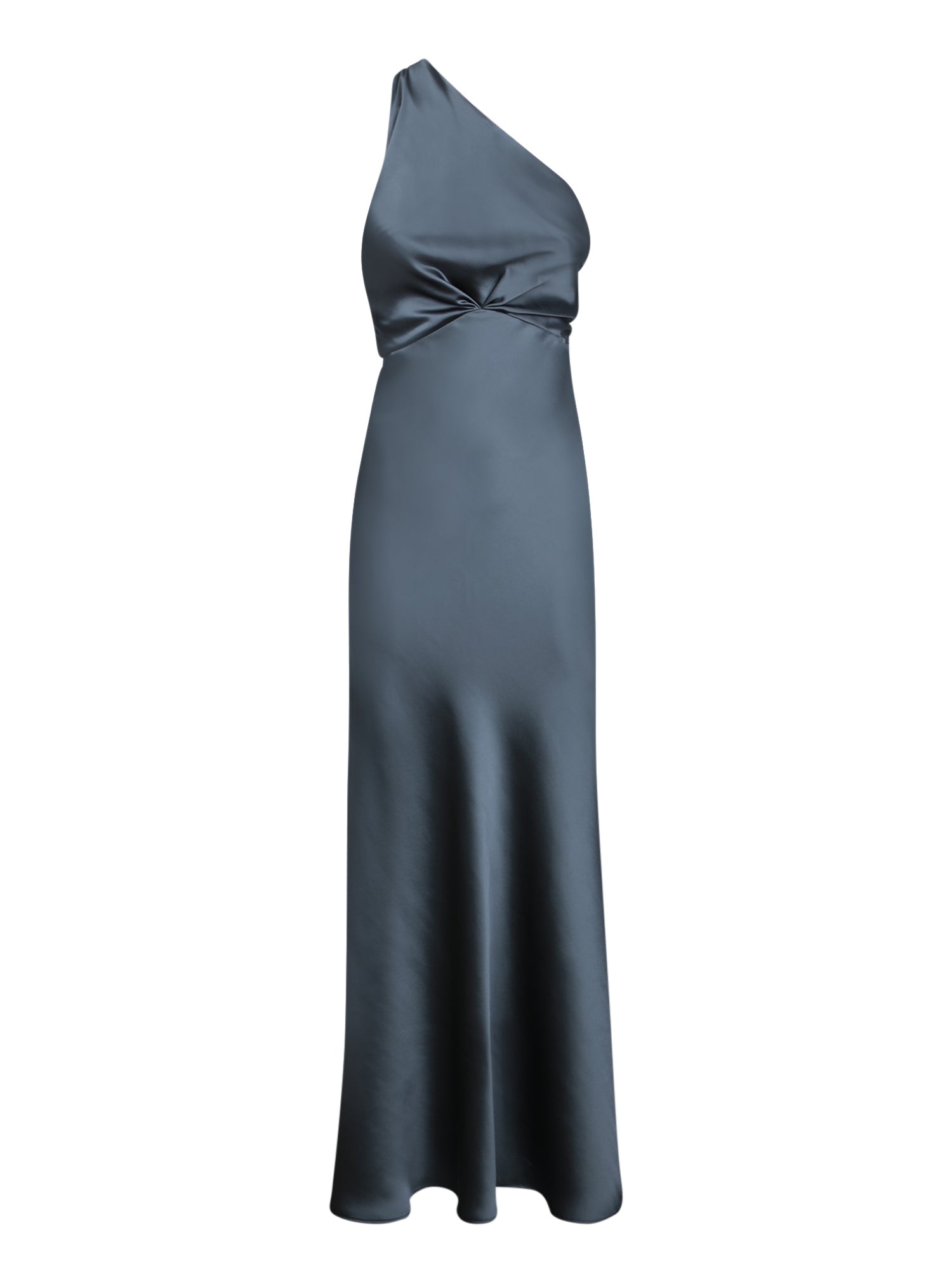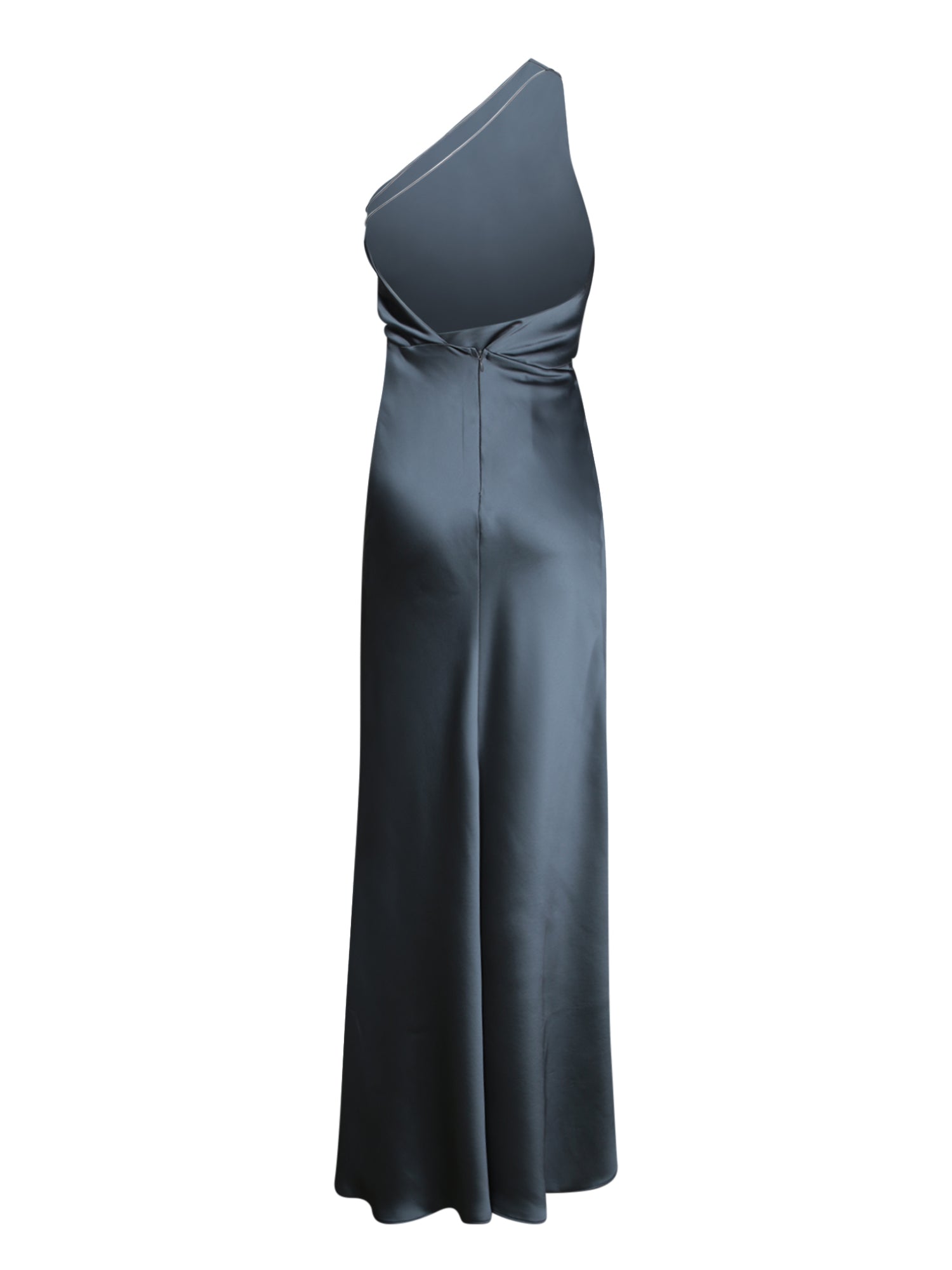 Long dress in satin fabric, featuring draped detailing and one-shoulder design.