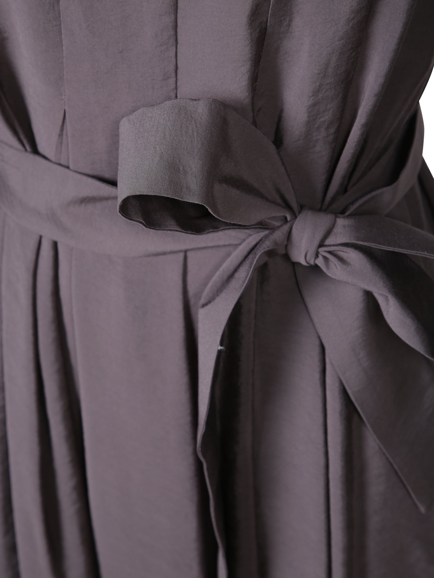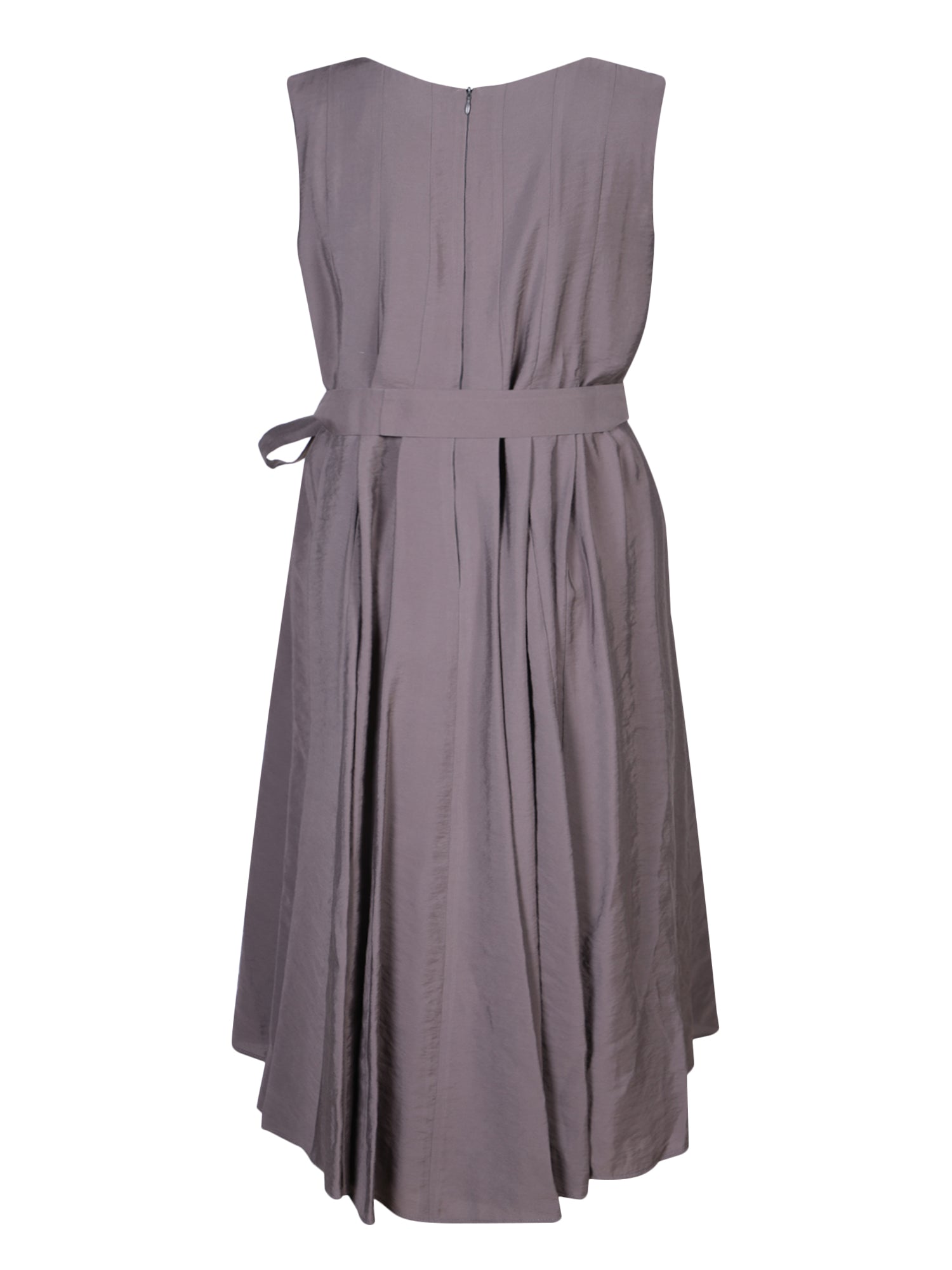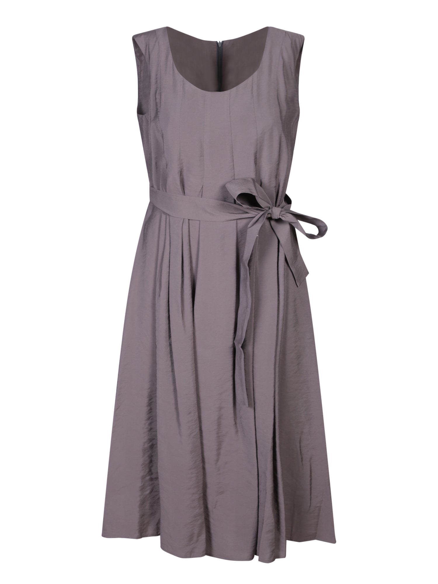 Sleeveless dress with a V-neckline. Matching fabric belt. Hidden back zipper closure.