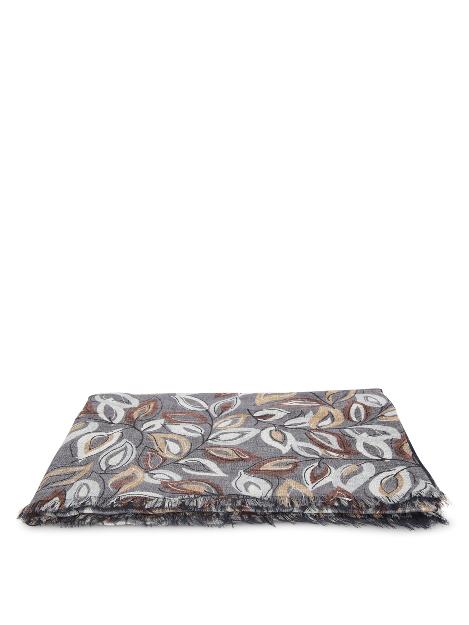 Wool scarf with leaf pattern print. Fringed edges. Dimensions 65x185 cm.