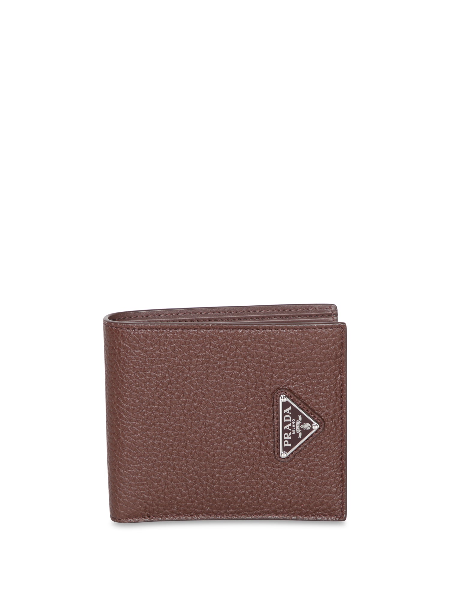 Textured leather wallet. Metallic PRADA logo on the front. Compact design.